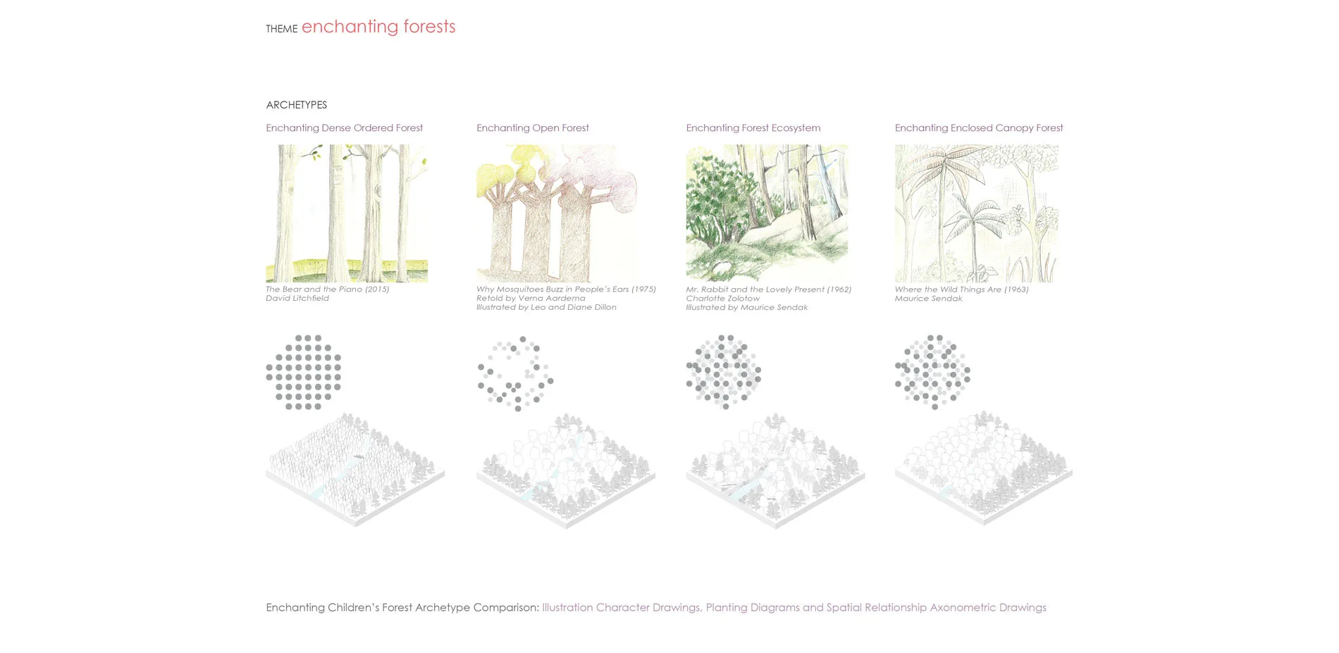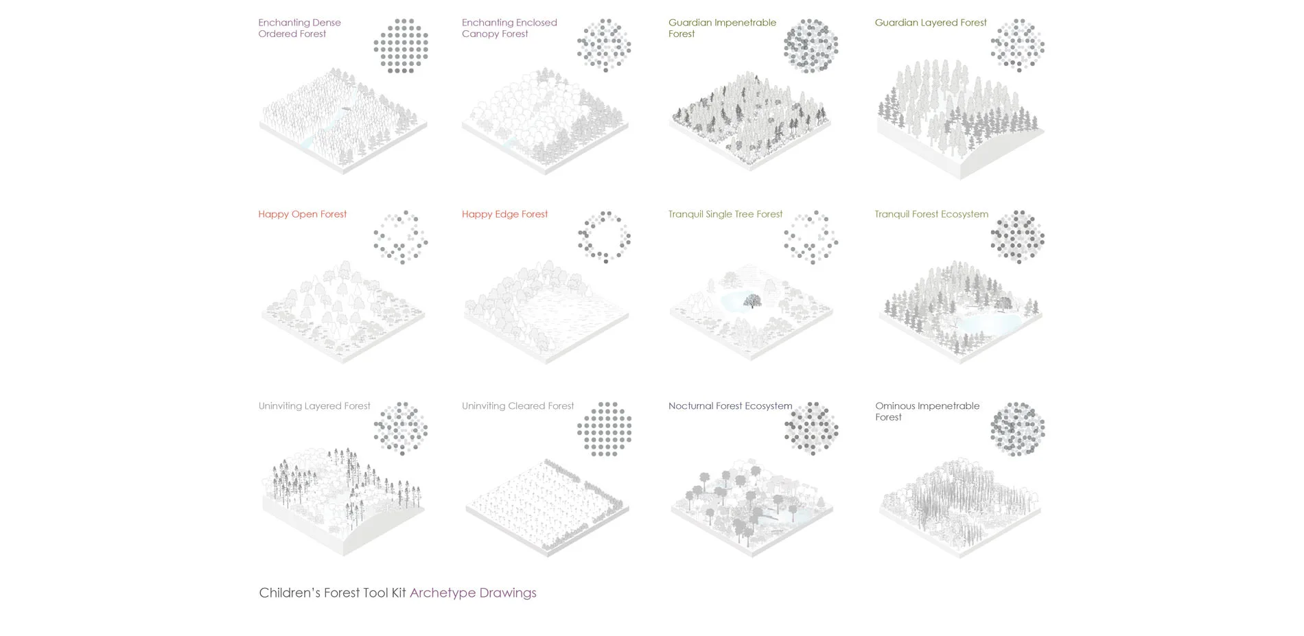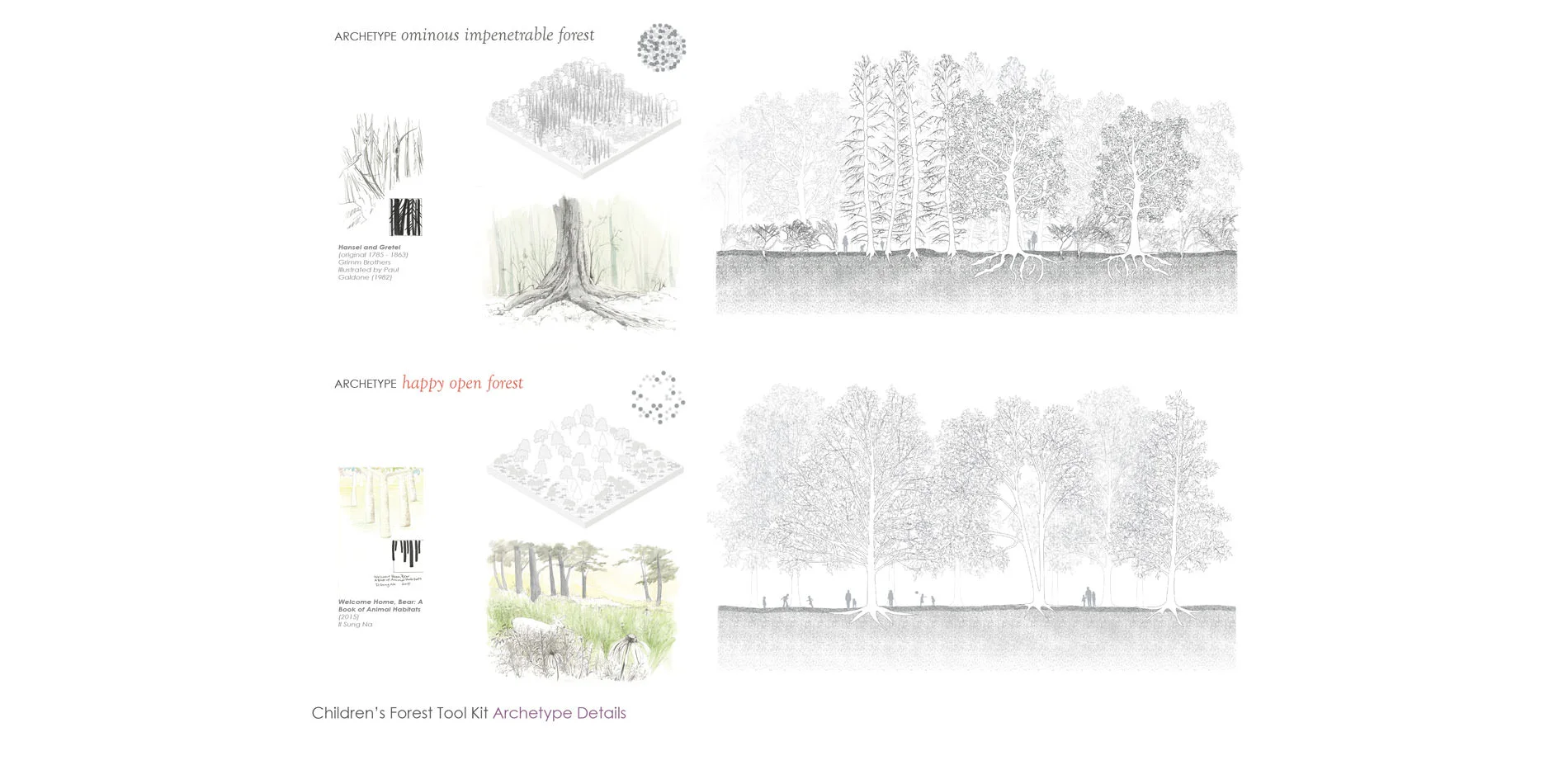 With the conclusion of this project, there are two avenues of interest that have great potential to be extended with further research. The first would be to collect experiential data from children who have interacted with a children’s forest. How do children anticipate a forest and what are their experiences while inside? How can this data integrate with story book analysis to create more engaging forest experiences? The second potential extension of this work is the recognition that forests experience slow succession, as well as short term ephemeral timelines. Forest archetypes have the potential to evolve as a forest grows older and seasons change. Furthermore, this project could significantly contribute to the expanding palette for Nature Play spaces and Children’s Outdoor Environments.