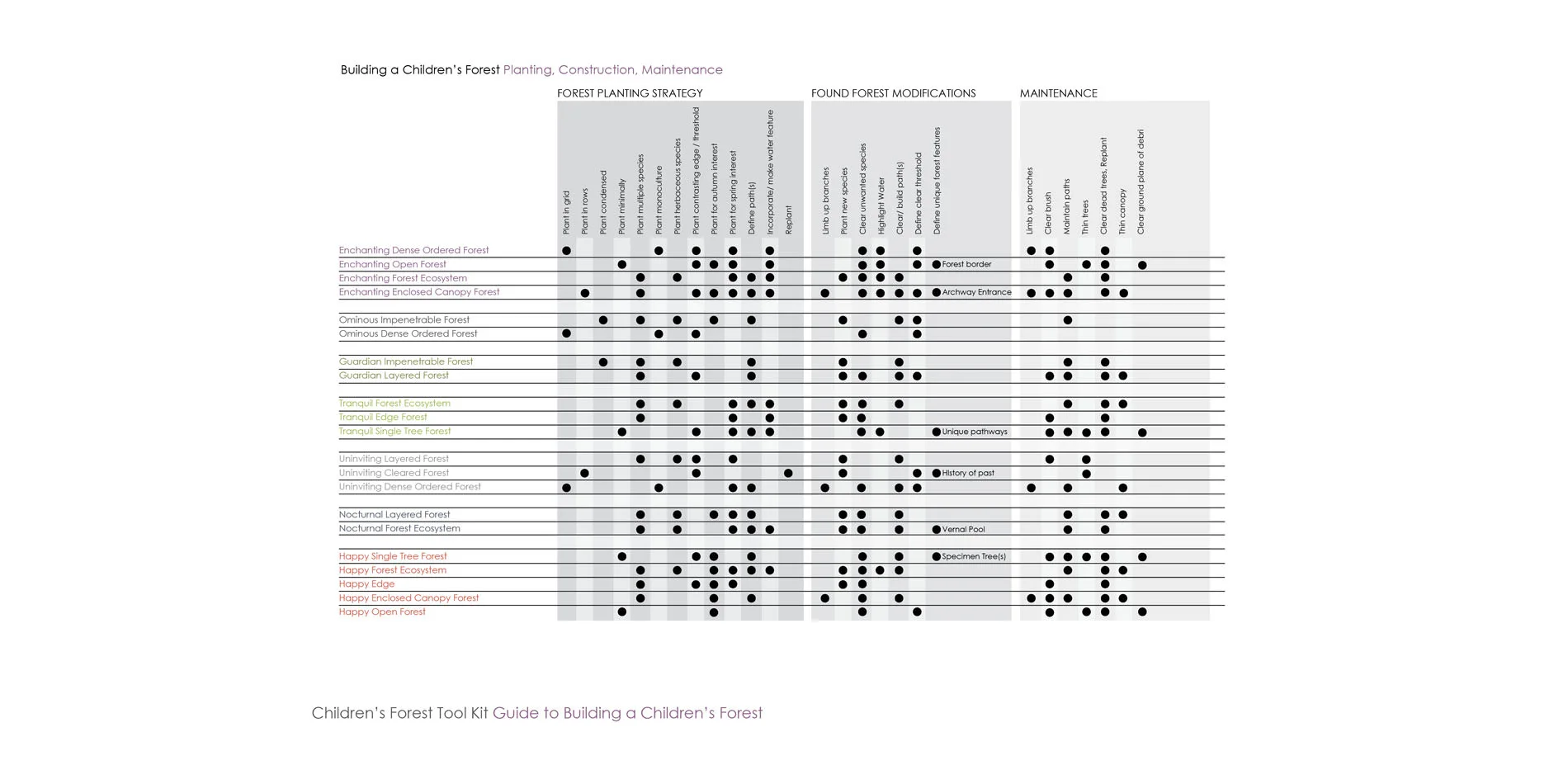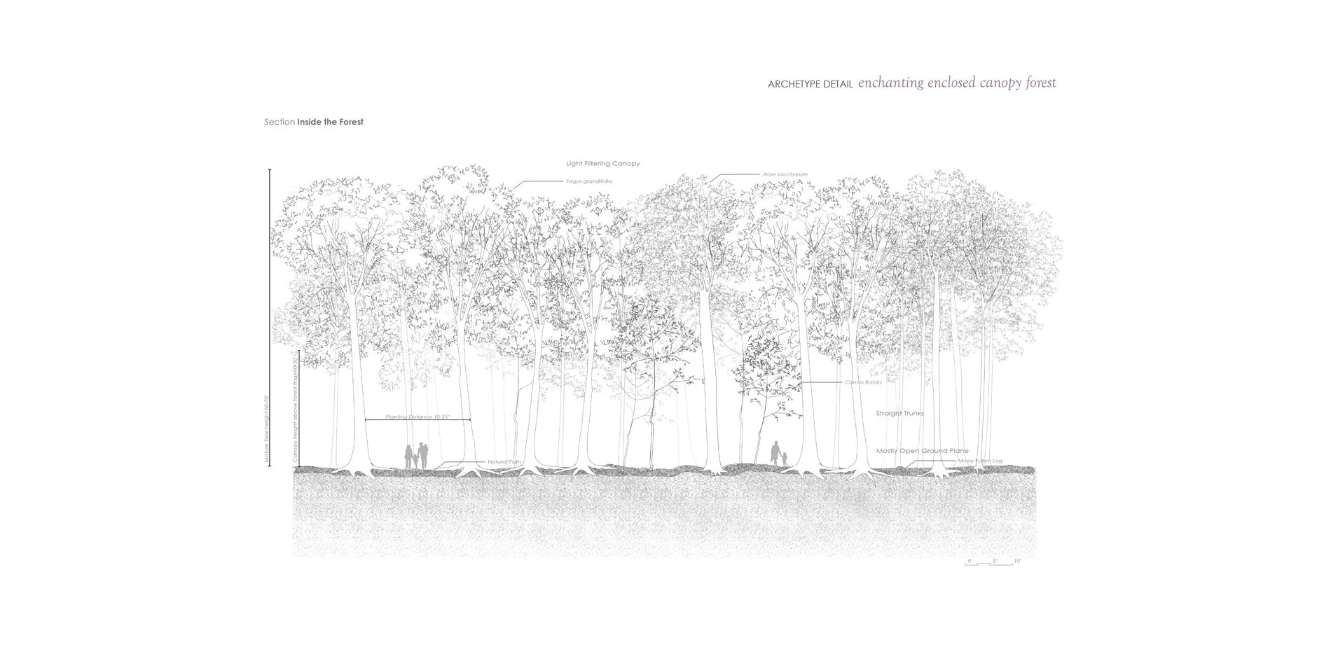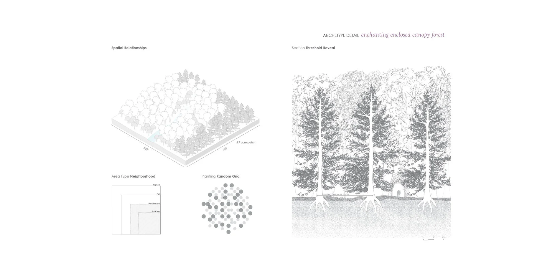 With the conclusion of this project, there are two avenues of interest that have great potential to be extended with further research. The first would be to collect experiential data from children who have interacted with a children’s forest. How do children anticipate a forest and what are their experiences while inside? How can this data integrate with story book analysis to create more engaging forest experiences? The second potential extension of this work is the recognition that forests experience slow succession, as well as short term ephemeral timelines. Forest archetypes have the potential to evolve as a forest grows older and seasons change. Furthermore, this project could significantly contribute to the expanding palette for Nature Play spaces and Children’s Outdoor Environments.