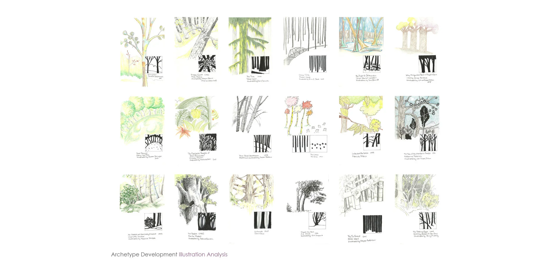 I classified collected information into three classification sets. The first used the text analysis to identify common roles of forest in children’s stories. The second set sorted the spatial diagrams according to tree density, positive/ negative space, tree organization, and tree relationships to other ecosystems. Finally, I classified the character qualities, looking specifically at forest personality.