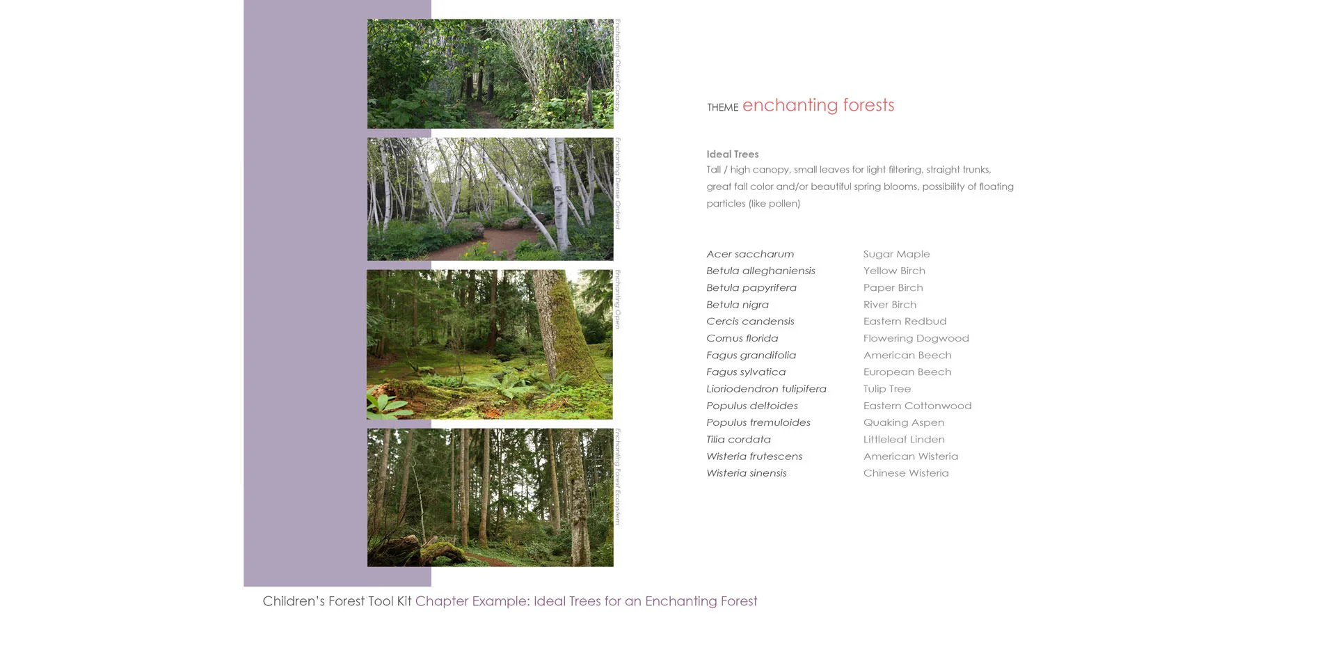 In “Exploring Woodland Design,” Roland Gustavsson describes the structure of woodlands and how these rich environments can be designed to appeal to all of the senses. He briefly touches on a relatively new concept, the adventurous woodland, which emphasizes the importance of “designing woodlands that support children, their development, their creativity and their play.”2 Fairy Tales to Forest is an exploration of that very concept, focusing on the experience of forest as depicted in children’s literature.