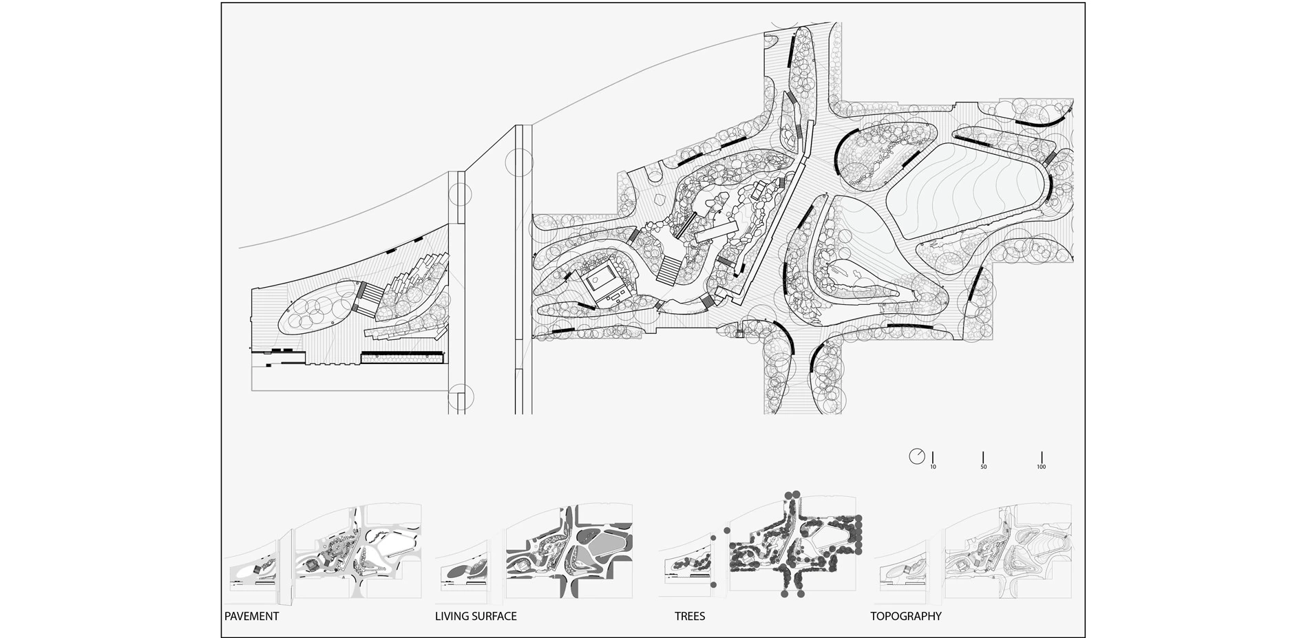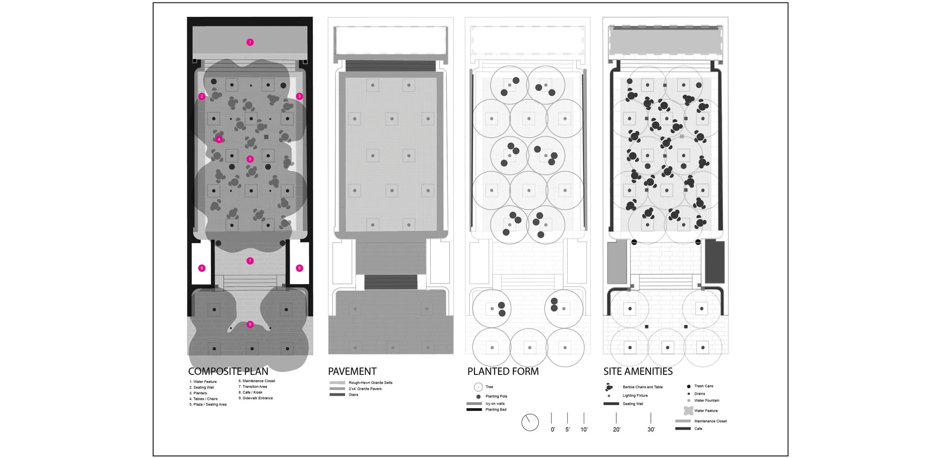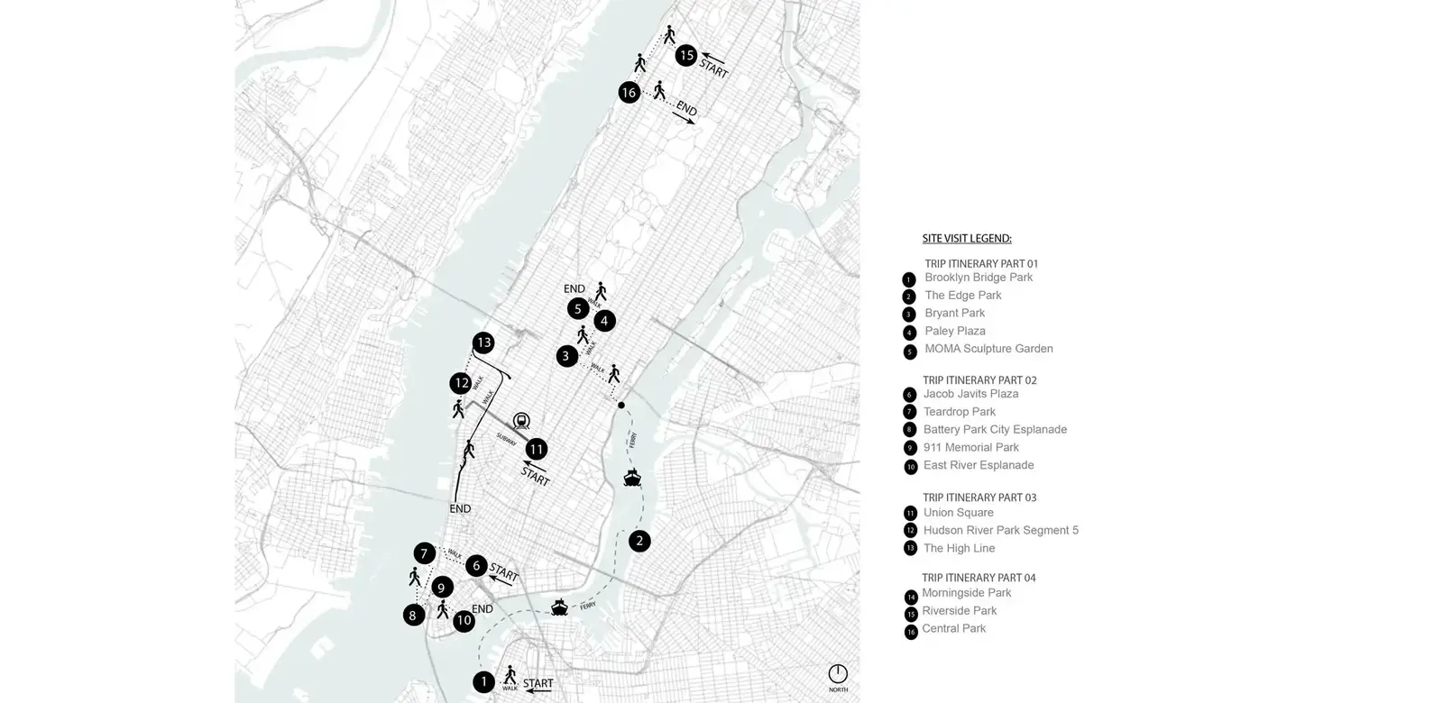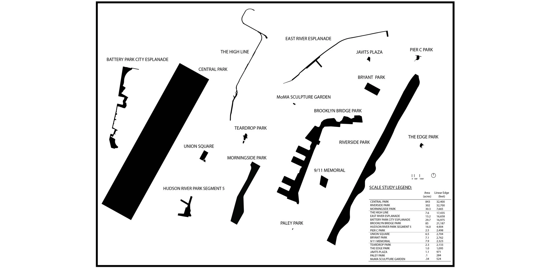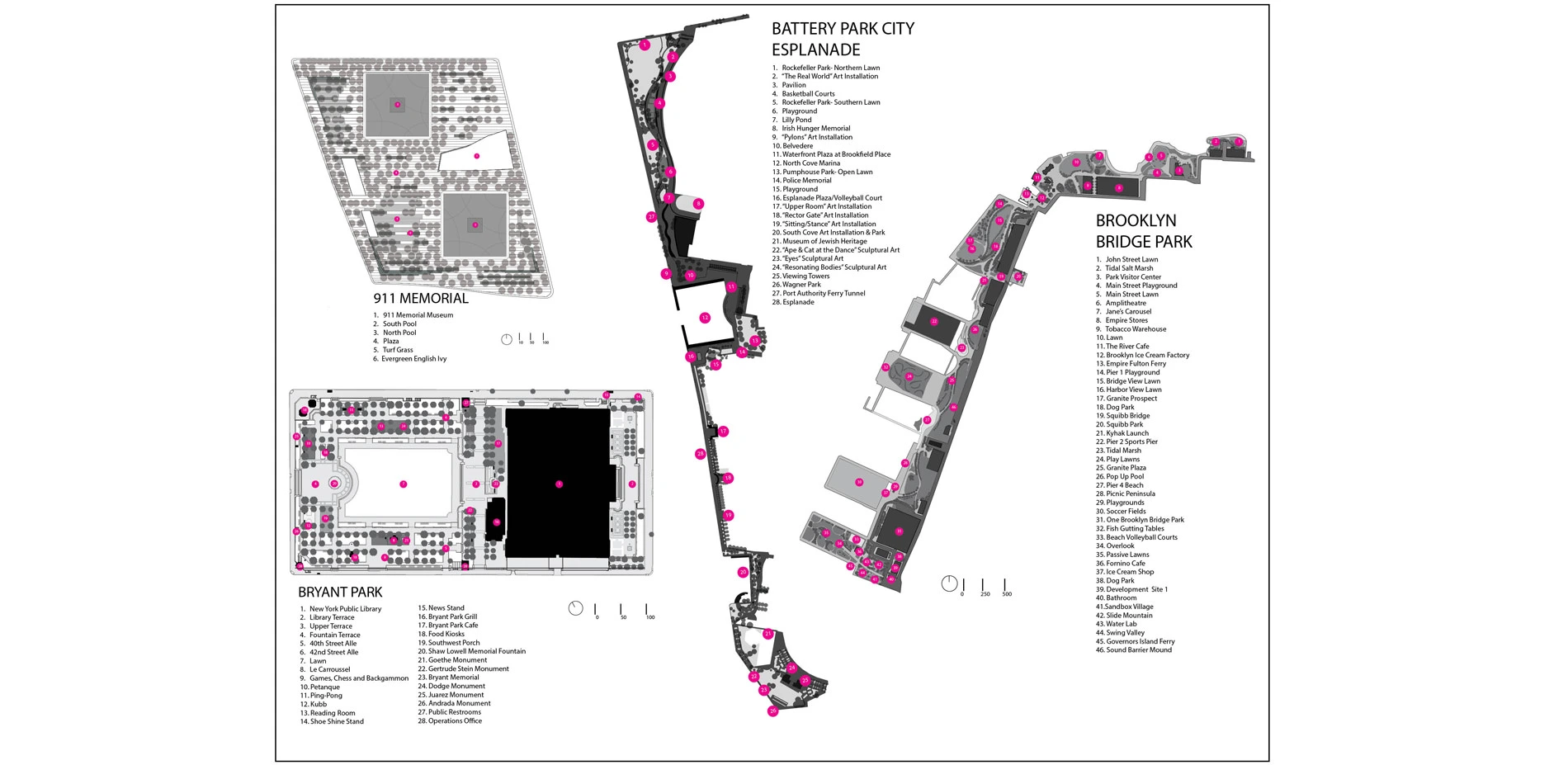 This work began with a list. From a selection of New York’s masterpiece urban landscape works, each of the sixteen students selected one site. This site then became the focus of a semester-long exploratory case study. The goal of the course, however, was not to simply understand and reiterate what was already known about these sites. Instead, the goal was to develop new knowledge and new ways of understanding the specifics of the sites. Through this process, each student built an intimate relationship with the physical, conceptual, experiential, programmatic, and social understanding of a selection of New York City’s public urban landscapes. From this relationship, abstract delineations of a site on a list become animated in both the history and the flows that shape a visitor’s daily experience of place.
