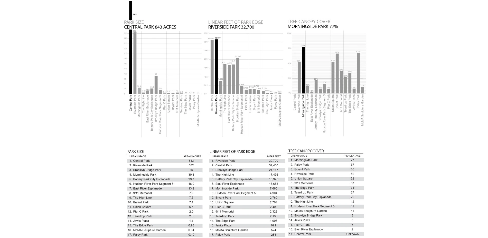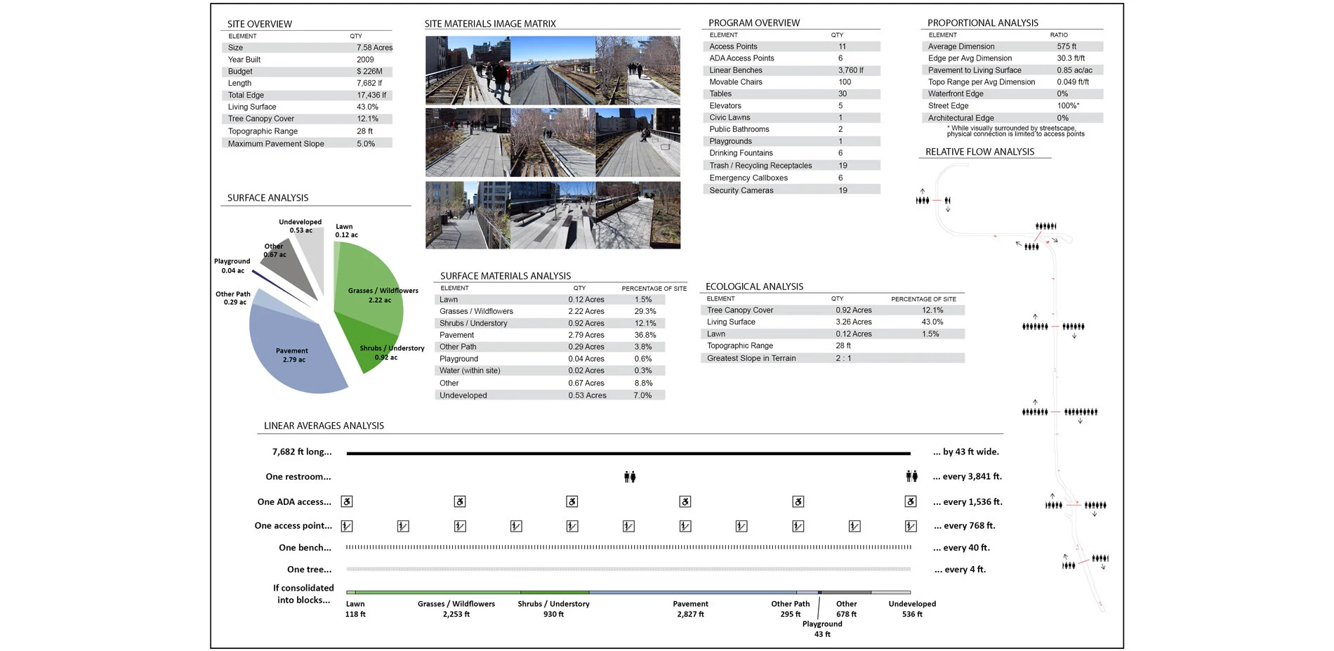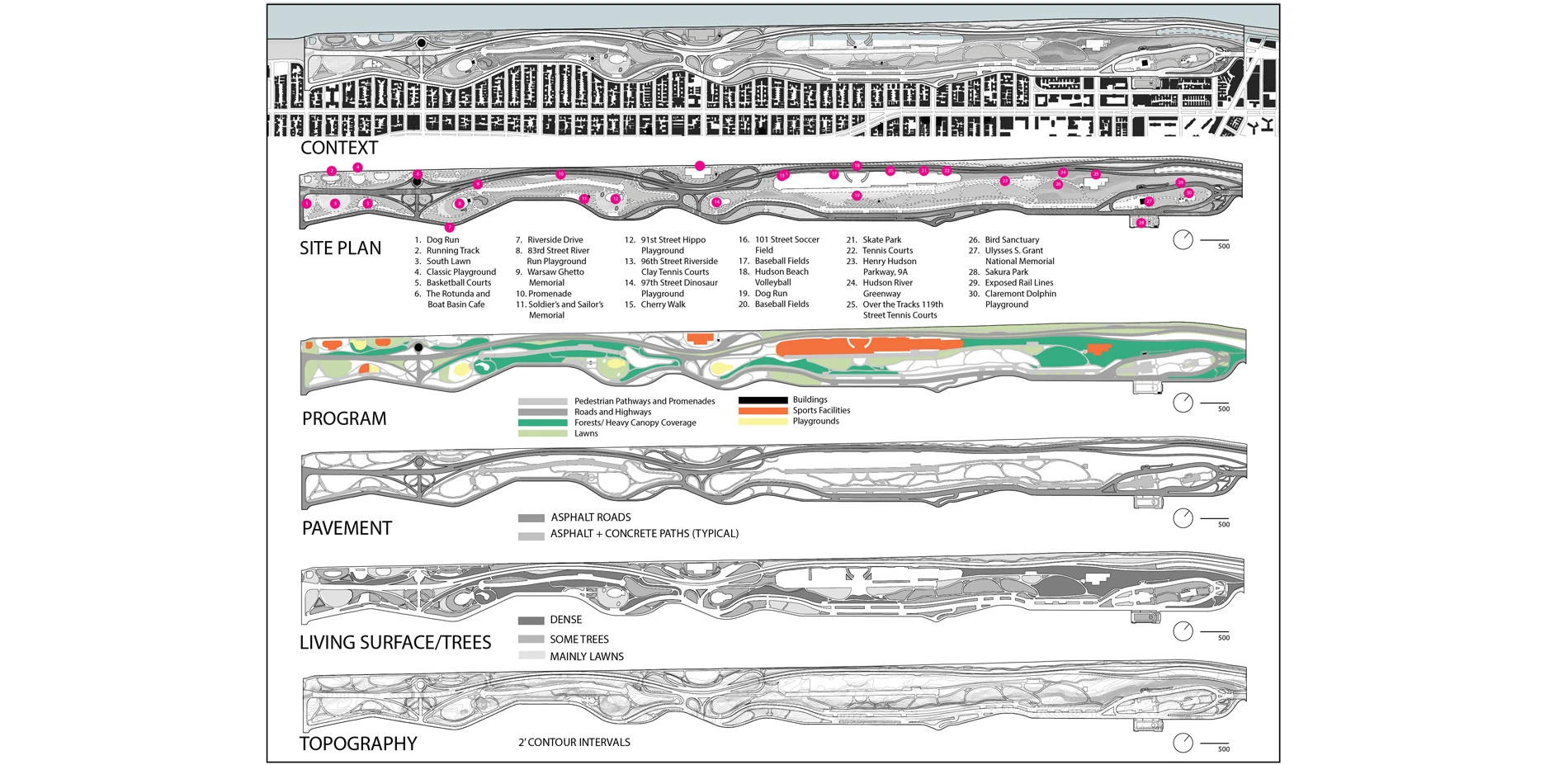 The primary intent with this class was to give students an in-depth familiarity with a New York City park, in order to better understand them as a complex, functional urban space. The secondary goal was to generate a preliminary database of high-performance parks, such that they could be a model for future designs. The sites selected are some of most heavily visited parks in the world, their evolution through time represents a process of optimization and refinement that is truly unique and infinitely valuable. The application of objective analysis to urban parks is a relatively novel concept. Use of previous projects as design precedent is commonplace within this profession, but it was only through a process of taking metrics from digital drafting and analysis that students discovered how rare objective metrics truly are and the importance of line work in understanding a design. Even simple things, like quality site plans, were found to be nearly nonexistent for some parks, challenging students to manually recreate them from aerial photographs, GIS parcel data, and firsthand onsite measurements.
