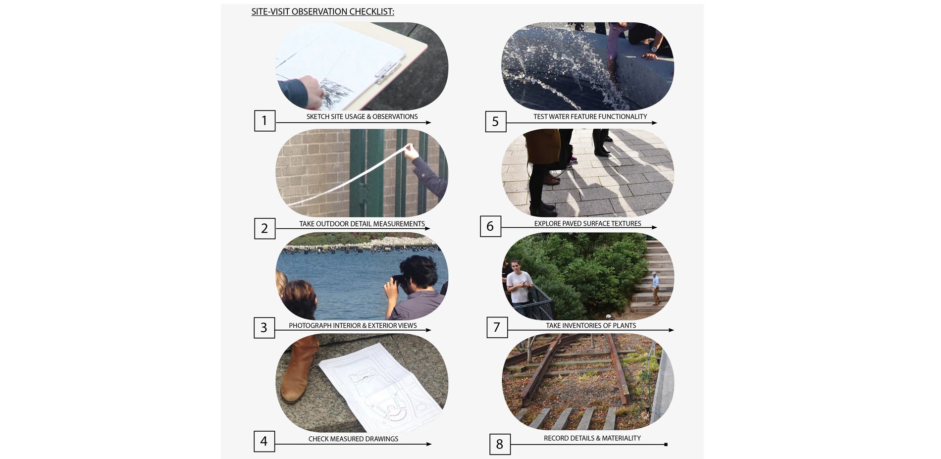 Overall, pairing on-site studies with intensive digital techniques served as a new approach to the typical site visit and field trip. Drafting precise drawings digitally was utilized as a means to study existing sites with a particular emphasis on the importance of design expression. The class reimagined the way site inventory, analysis and the field trip are currently taught. The book aspires to inspire students in other cities to take on a similar approach to not only learning about the importance of parks in cities today, but as a means of improving and building their representation skills. On the ground, this work and the techniques in visual communication explored provided students a means to measure details, better understand materials and context, and experience topography. The site visit was extended over the course of the semester by an iterative approach to the study of existing sites through digital drawing in a way much like students used to draw and learn by observation by hand. This work seeks to inspire students of landscape architecture and allied disciplines to get to know one park intimately in its scale, proportions, use, materiality, and dimensions that they may improve designs for the future by learning from those of the past.
