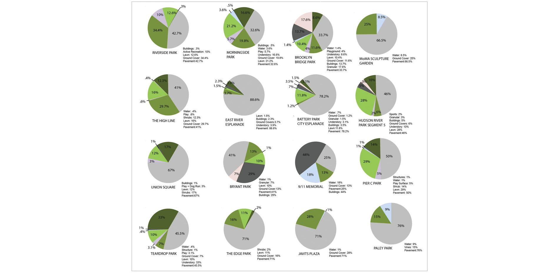 This project explores 16 urban parks in New York City through drawing, historical research, site reconnaissance, and comparative analysis as part of a design class seminar organized into three parts; Research and Contextualize, Draw and Analyze, and Curate and Disseminate. The purpose was to reimagine ways of studying urban landscapes as an extended field trip including virtual and physical site explorations. Over 520 acres were researched in one semester producing over 250 student-created digital drawings and diagrams and the collection and creation of the course book, "NYC Urban Landscape Metrics". Findings were compiled through comparative analysis as a means to visualize and explore performance-based landscape metrics for each urban park studied including quantitative data, proportional relationships, and per acre landscape density data. A particular focus was paid to the interrelationship between scale, materiality, and proportion and how such issues shape landscape performance and programmatic range. The products of this research and findings were compiled in a 170 page self-published book to serve as a design resource to future students at the University level and beyond.