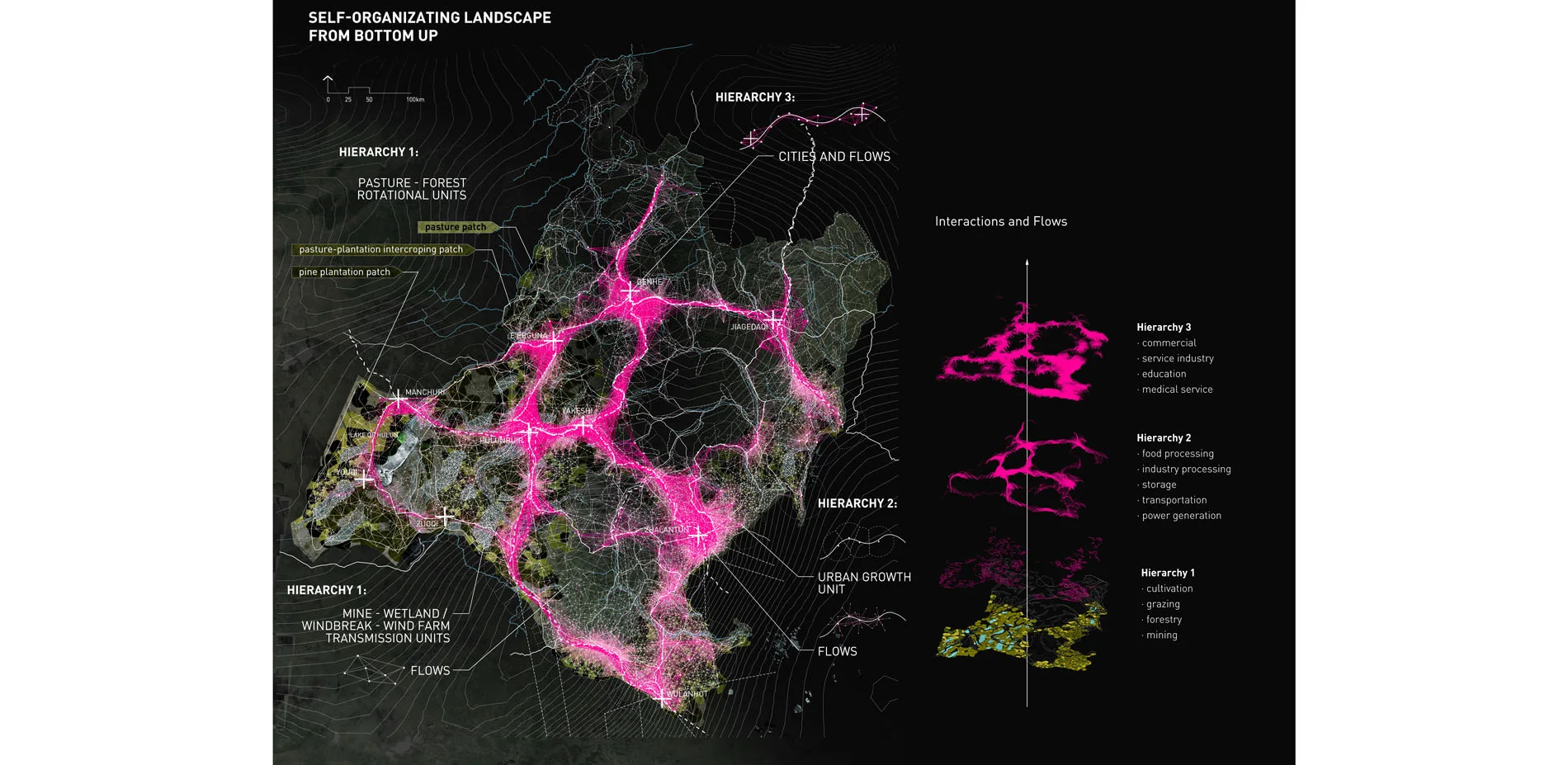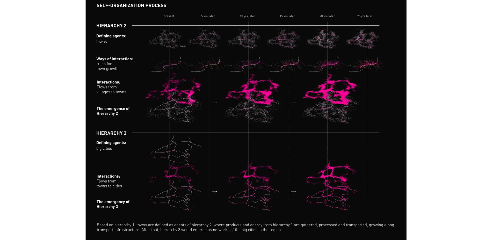 Based on hierarchy 1 would be the urbanization process. Towns are defined as agents of hierarchy 2, where products and energy from hierarchy 1 are gathered, processed and transported, growing along transport infrastructure. After that, hierarchy 3 would emerge as a network of cities in the region.