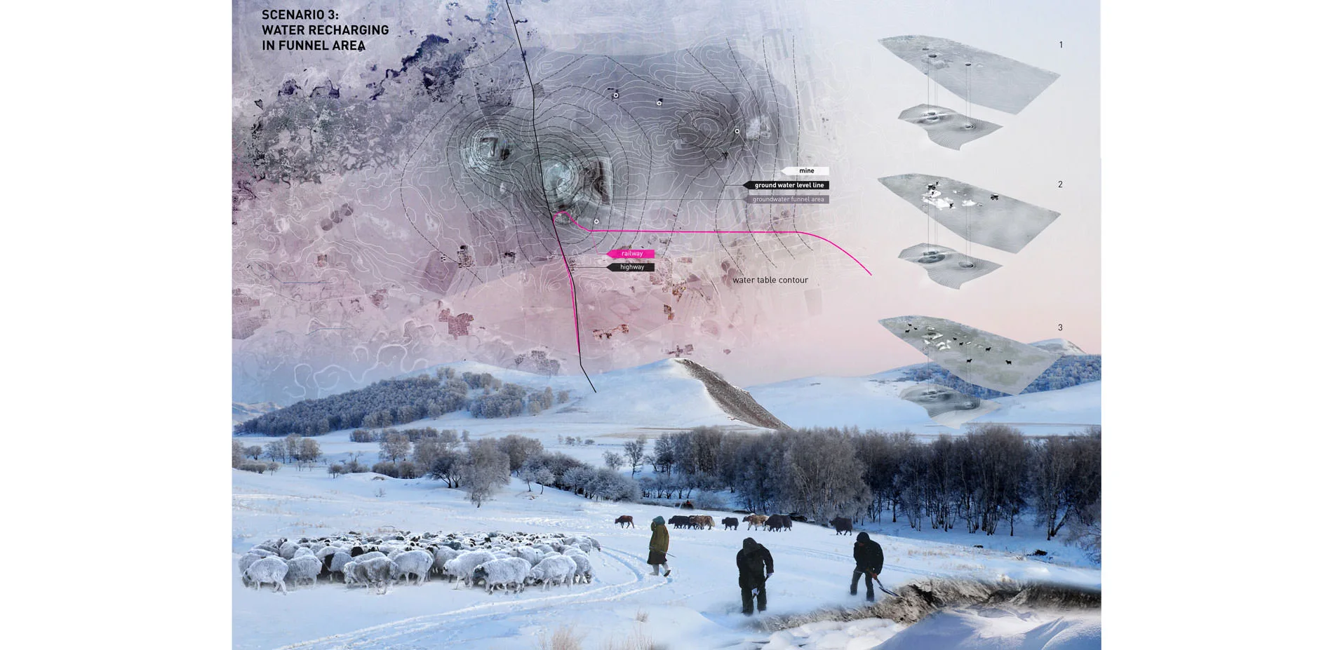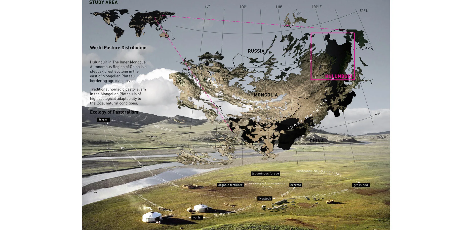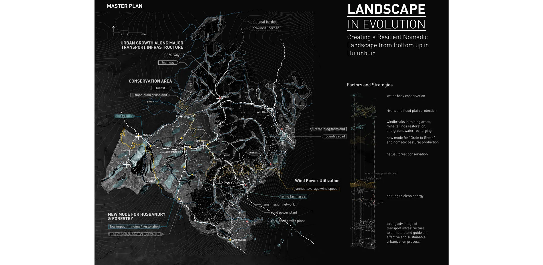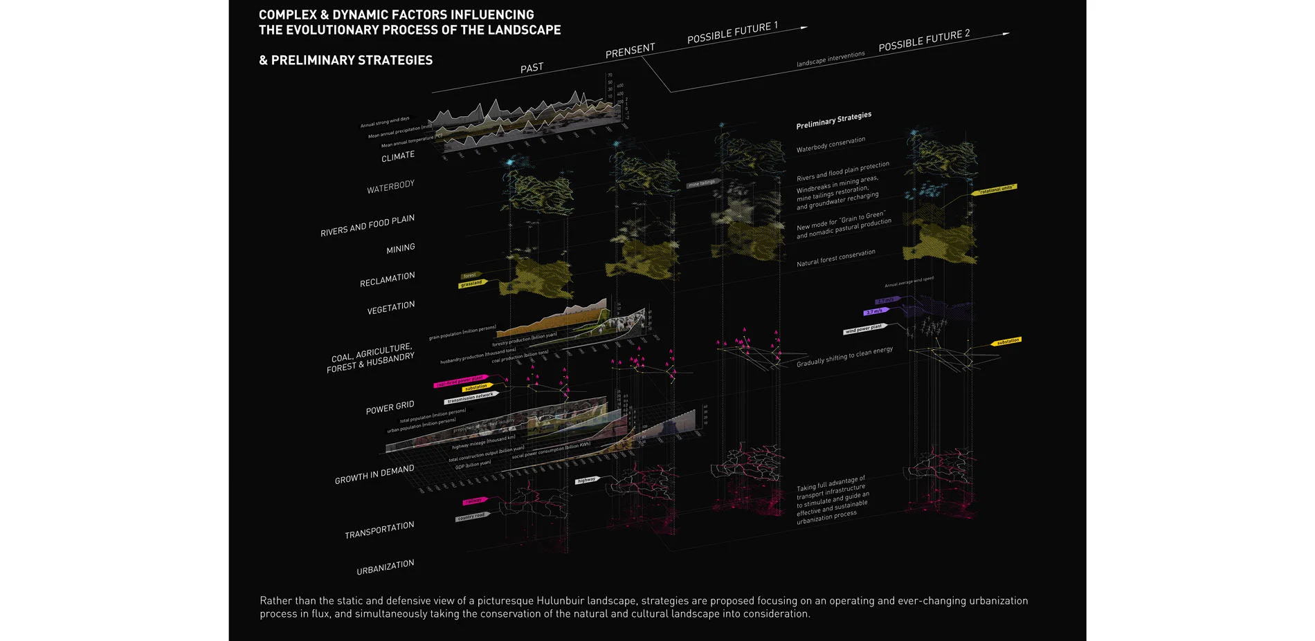 Rather than the static and defensive view of a picturesque Hulunbuir landscape, this design focuses on an operating and ever-changing process of the landscape system, and simultaneously taking the conservation of the natural and cultural landscape into consideration. Various dynamic layers are influencing the complex system of the landscape and urbanization, including: