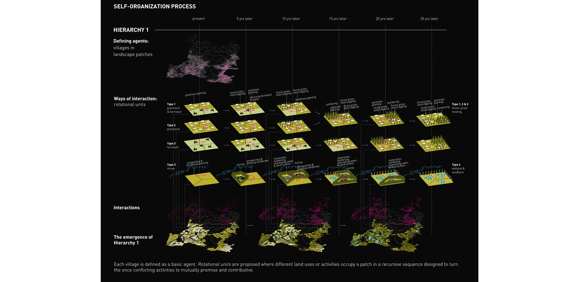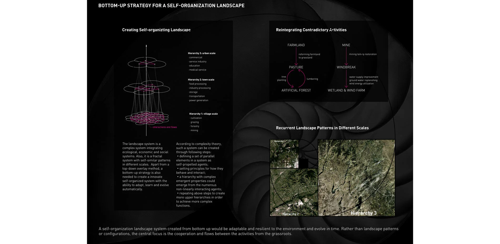 The study area is in Hulunbuir, Inner Mongolia, China, a region with extremely diversified forms of landscape and land uses. Based on analysis of dynamic and complex factors influencing the evolutionary process of the region, the landscape is considered and created as an agent-based self-organizing system from bottom up, which is resilient and adaptable to the environment and ever-changing in time. Rather than landscape patterns or configurations, the central focus of the design is the cooperation and flows between the activities from the grassroots, such as grazing, forestry, farming, mining, manufacture, energy generating and urban construction. Rotational Units are proposed as the main strategy rearranging the different forms of land uses to occupy particular patches in a recursive sequence in order to make the once conflicting human activities mutually dependent and contributive. Specific approaches are further explored and proposed for grassland restoration, grass-forest intercropping, mine tailings restoration, water supply improvement, groundwater replenishing and wind energy utilization in some envisioned future scenarios.