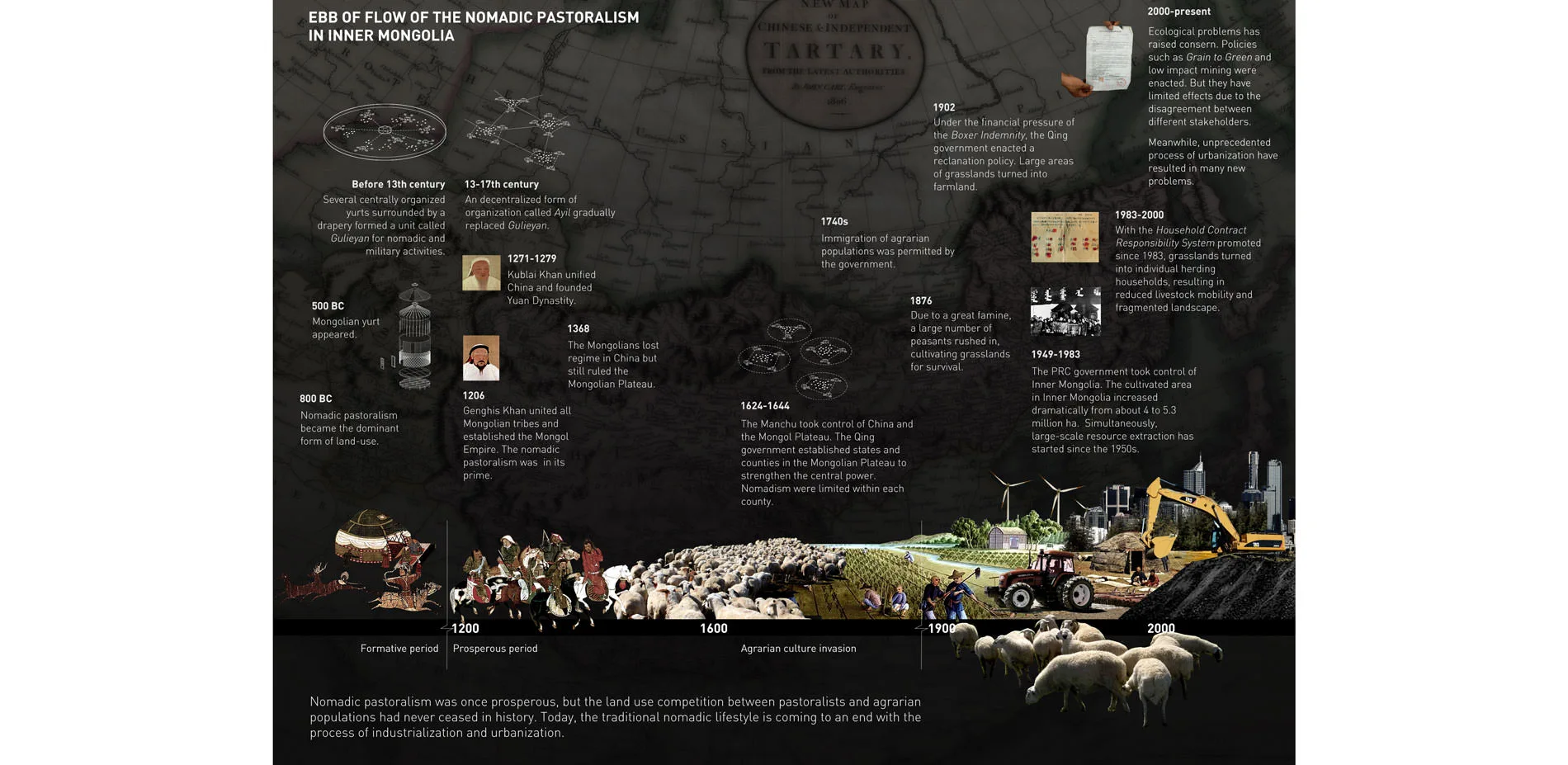Known for vast grasslands, the Mongolian Plateau had given birth to a splendid nomadic civilization developed by the Mongolians during their long history. In the south of the Plateau, there had been roughly a dividing line between nomadic pastoralism and cultivation, shifting back and forth in response to climate and political factors. Conflicts between Mongolians and agrarian populations in the south had never ceased in history. In the 1940s, the Mongolian Plateau was divided into two main parts: the independent State of Mongolia in the north and the Inner Mongolia Autonomous Region of China (Inner Mongolia for short) in the south. Affiliated to the government of the agrarian nation, Inner Mongolia had lost large areas of grasslands due to the belief of “agrarian first”. The government was hostile to pastoralists and forced them to settle down in villages, counties and towns. In the meantime, Inner Mongolia was found to be a resource-rich region, and large-scale resource extraction activities have begun since the 1950s. Nowadays, Landscape fragmentation and ecology deterioration has brought about severe problems in Inner Mongolia. However, land development and industrial diversity, on the other hand, have given rise to economic prosperity and accelerated urbanization process.