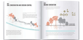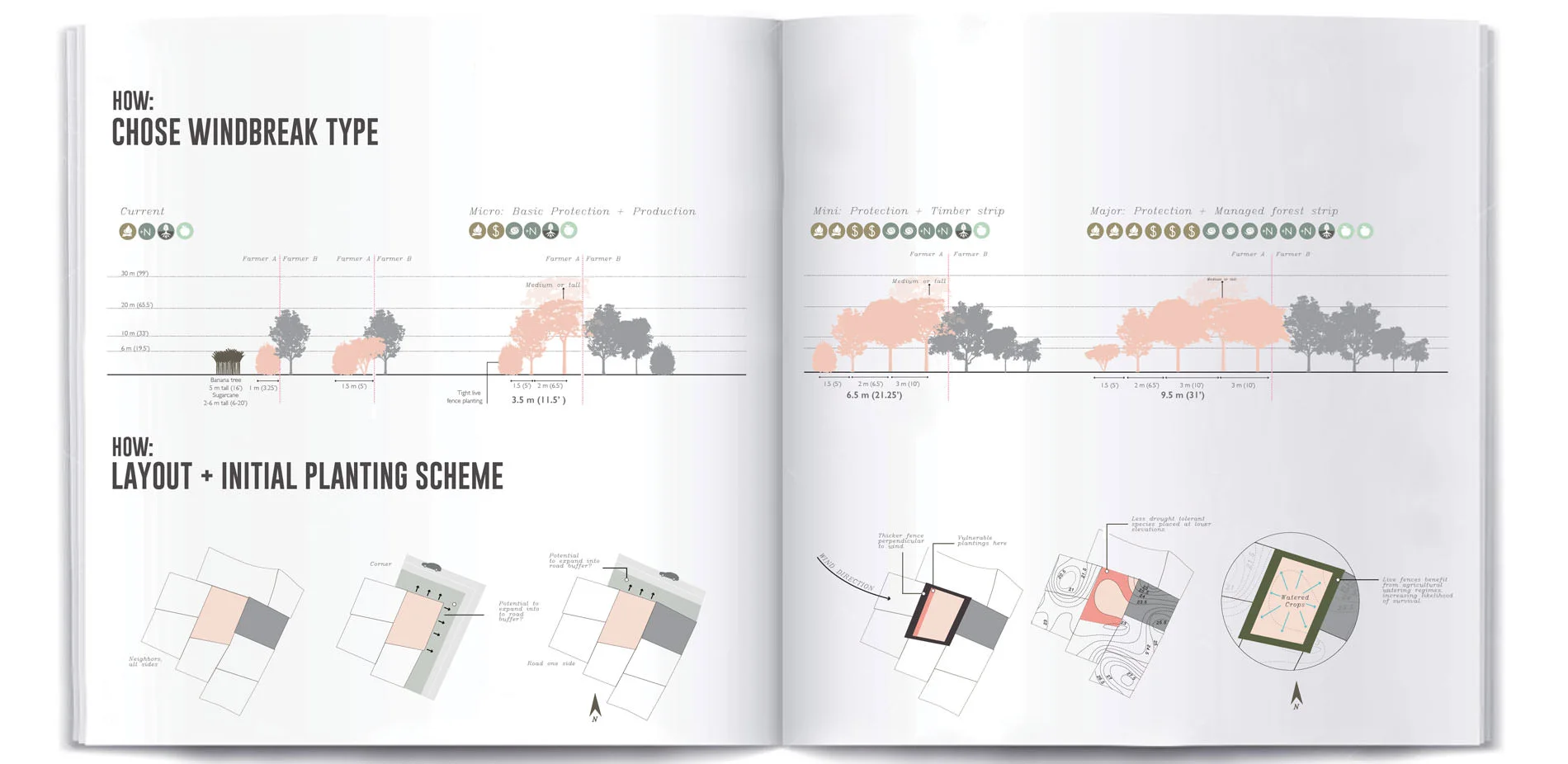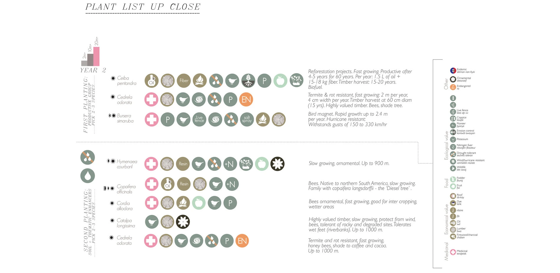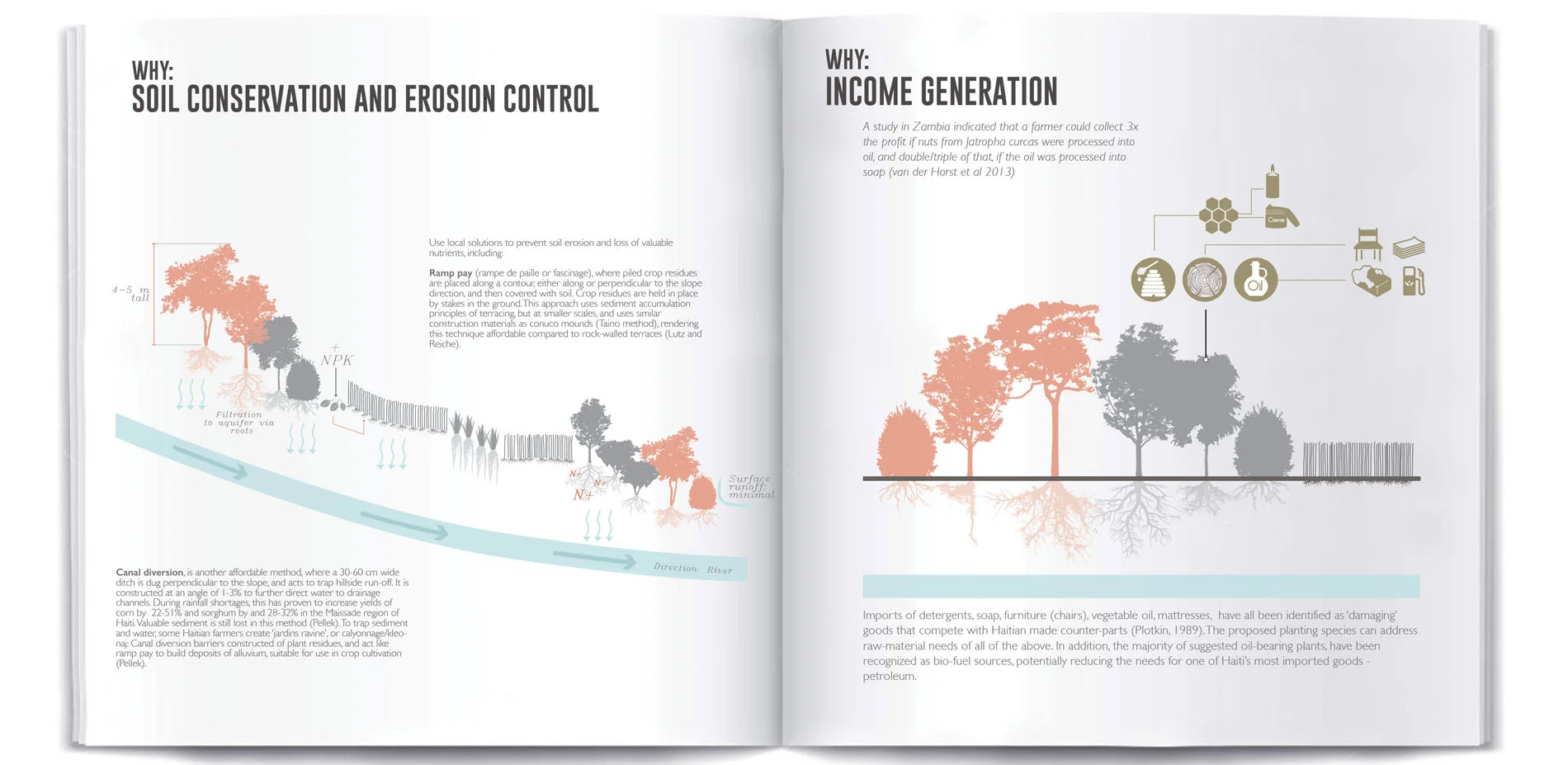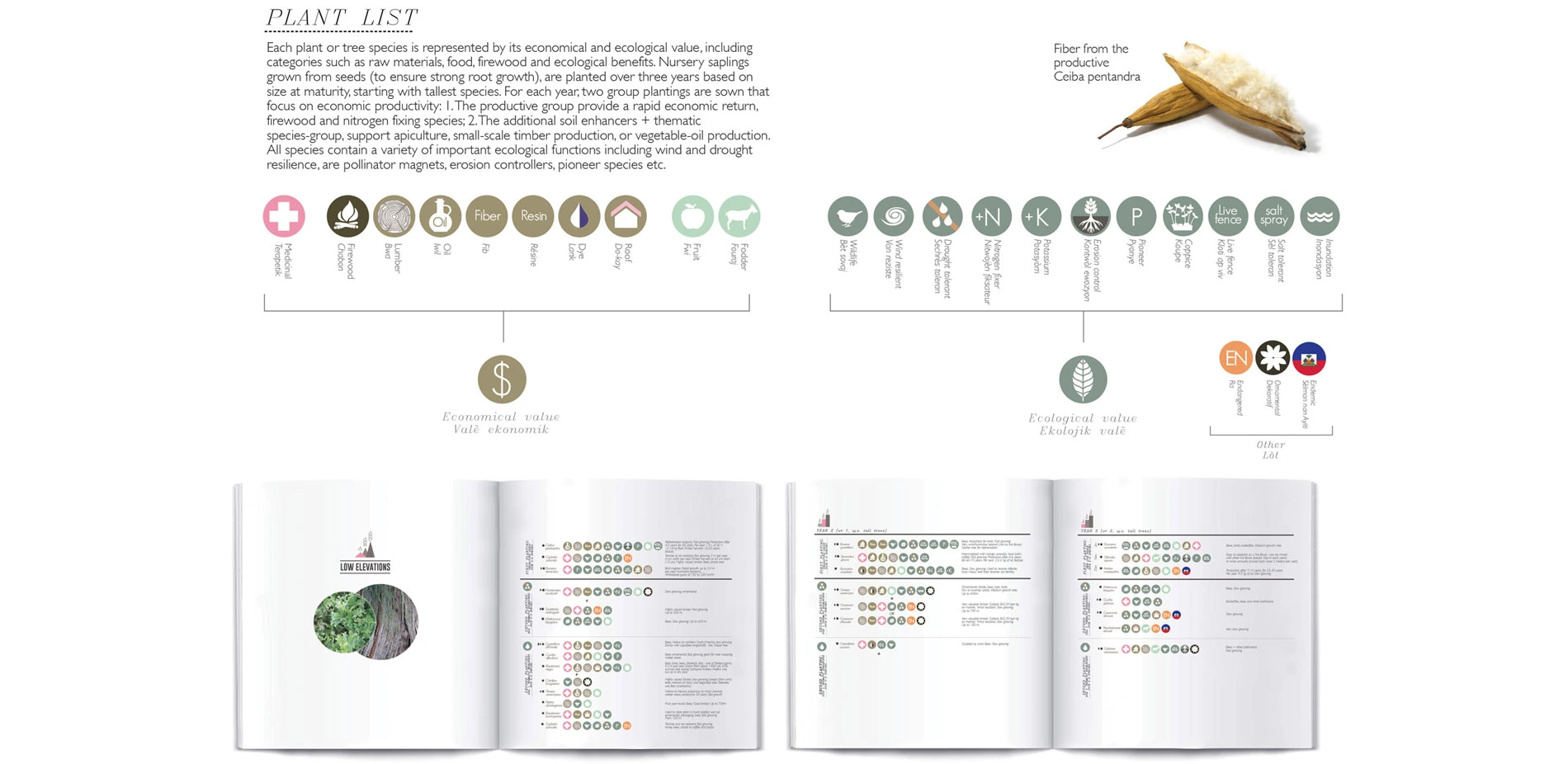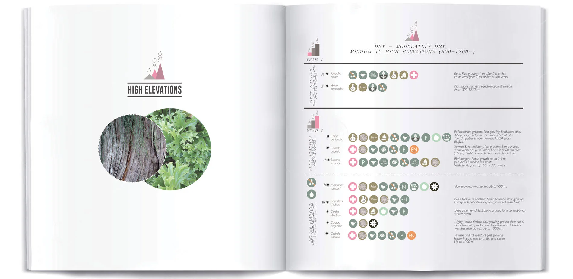 The submitted Farmers Manual is representational of the first and second phase of this project, and is meant to demonstrate to participating farmers, why such a system is beneficial. It gives a basic visual narrative to the ecological and economical benefits of implementation, followed by detailed visual instructions of how: the farmer first conducts a basic analysis of his land, choses desired system, and is then provided with a palette of plant-groupings from which he can chose. The plants are represented by easy-to-understand icons, representing species characteristics. The plant groupings are divided into two main categories: The Productive Group (fast growing income generators), and the Enhancing Group (nourishes soil and supports themes of apiculture, oil or small-scale timber production). Each year, over a total of 3-5, the farmer plants a community with 2-3 species from the Productive group and another 2-3 species from the Enhancing group, ensuring variety and health of future forest.