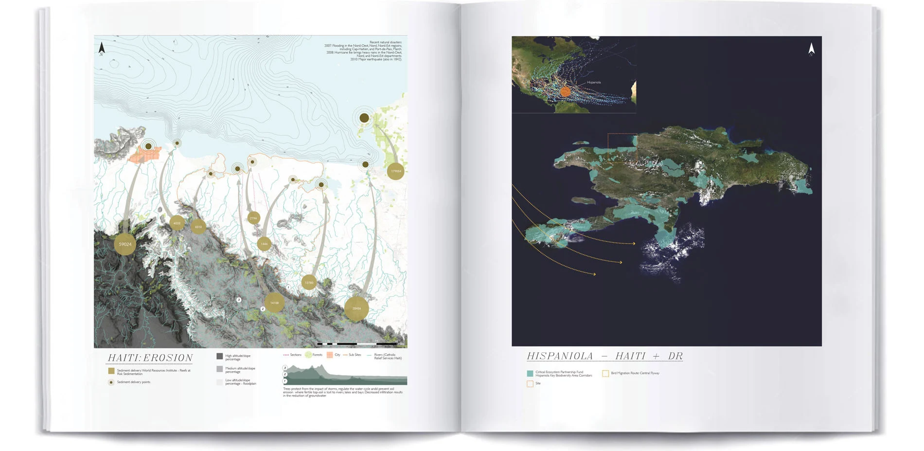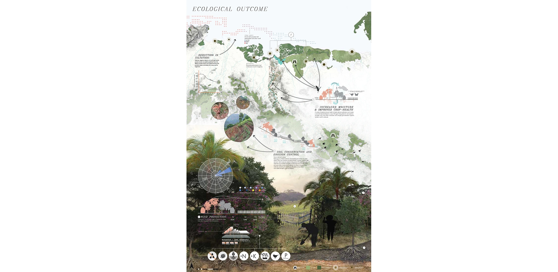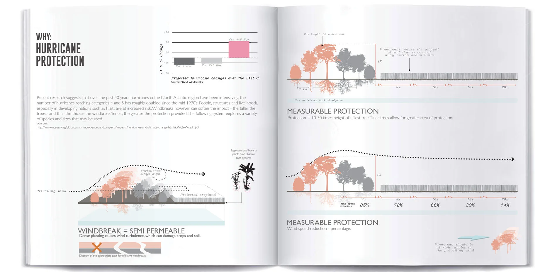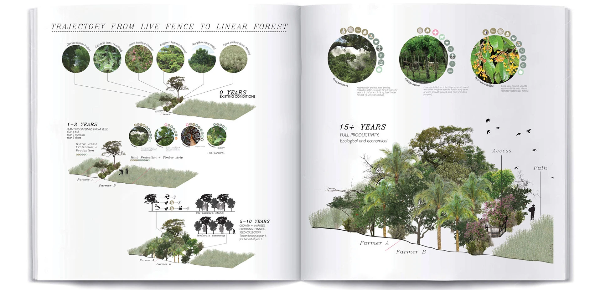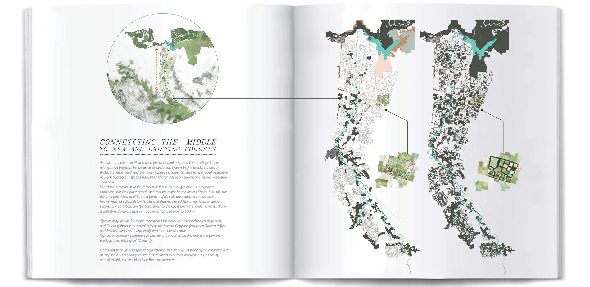 Using Haiti as a prototypical case-study, this project investigates the utilization of live fences as a catalyst for reforestation through the choreographed design of economically and environmentally beneficial linear forests. Specifically situated for subsistence farmers in developing nations, this supportive ‘fabric’ of forests is poly-functional: buffering neighboring crops from damaging winds, improving crop moisture retention, stabilizing and enriching soils, and--critically--providing the raw resources for a diverse portfolio of local, plant-based income generation. In Haiti, 98% of native forests have been removed and 65% of the land is devoted to agricultural use, and where the majority of farms are delineated by a thin 0.5-5m wide live fence.