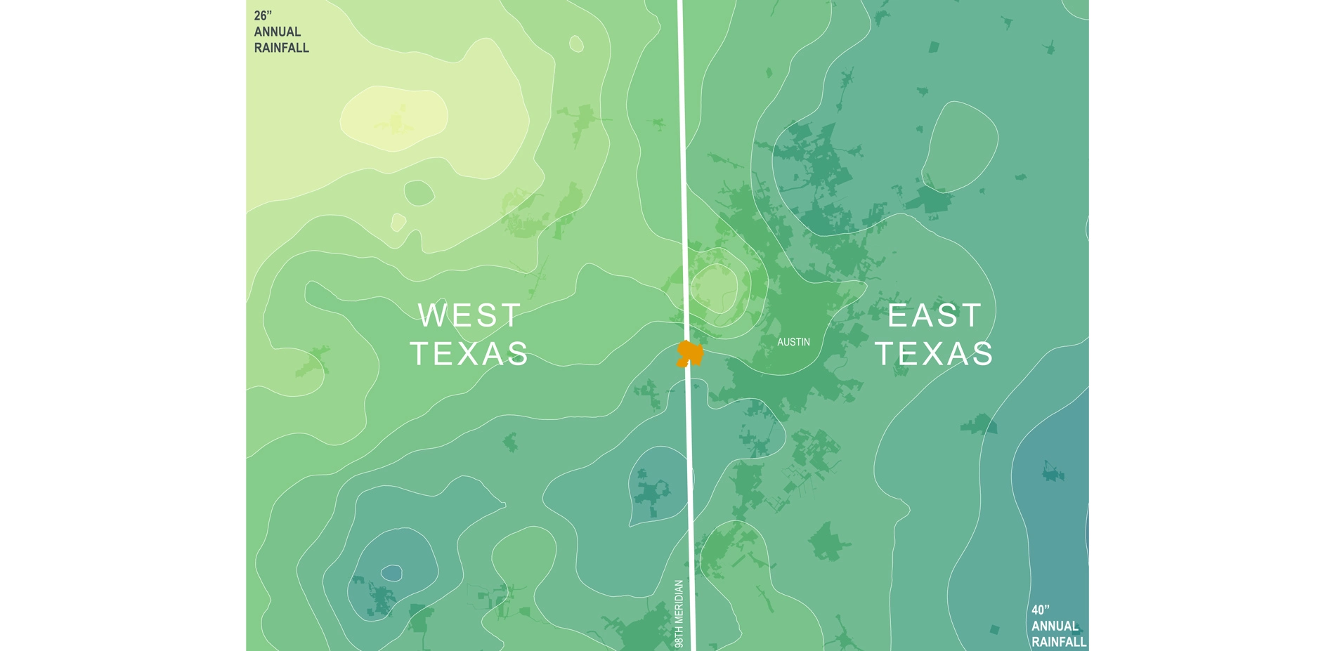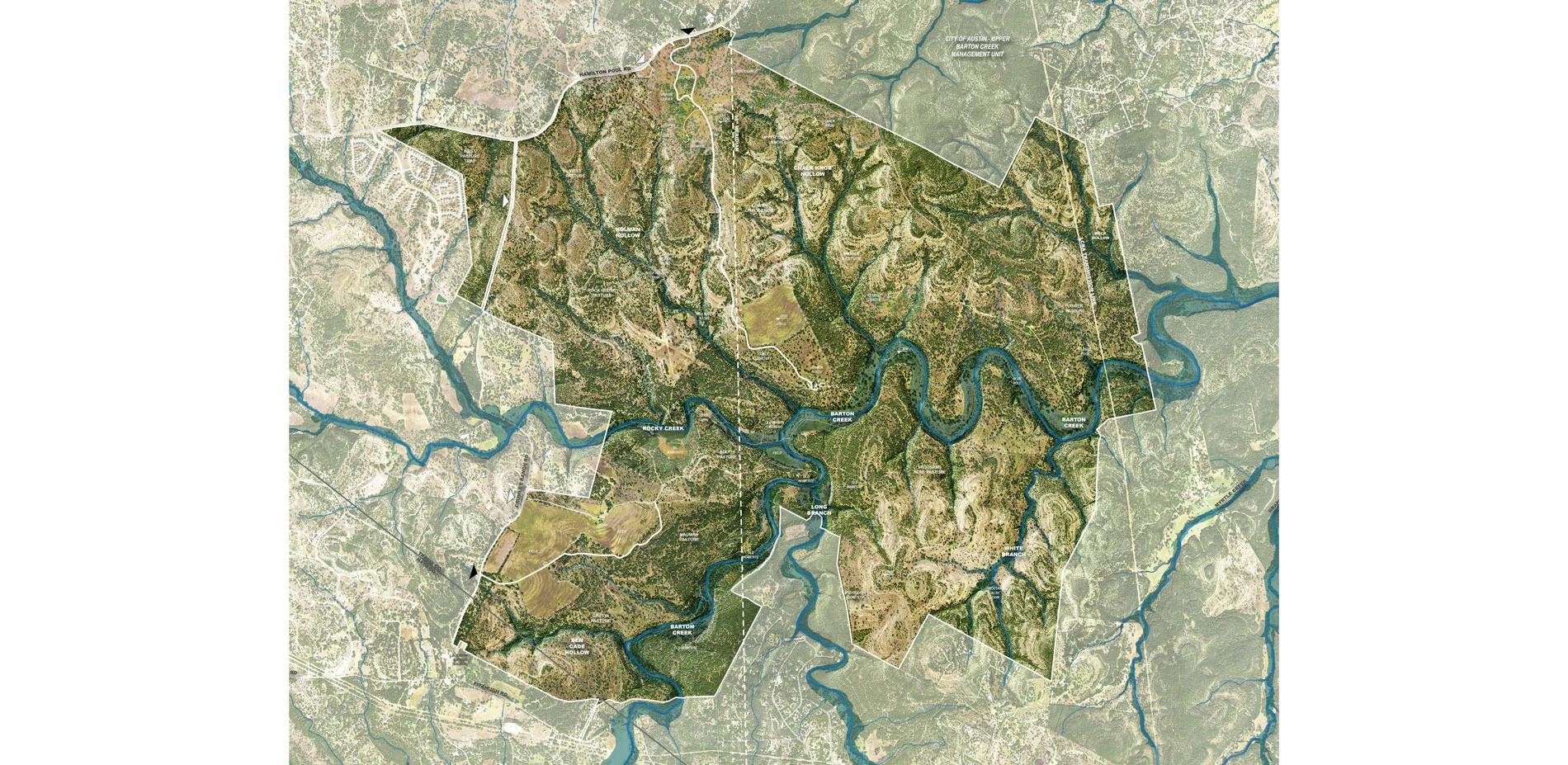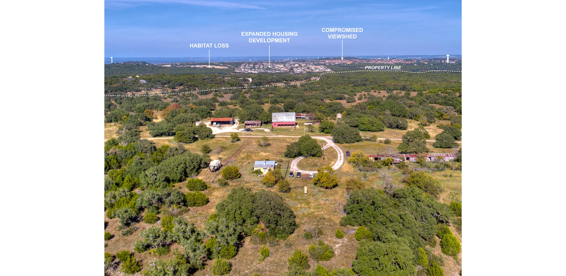 Shield Ranch lies at the American Southwest (98th meridian) gateway, which is considered a "danger zone" due to the extreme impacts of climate change paired with rapid population growth. Large storm events typically intersperse extended periods of drought within this zone, a phenomenon that's exacerbated by climate change. Regionally, the ranch lies within the Balcones Canyonlands of the Edwards Plateau (ecoregion 30c), and the Barton Creek watershed. This watershed drains to the Edwards Aquifer recharge zone - the primary water supply for more than 2-million people - and is impacted by the hydrologic performance of Shield Ranch and neighboring, large-scale land holdings. Through resiliency planning, the Shield Ranch Master Plan leverages physical intervention and long-term stewardship to mitigate these threats, along with others that plague Texas Hill Country: habitat loss; imminent domain for public infrastructure and roads; limited water availability; degraded water quality; fire risk; light and noise pollution; and viewshed degradation.