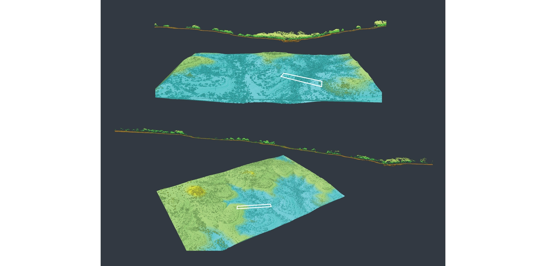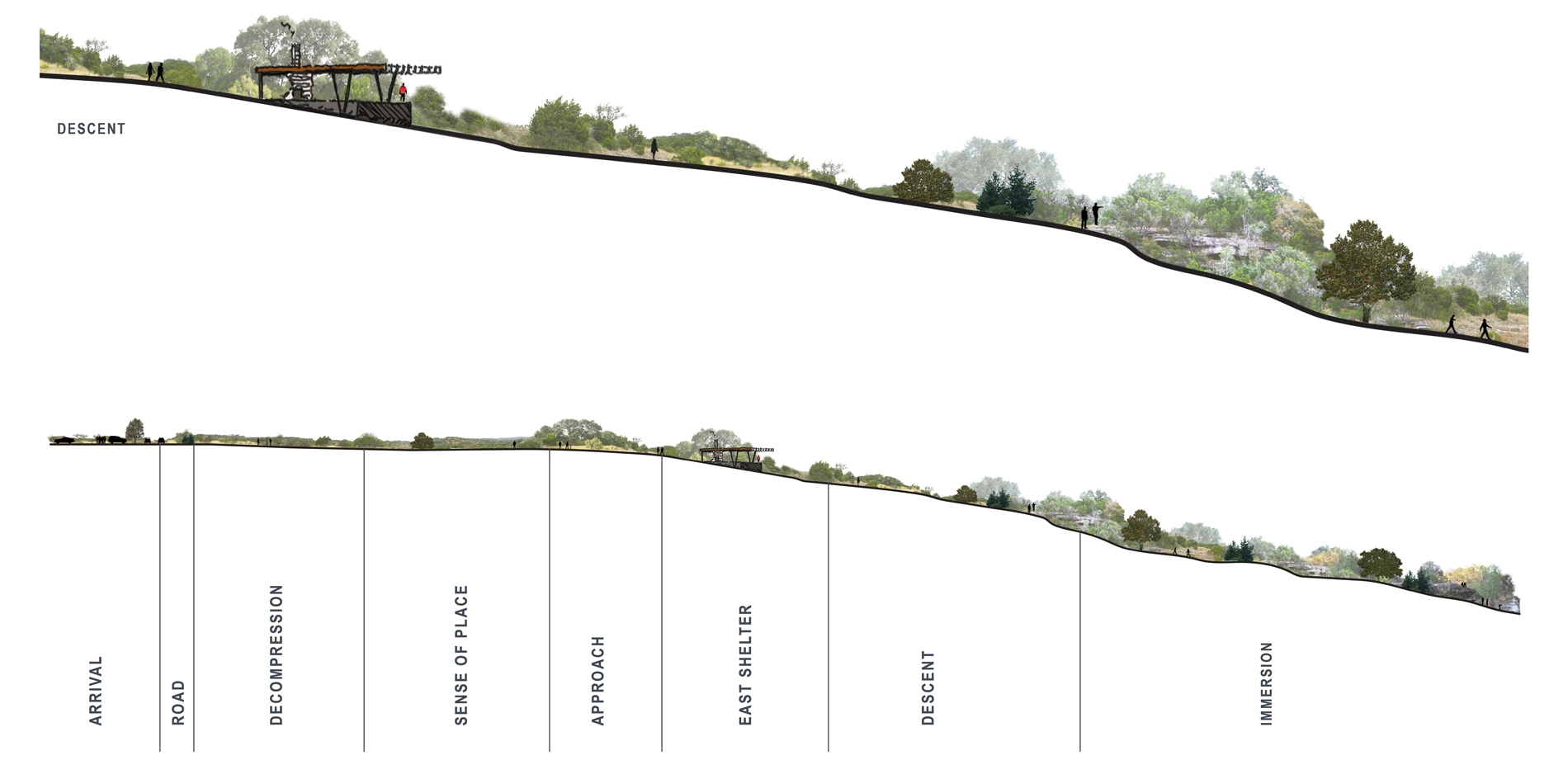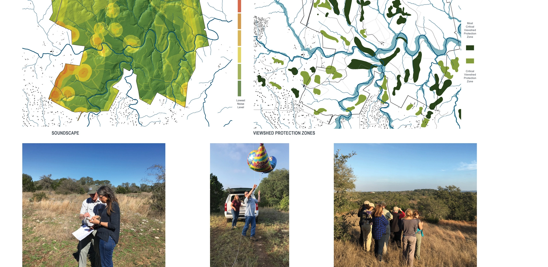 - LIDAR data viewshed and soundscape modeling - Using high-resolution, point cloud elevation and vegetation data, the team analyzed existing auditory and visual conditions and potential future scenarios to site program that requires a preserved, nature-immersion experience.