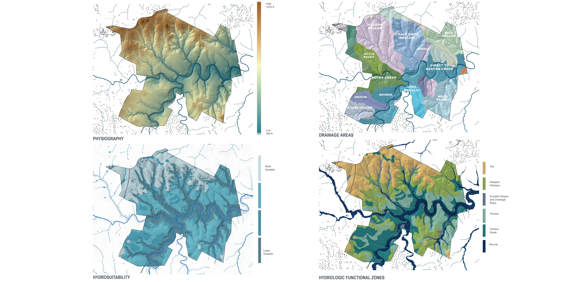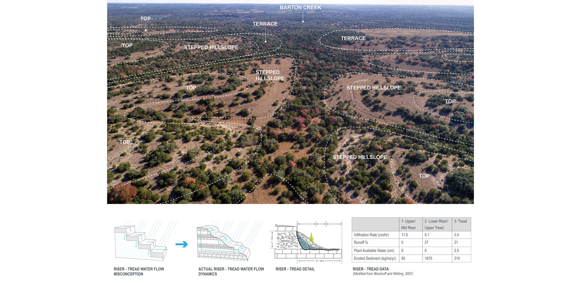 - Eco-hydrogeological planning frameworks - By combining GIS data and information from interviews with local scientists and policy makers, the team tailored design guidelines that support Shield Ranch's: 1) Variable geologic features (including protection of the stair-stepped geology's, high-performing "risers"); 2) Need to improve water quality; and 3) Desire to provide high-quality habitat for two resident, endangered species (the golden-cheeked warbler and black-capped vireo).