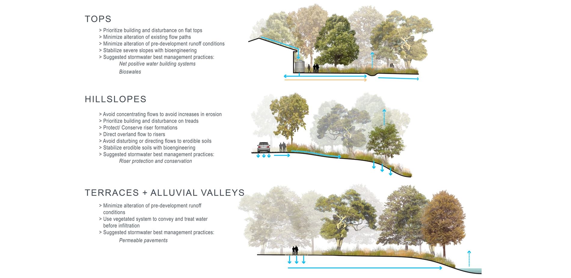 Recent research reveals that misconceptions about the region's eco-hydrogeological processes (interactions between ecology, hydrology, and geology) are resulting in destructive land management practices throughout this vulnerable landscape. As one of the most rapidly growing areas in the U.S., these misinformed practices are placing natural and cultural resources at risk. To protect these resources and accommodate programmatic experiences within Shield Ranch that require nature immersion and interpretation of local history, fine-scale analysis over the expansive landscape was required. Conventional planning approaches proved inadequate for this effort, and furthermore often fall short within expansive, highly-variable landscapes. So, how are small details catalogued? What framework exists for identifying the landscape's character zones? How will development scenarios impact precious soundscapes and viewsheds?