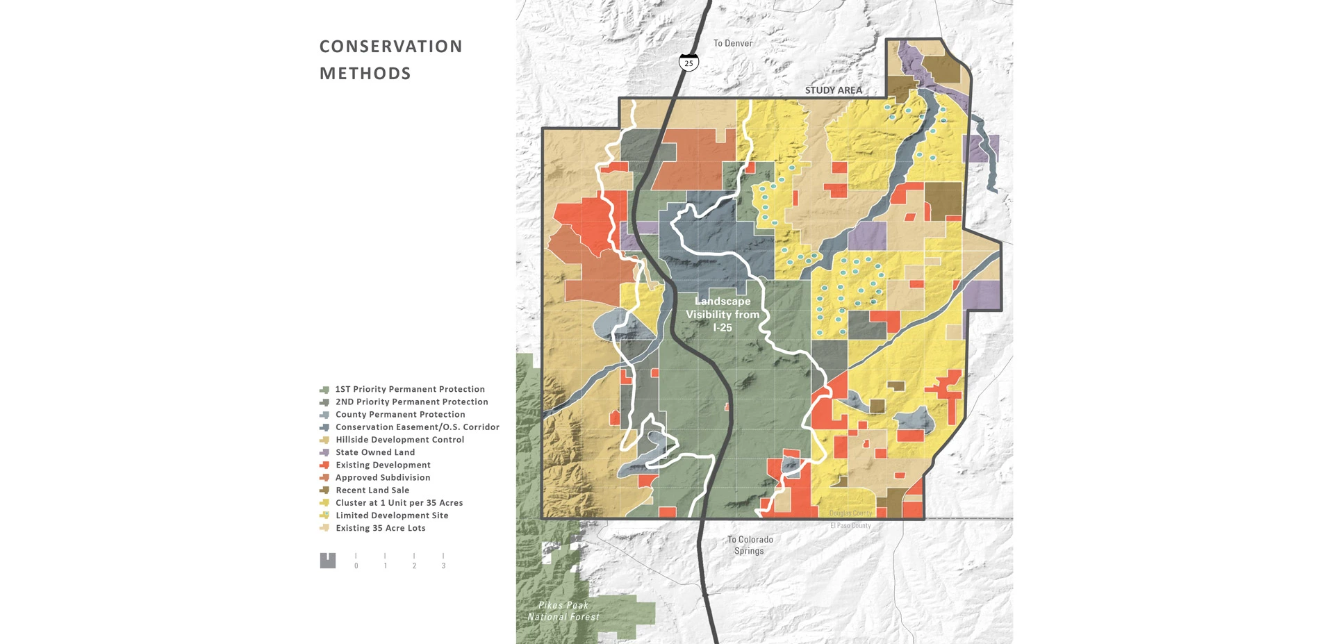 The effectiveness of the I-25 Conservation Corridor Master Plan can be measured through its efforts to preserve a significant landscape in distress. Through rigorous analysis, a variety of innovative land conservation methods (including purchase of undeveloped lots, conservation easements, limited development strategies and zoning changes to clustered development) and the support and funding received from various state agencies, a quintessential Front Range landscape on the verge of irreparable change was preserved. To date, 32,000 acres of land originally appraised at over $105 million have been purchased and protected for less than 30 percent of market value. The plan, which not only set forth methods and strategies to achieve a vision for the preservation of remarkable open lands with unmatched natural and scenic resources, also outlined a regional process that permanently limits poor development practices in favor of responsible development combined with preservation of open space.