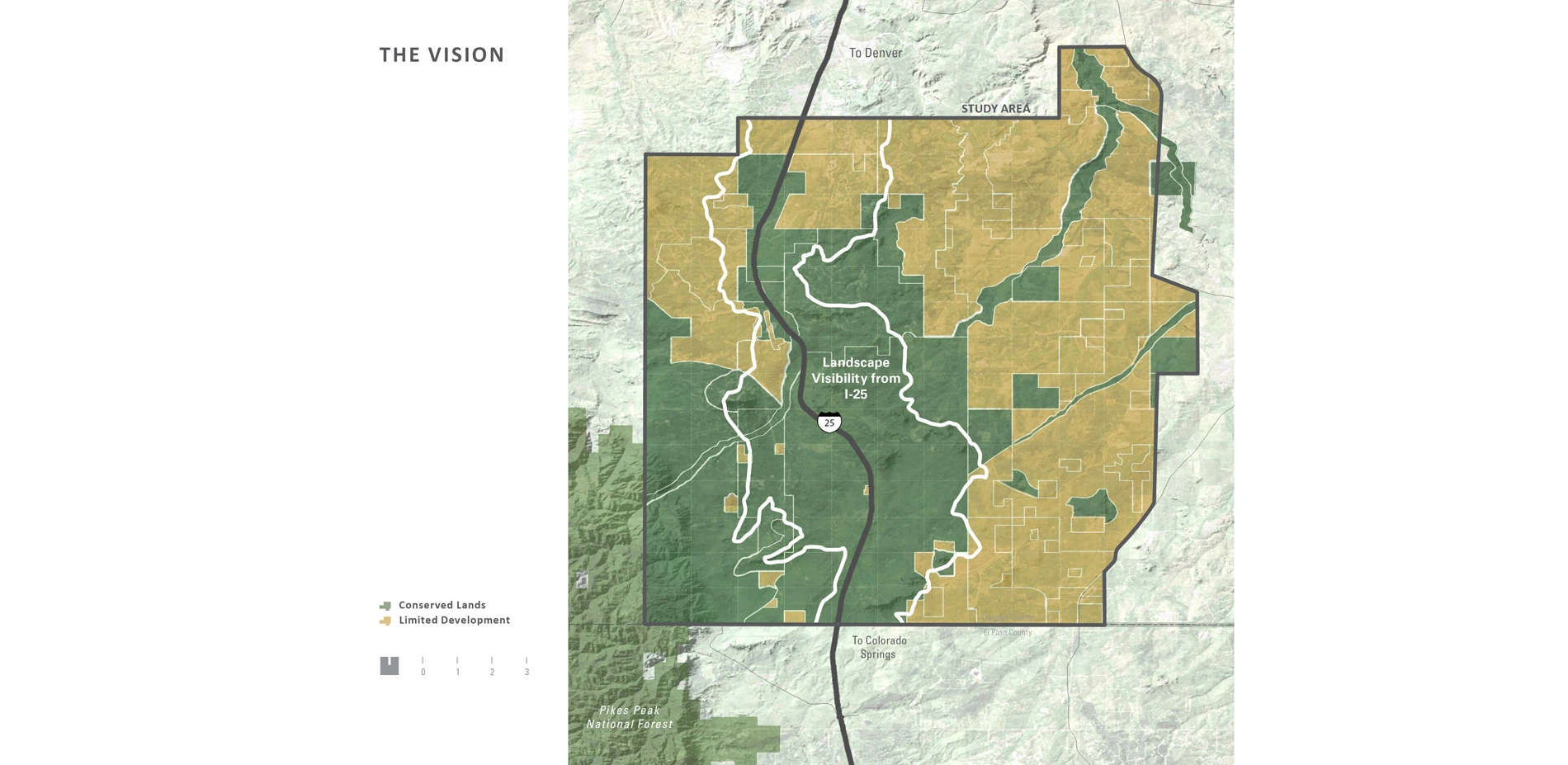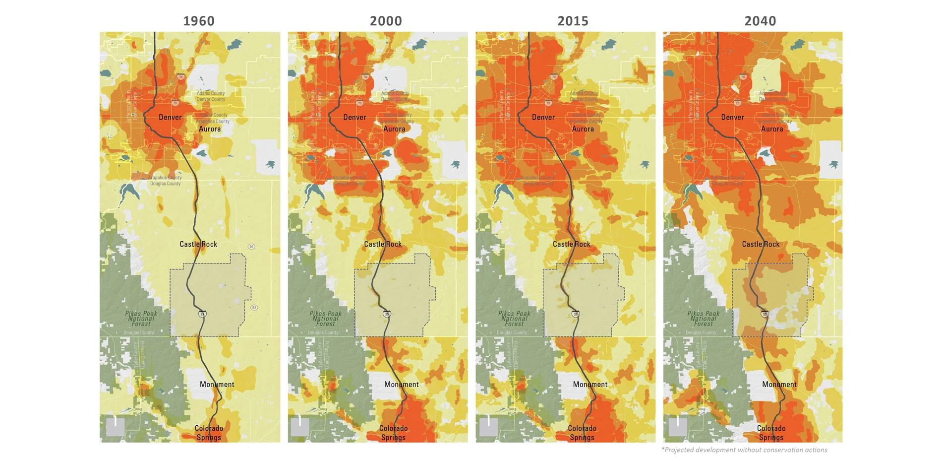 The Conservation Fund, in collaboration with the landscape architect, initiated a strategy to engage residents and government officials in conserving open lands to forever protect scenic vistas, water quality, wildlife, clean air and recreational opportunities along the corridor. Devised to offer solutions to the surrounding uncontrolled sprawl, the plan leveraged unique planning methods and limited development strategies to achieve what had been previously considered impossible: preservation of over 100,000 acres of open space along Colorado's Front Range.