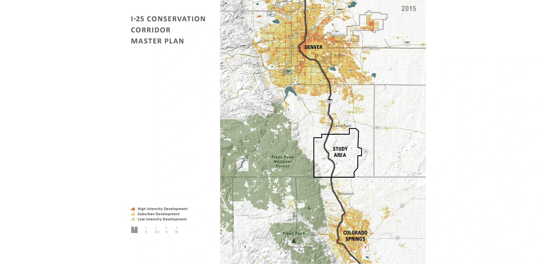 Prompted into action by record and uncontrolledgrowth along the I-25 Corridor, environmental groups, land trusts, local communities, Douglas County, and state agencies formed an unusual coalition to create a regional conservation vision. A multi-disciplinary planning team, under the leadership of the landscape architect, worked with limited resources to create a unique set of analysis tools to identify areas of significant natural and scenic resources most vulnerable to development. Critical attributes of the landscape were analyzed, including scenic view corridors, topography, land cover, natural hazards, land value, zoning, land ownership, view characteristics, wildlife habitat and migrations, ground water availability, recreational trends, heritage sites and the status of development commitments. Once these attributes were analyzed and the significant resources understood, the team developed an initial vision for the permanent preservation of an area of significant open space marking a large-scale transition from prairie to peak between the expanding cities of Denver and Colorado Springs.