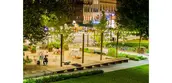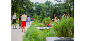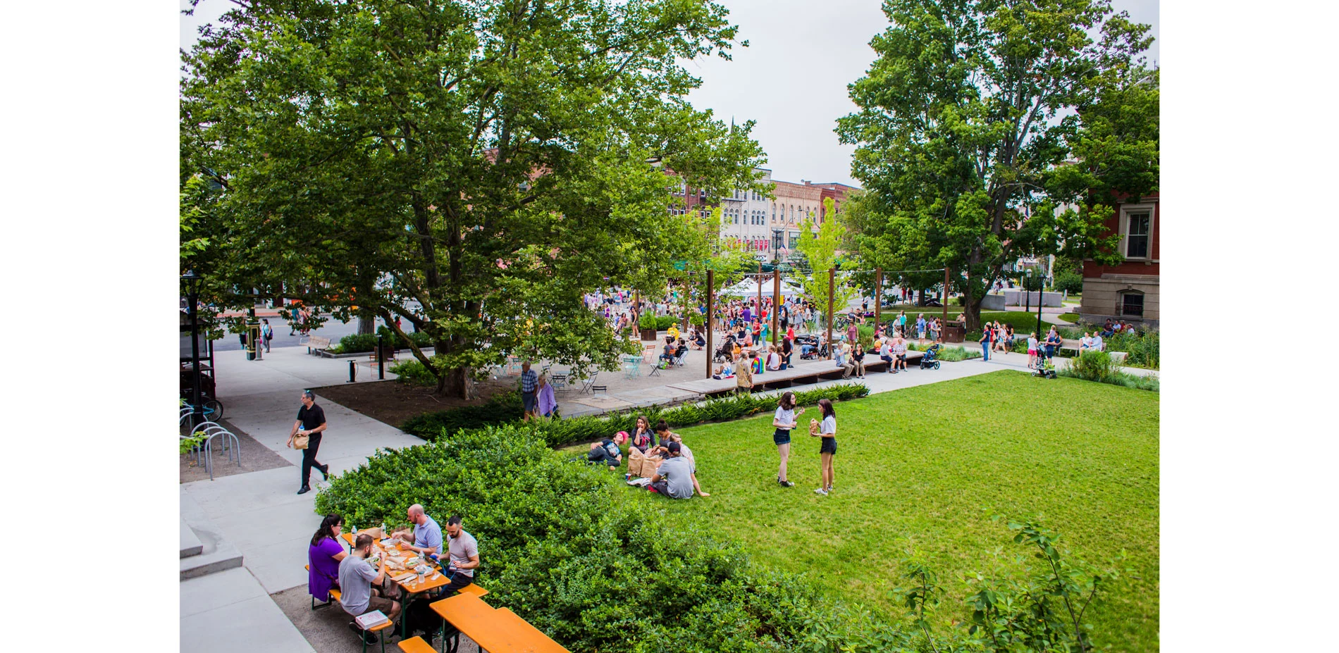 As the only substantial open green space in the heart of the City, an expansive south-facing lawn acts as a village green, providing a flexible, central open space for informal gathering, play and cultural events. At the west edge, a stage bridges over the stormwater garden and extends into the woodland garden for seasonal events. A new iconic holiday tree was sited at the southern edge with ample gathering space around it for festivities.