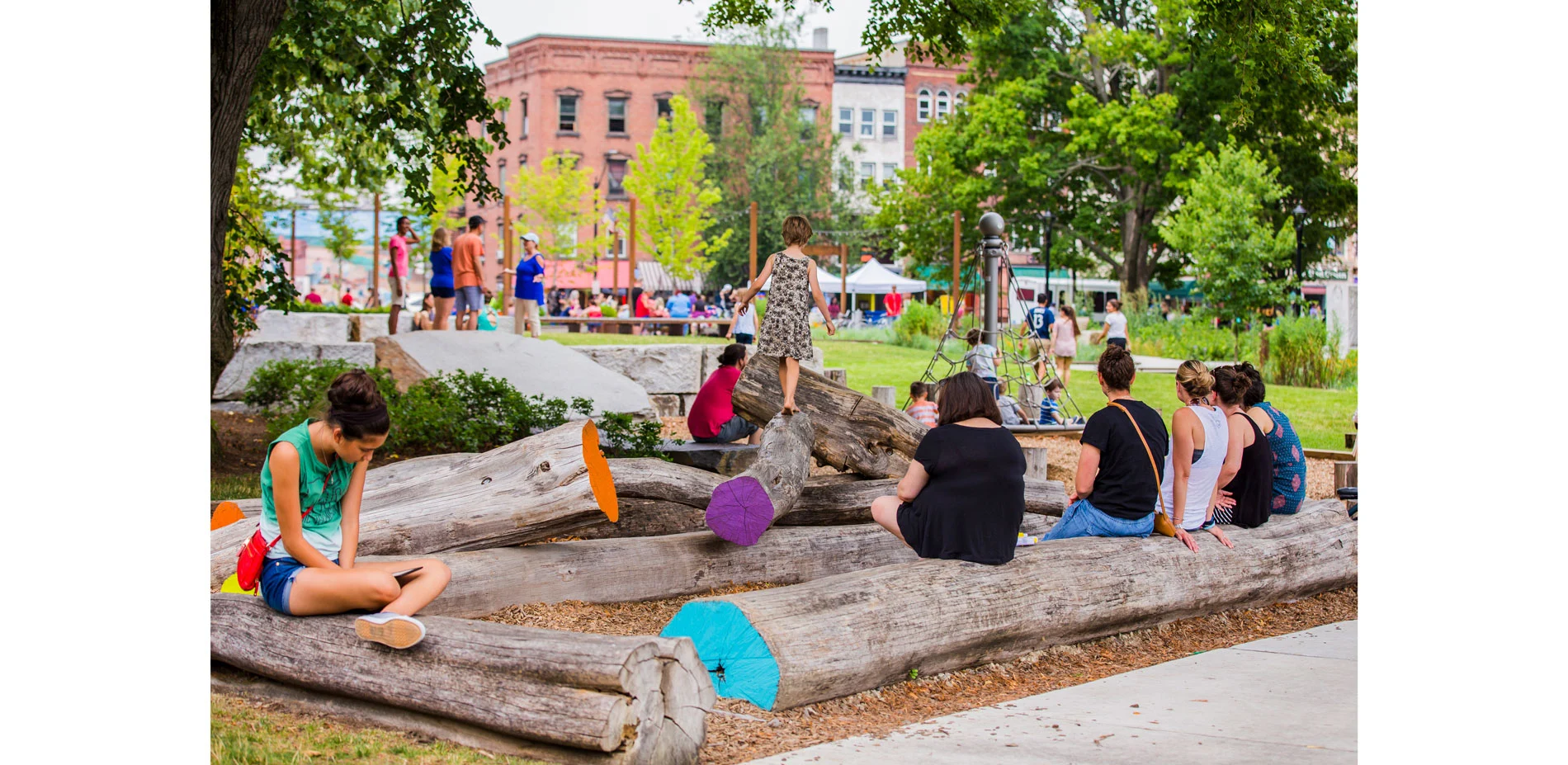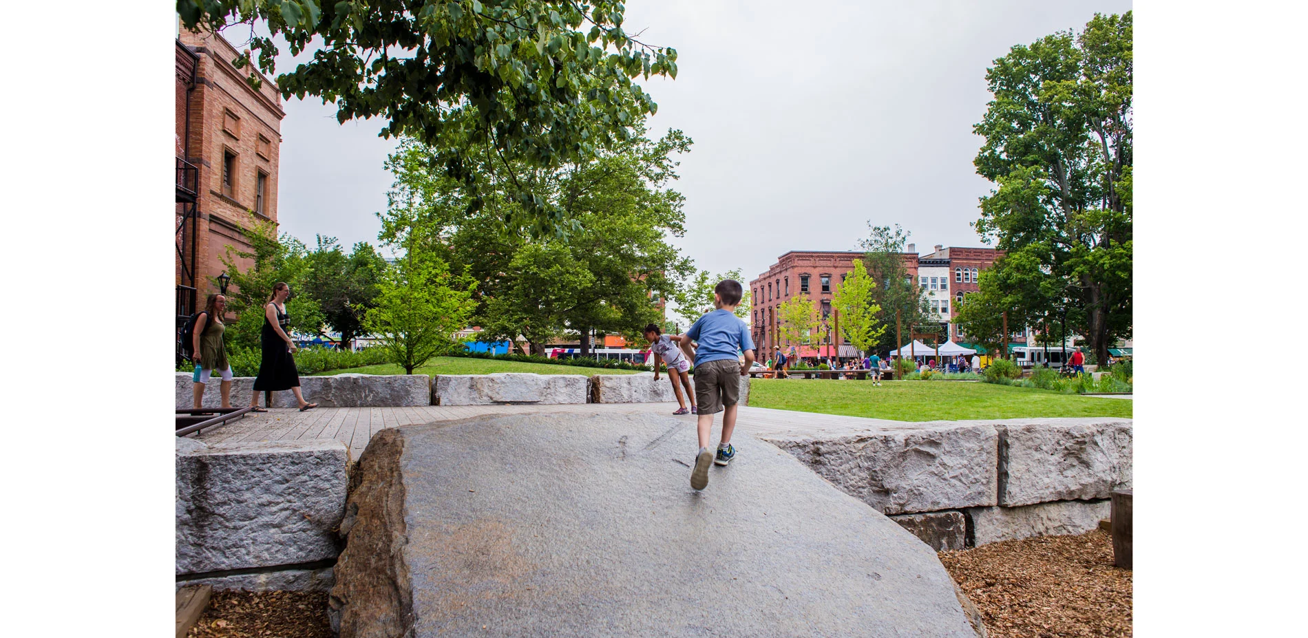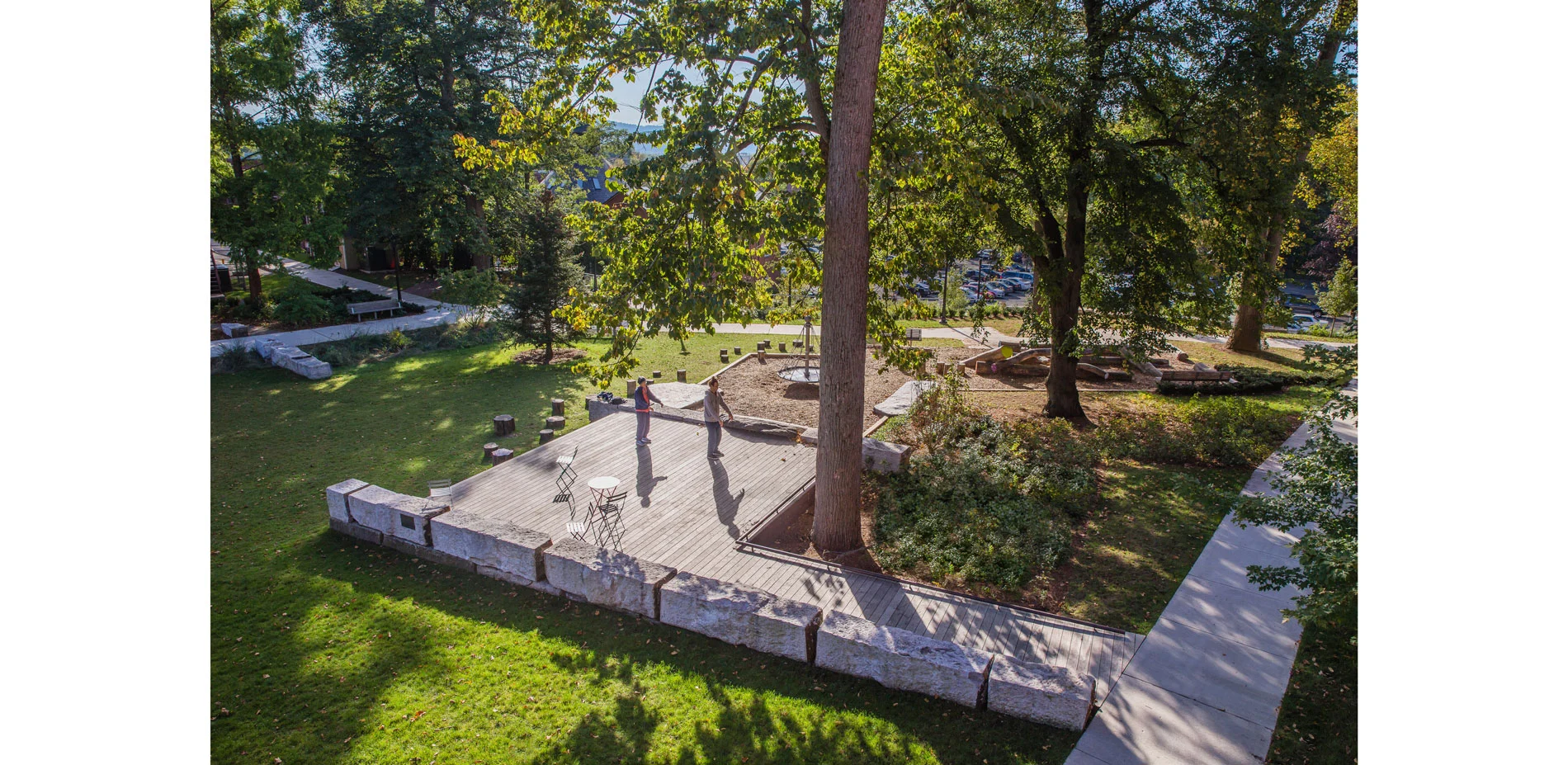 The local riparian woodland of the Mill River is reinterpreted, extending through the site, as a remnant of heritage trees and native groundcovers and spring bulbs. An alcove carefully sited in between an existing grove of shade trees offers a safe place for a small accessible play area. This landscape of play of locally harvested black locust logs and Goshen stone outcrops offers a unique type of play as an alternative to ordinary equipment. A wood deck hovers sensitively above the root zones of existing heritage trees as a place for parents to keep watch from nearby. The play area was designed with participation from local children in public forums.
