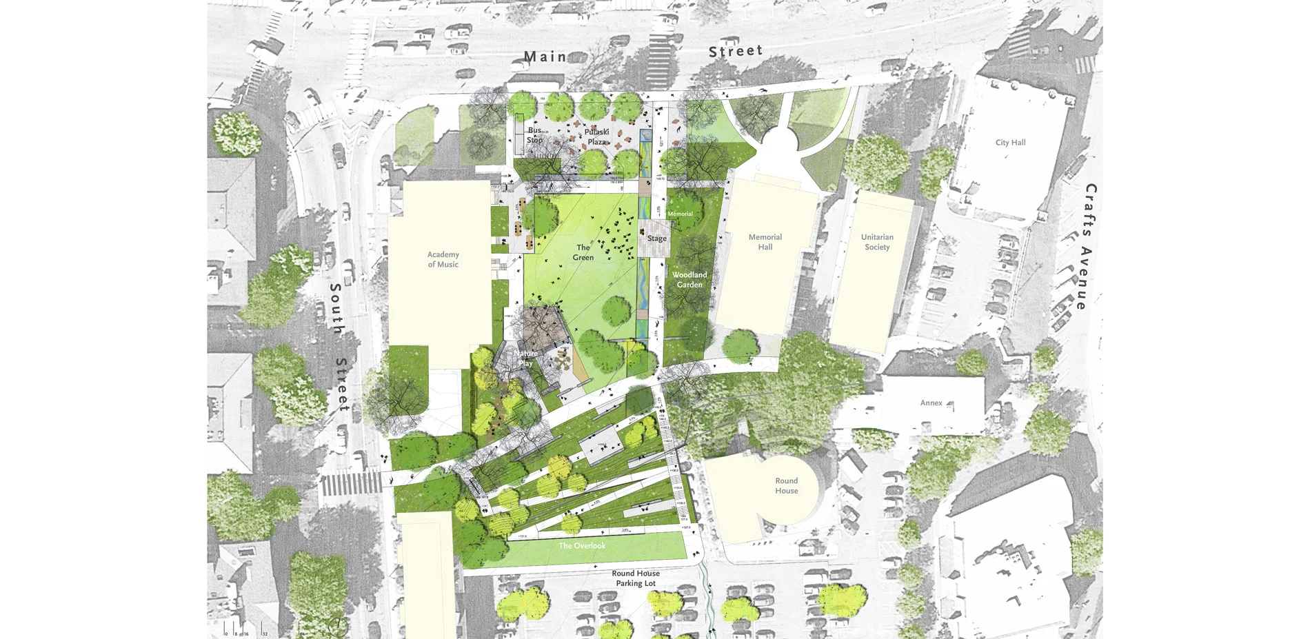 Re-envisioning Pulaski Park began by studying early patterns of settlement in Northampton, and the roots of the original Park site. Research found that the landscape of Pulaski Park was once grounded in the ecological system of the historic Mill River that flowed through the village center. Over time, with the growth of the City, inherent flooding, and subsequent diversion of the river, a connection to the riparian and agrarian landscape had been lost. The concept for this Park project is to re-connect the downtown to its ecological and cultural history, to evoke the health of the river ecosystem through the restoration of indigenous plant communities, and to make the present-day environmental ethic of the City visible through the civic landscape. The project was originally a design competition in 2008 and was shelved until 2012 when the City Engineer and Landscape Architect collaborated to obtain $1.85 million in grant funding. A series of public meetings over the course of a year, led by the Landscape Architect, gave this project a real sense of place that identifies with the heritage, spirit and attitude that is distinctly Northampton.