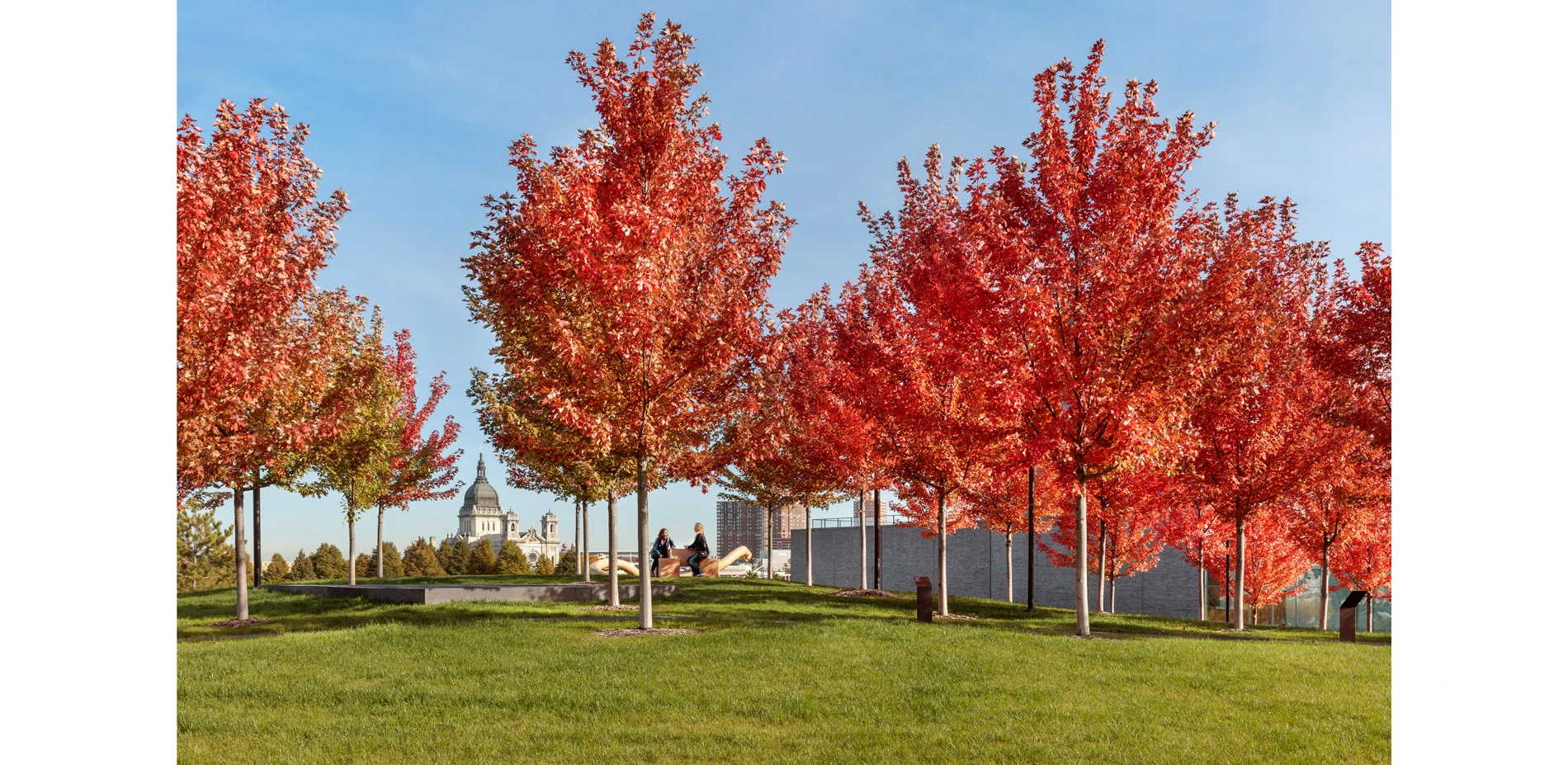 The majestic bosque of Autumn Blaze Maples comprised by Volume 7 is situated in the garden on the 14-foot artificial earthen mound created by geofoam over the parking garage below. This new landform offers expansive views to the Minneapolis downtown skyline and provides the seating for events such as the annual fundraiser Rock the Garden.