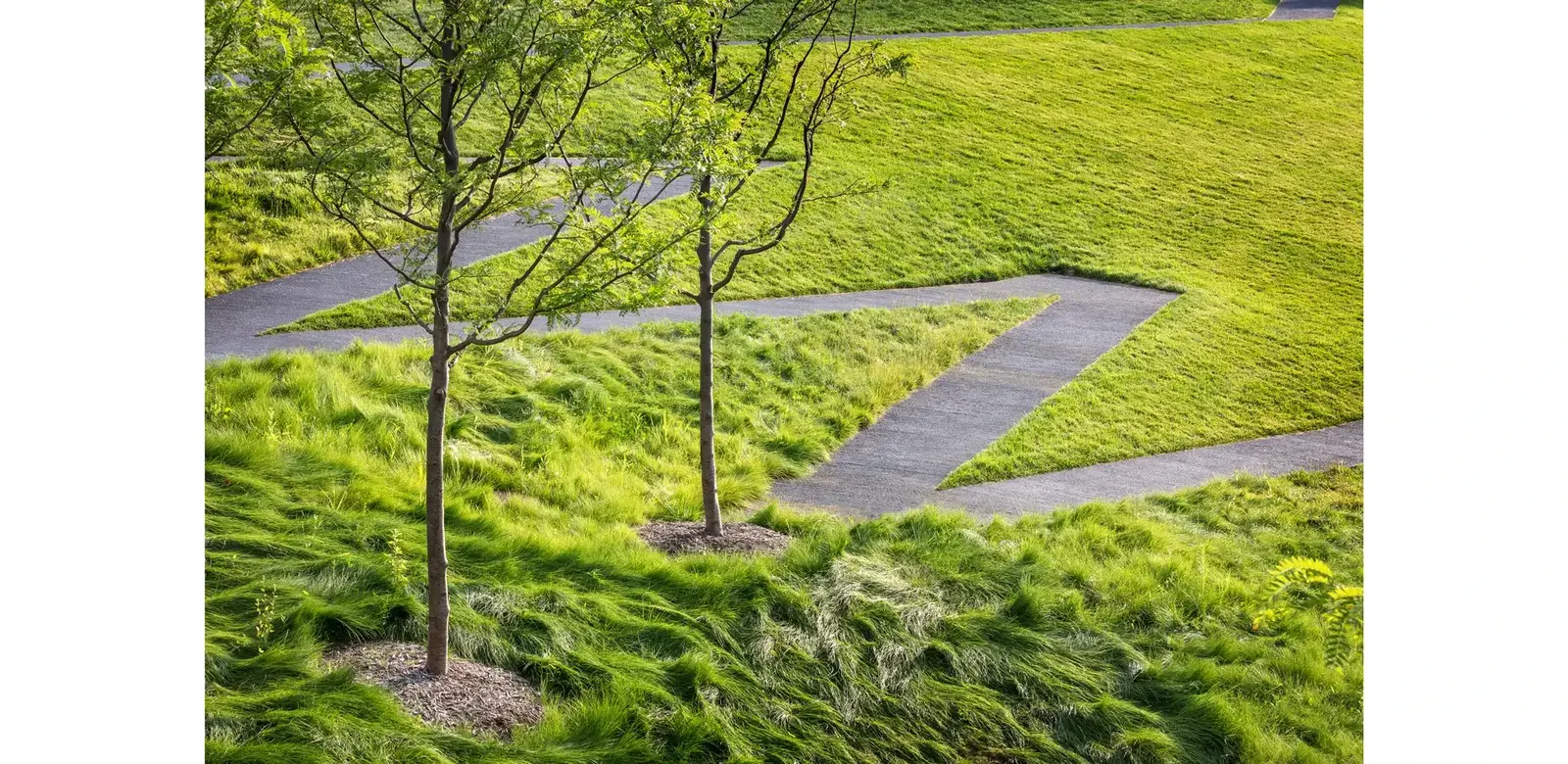 A sinuous, zigzagging accessible walk of raked black concrete connects the garden volumes allowing visitors to wander through the garden appreciating the plants and art while enjoying views to the newly completed sculpture garden and surrounding city.