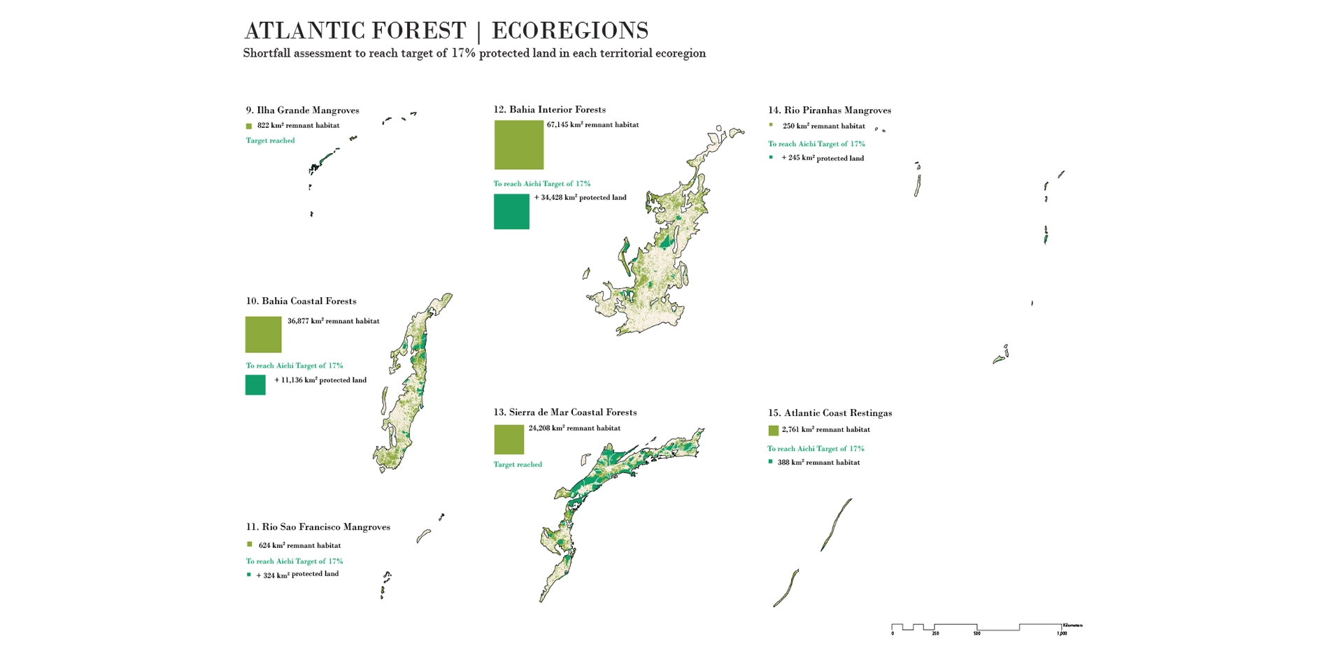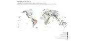 The research found that 21 of 36 hotspots currently fall well short of reaching the CBD's 17% protected area target. In a further and finer grained phase of analysis it was determined that 221 of 391 of the ecoregions which constitute the world's hotspots also fall well short of meeting the 17% target. As shown in the accompanying illustrations, our mapping shows how much additional land needs to be protected if each hotspot was to reach the 17% target. Similarly, at the ecoregional level the quantities of protected area and remnant habitat are re-drawn as squares at the same scale as the original map in order to clearly demonstrate the additional land area within a given ecoregion that must be protected to meet the target (teal-green), and how much viable habitat remains in which to do so (light green).