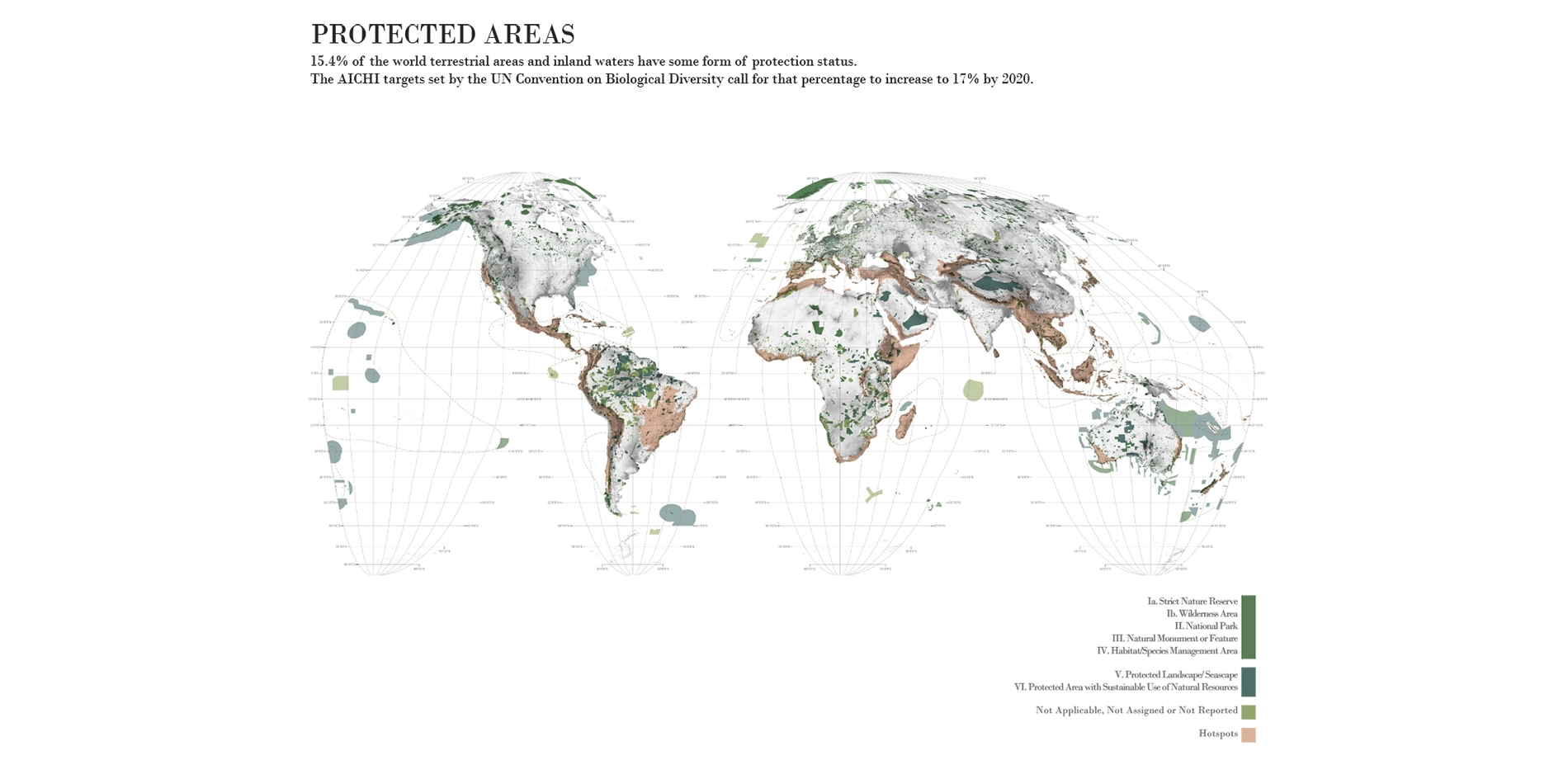Specifically, the Atlas surveys the status of, and conflicts between conservation, land-use and urban growth in the world's 36 biodiversity hotspots - regions which by definition harbor the most threatened and unique biodiversity on earth. It does this by comparing the quantity of protected area in the hotspots against the global target of 17% as set by the Convention of Biological Diversity (CBD) and to which 196 nations are signatory.