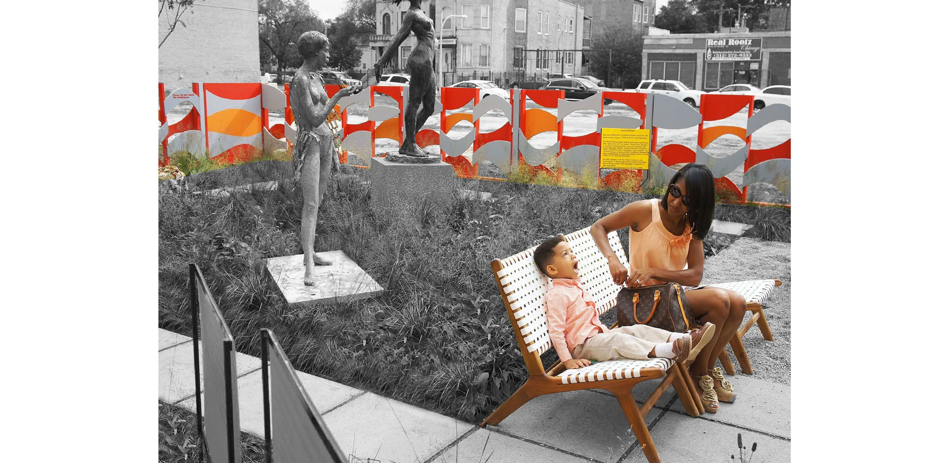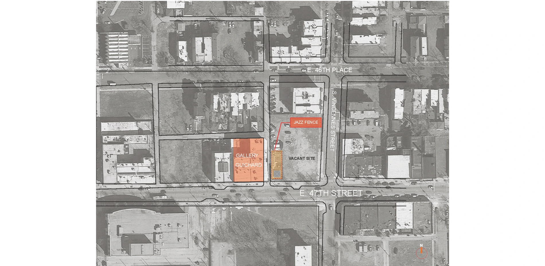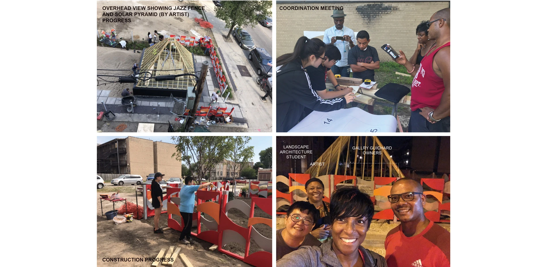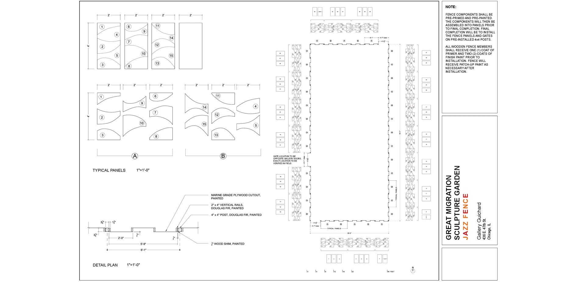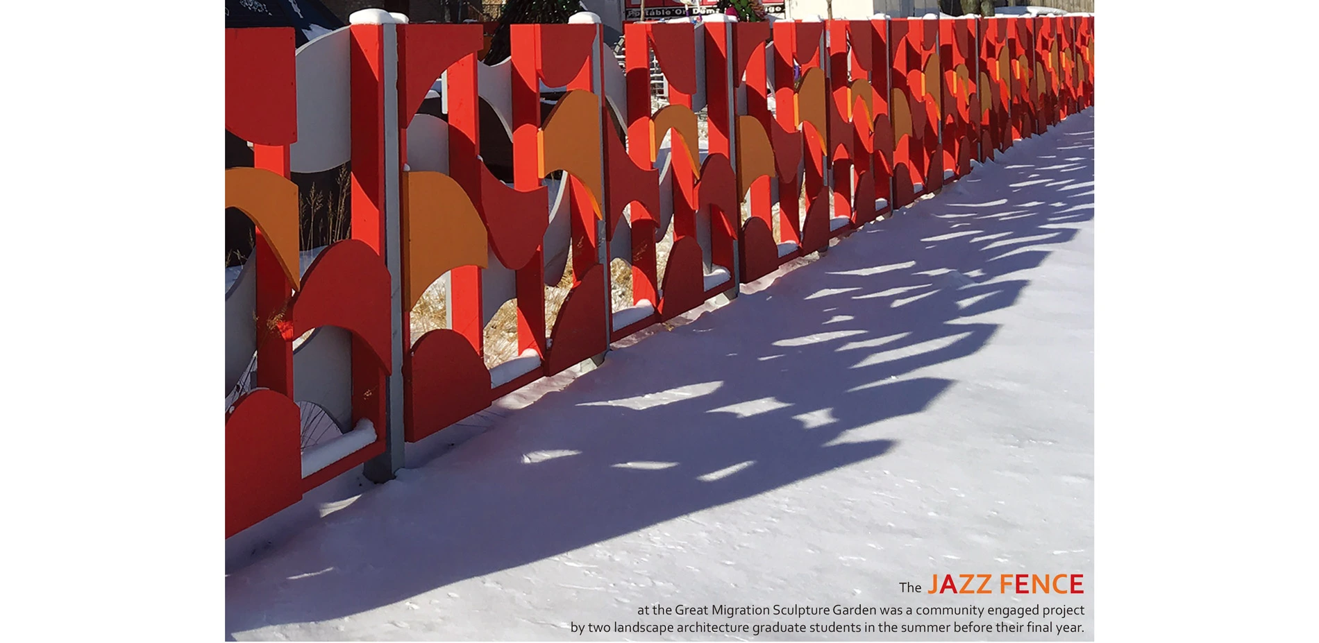Jazz Fence encloses the Bronzeville neighborhood's new Great Migration Sculpture Garden and was designed and built by two students of Landscape Architecture in collaboration with community leaders, construction trades, neighborhood youth, and professional advisers. Jazz Fence was a design investigation of shadows, geometry, and color to augment the sculptural program of the garden which was constructed on a surplus site donated by the City of Chicago to the city's southside Bronzeville neighborhood.