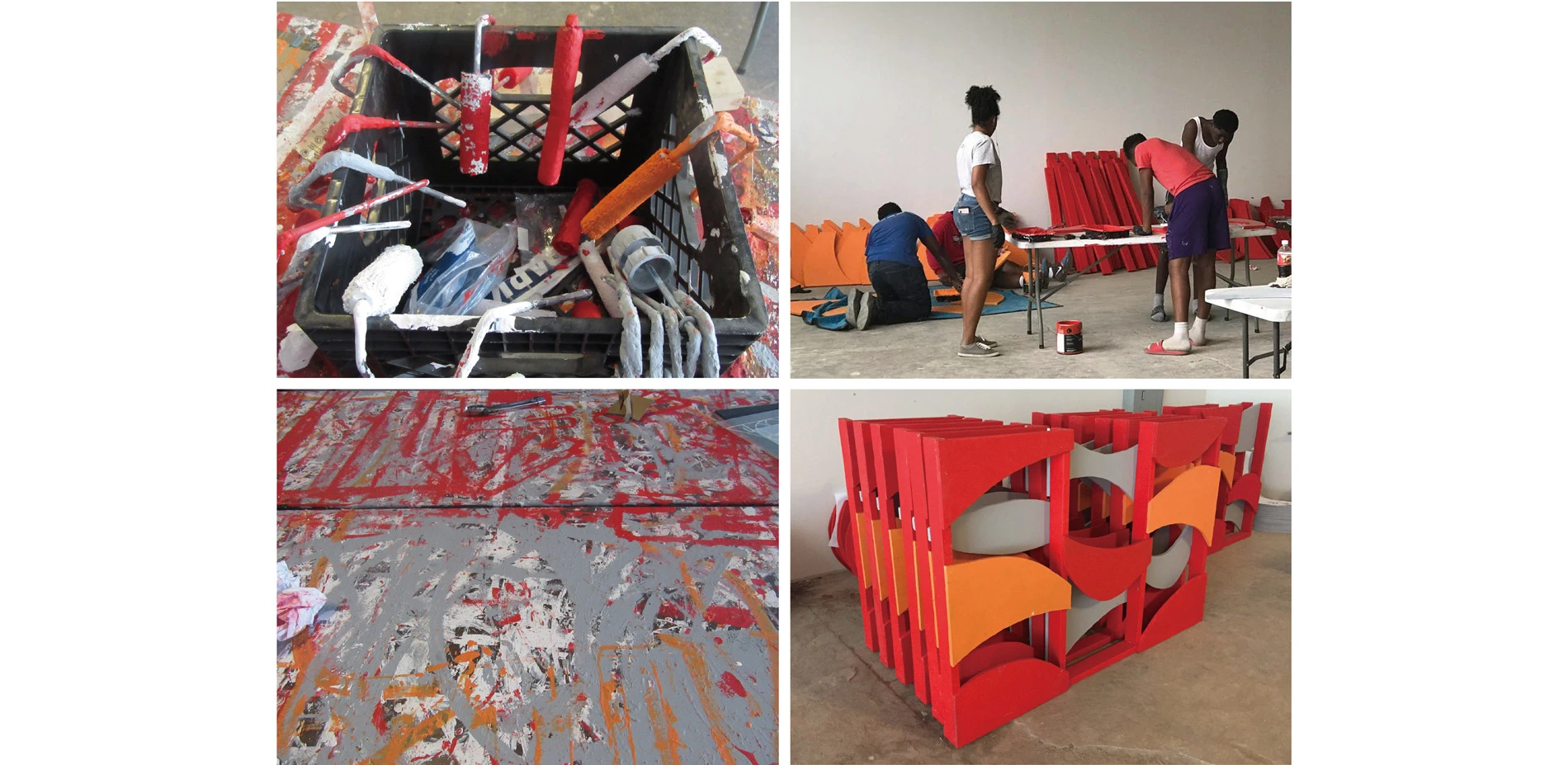 At this time, the fence was all one color - a light gray. The students developed a series of color studies giving substantial consideration of both African American culture and the surrounding built environment. There was immediate and unanimous enthusiasm when the students proposed vibrant and joyful colors of orange and red on the outer layer of the fence to amplify the hot colors of adjacent brick buildings. Light gray panels on the inner layer ground the Jazz Fence with the garden sculptures. Geometric shapes were delineated with routers and then these shapes were painted to continue the cutout geometries.