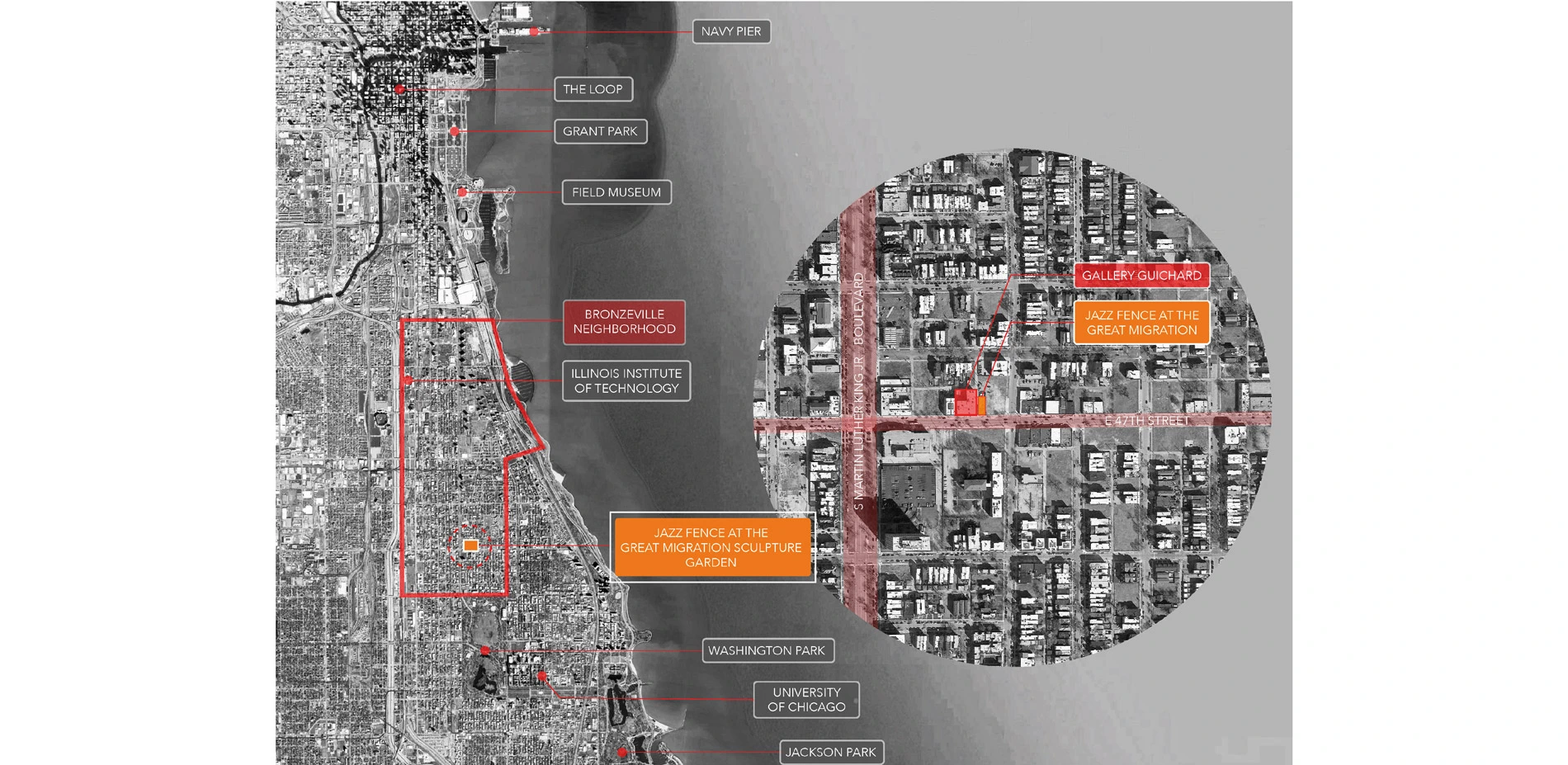 The Great Migration Sculpture Garden commemorates the great migration movement of six million African-American people out of the rural South to the urban North between the years of 1916 and 1970. Many of these millions settled in the Bronzeville neighborhood on Chicago's South Side. In the early 20th century, this neighborhood was known as the "Black Metropolis", one of the most significant concentrations of African-American businesses. The African-Americans also created a new way of bringing their culture and experiences - including influential contributions of jazz, gospel, and blues music - to American and global culture. The Great Migration Sculpture Garden is located on the site of the former Palm Tavern. Howard Reich, art critic for the Chicago Tribune, wrote, "It would be difficult to overestimate the (Palm Tavern's) role in nurturing black musical culture in Chicago and beyond. This was the place where ideas were exchanged, tunes discussed, and collaborations conceived." The Palm Tavern Club was once a hub for African-American musicians in Chicago when the city was dominant in shaping gospel, blues and jazz. The Jazz Fence amplifies this musical history with rhythmic and colorful patterns of cutout shapes that recall, but do not mimic, musical scores.