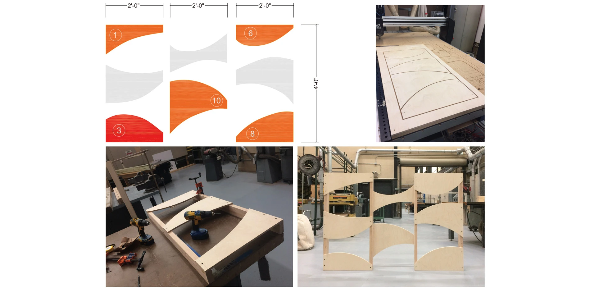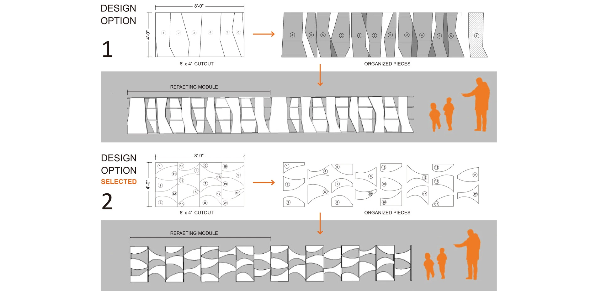 A series of drawings and models produced two options to construct Jazz Fence with a zero-waste strategy of cutout pieces based on 4 feet by 8 feet sheets of marine-grade plywood. Option 1 used straight linear cuts on the table saw with each piece using the entire plywood sheet width of four feet. Option 2 deployed curvilinear cuts on the band saw to produce numerous cutouts at a width of 2 feet which still allowed full use of each plywood sheet. The cutout pieces in both options were organized in two repeating modular panels six feet long and four feet high. The modular panels were then installed on 4x4 wooden posts set in a 2-foot deep hole with a slump footing. After meeting with the community and benefactors, Option 2 was selected for it's musical / rhythmic vitality.