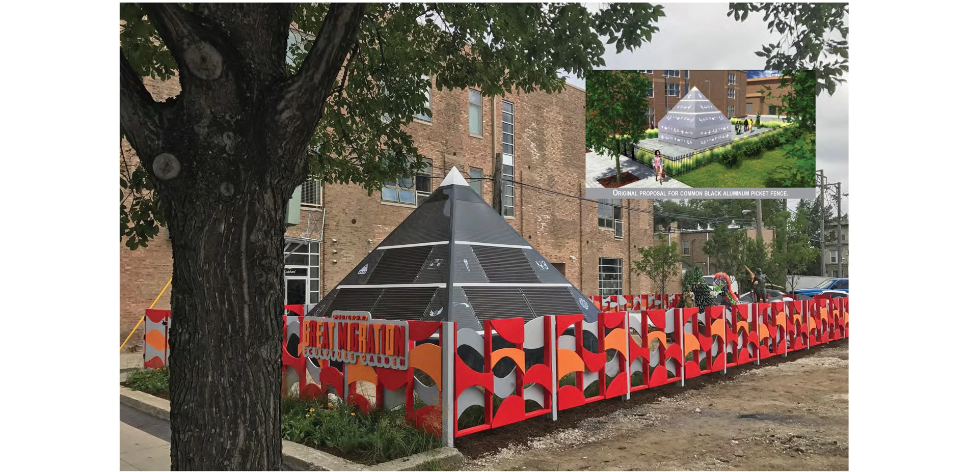 The University was approached by Gallery Guichard and the Purpose Foundation for expertise in landscapes and gardens. This inquiry led to two graduate students contributing their substantial design and construction expertise to re-envisioning the fence that encloses the garden - a fence that was initially a common pre-fabricated black metal fence from a national home supply chain store. The students identified the fence as a significant design opportunity and agreed to assume the responsibility for this highly visible and important part of the Great Migration Sculpture Garden.