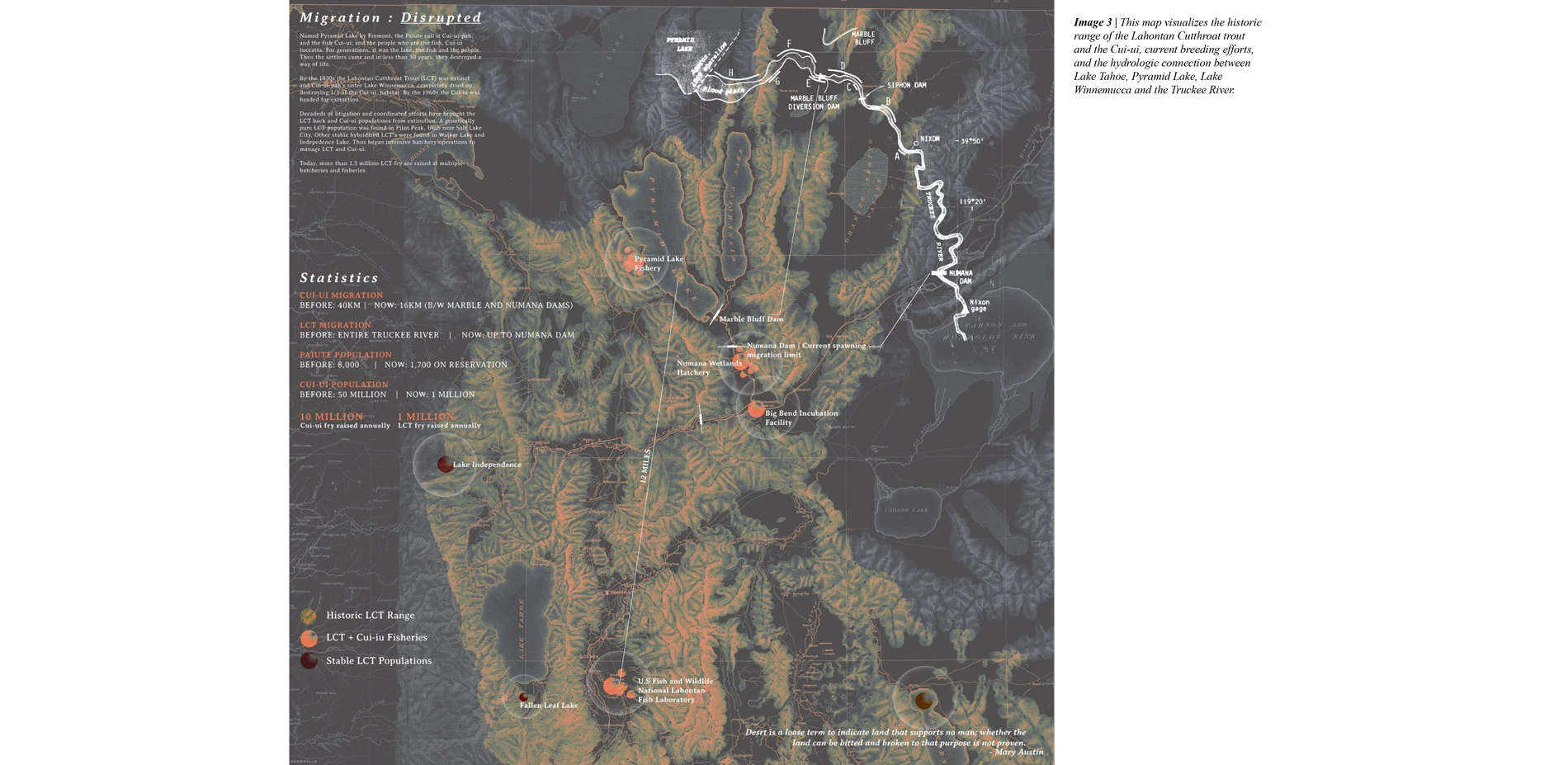 Our goal for Myth, Memory, and Landscape was to use landscape architecture to bridge the symbolic gap between the Pyramid Lake Paiute tribe members ("insiders") and the surrounding communities ("outsiders"). We designed an experiential journey into the Paiute landscape that would teach the outsiders of the catastrophic imbalance in the region and of the consequences in the fight for water.