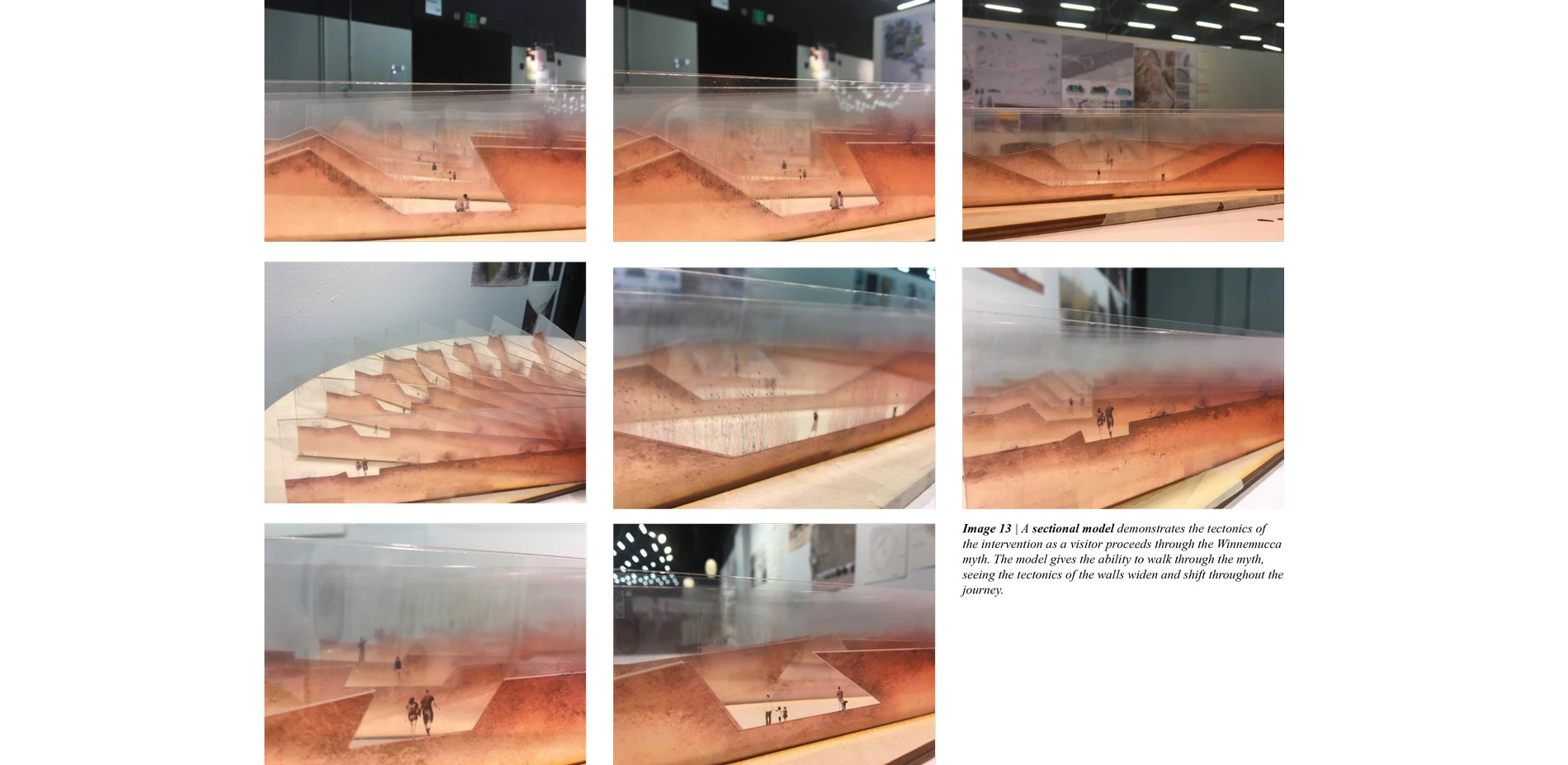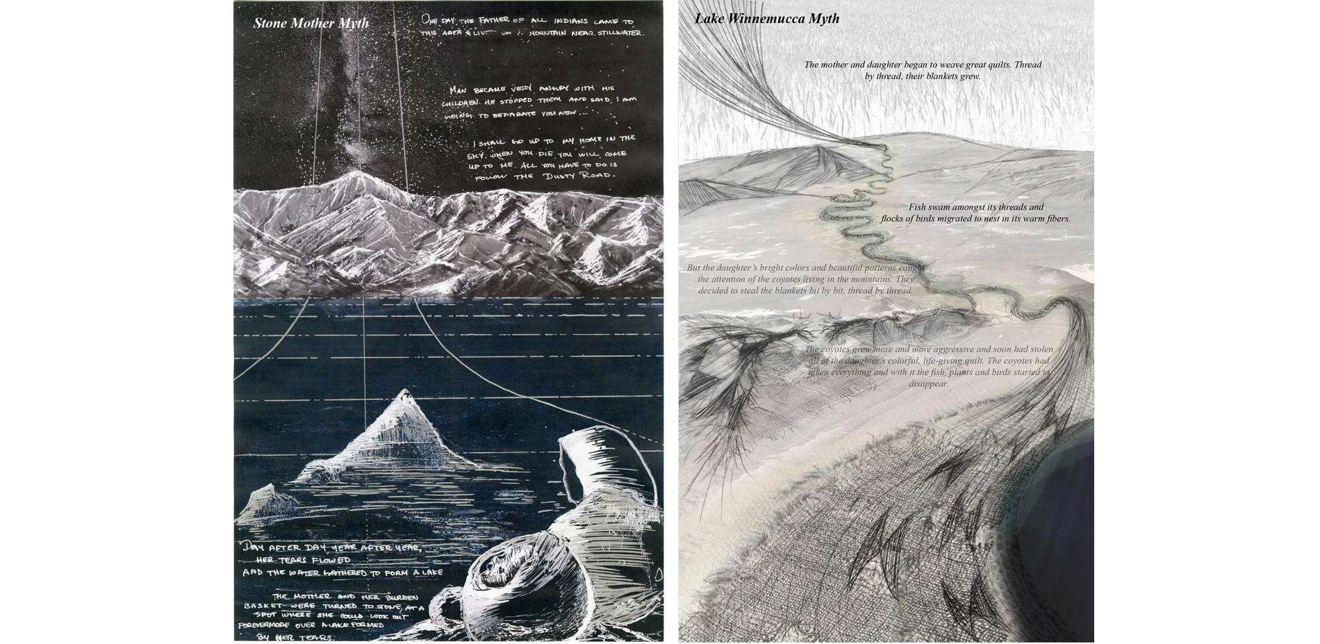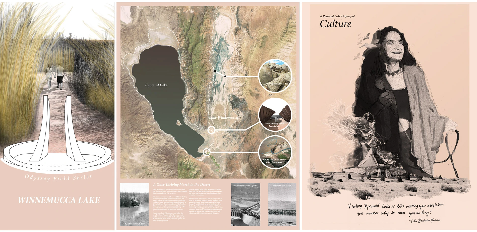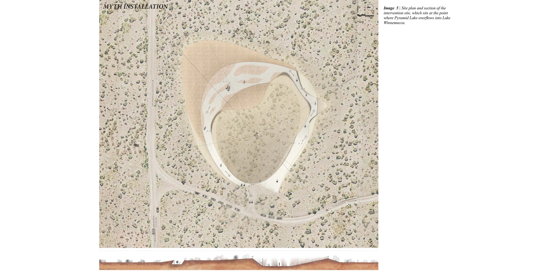 Myth, Memory and Landscape in the Pyramid Lake Paiute Reservation uses Landscape Architecture as an instrument, demonstrating the power of design to transform communities and perspectives in a meaningful way. The Landscape Installation uncovering the story of the untold story of Lake Winemucca is located at the once confluence between Pyramid Lake and Lake Winemucca. This project uncovers new methods for engaging with indigenous culture and hardships when one may not be from that community or shared in an experience. This design proposal provides a means to push the boundaries we have as designers, existing somewhere between the insiders, the Paiute, and the outsider, Reno and non-tribal visitors. From our design perspective, the land's incredible power and scale was not a place for agriculture or production, instead it held a mysticism and calm reverence, and this aspect drove the design program. Our program uses landform to manifest a new myth that engages the outsiders, encouraging them to journey into the landscape and discover the Paiute's rich history and immense struggle to this day.