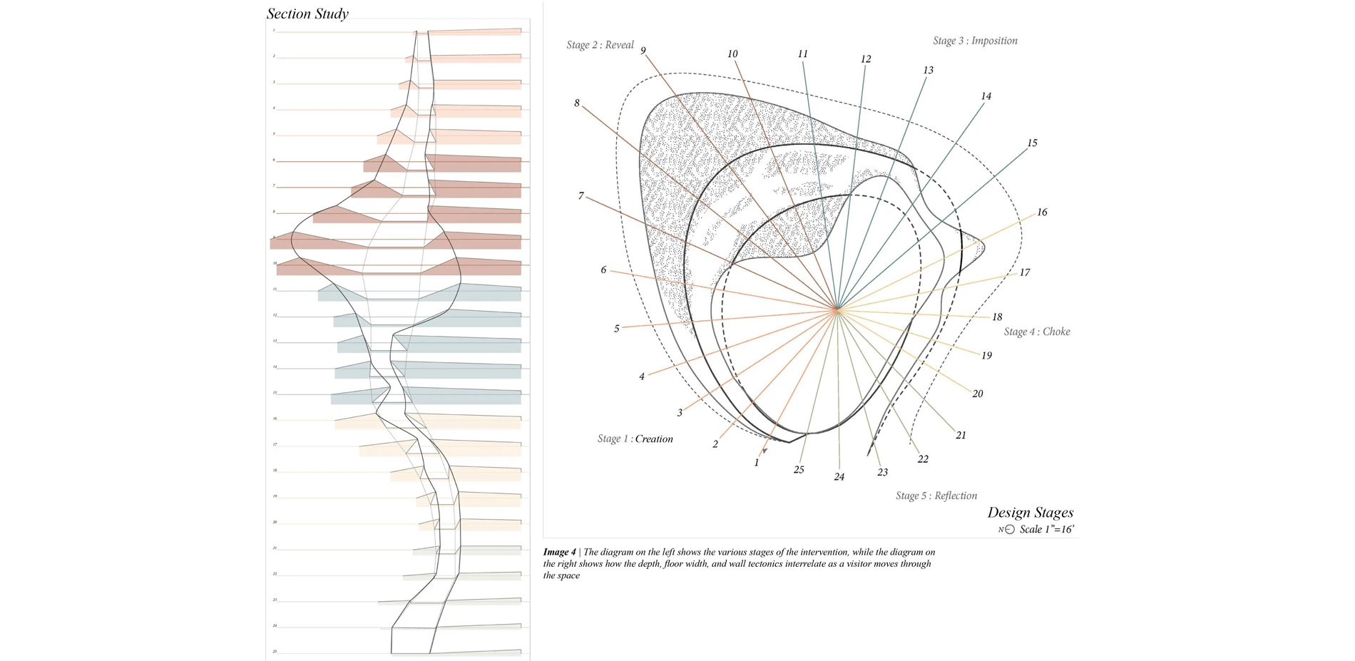 The procession through the landscape is circular, because of the shape's significance to the tribe, but also because it symbolizes the ability to repeat this tumultuous history if the cycle is not broken. The circular form is disrupted, pushed, and pulled by the axial relationships to key Paiute landmarks, aligning the form with the five stages of the "Winnemucca" myth.