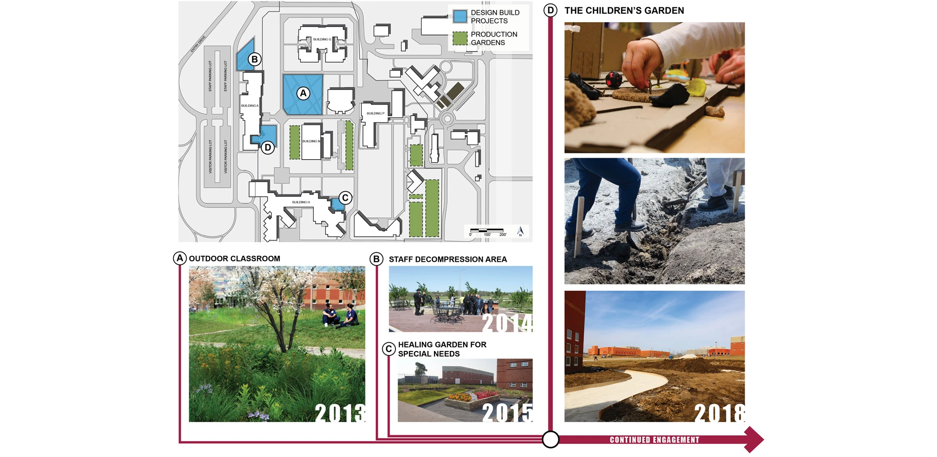 Design students from our University have been collaborating with the Iowa Department of Corrections since 2011, addressing landscape interventions at the Mitchellville facility. The Children's Garden is the fourth design-build project completed at ICIW. The project explores how spatial design and programming can affect prison populations, including incarcerated individuals, their children, families, visitors and correctional staff. Using design strategies supported by theories such as biophilia and the Kaplans' model of environmental preference, the student team sought to educate the community on the benefits of building a children's garden in a prison.