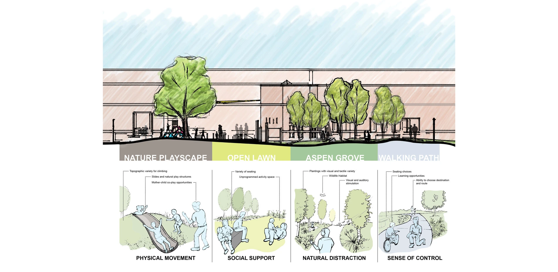 Theories from other fields of practice were adapted to the project to better understand the prison environment. For example, we applied therapeutic garden design principles typically employed in healthcare settings while maintaining sightlines for security. As humans have an innate attraction to the natural world and need contact with natural features for survival, biophilic design principles were also applied to the site with psychological stress in mind. The children's garden provides pockets of native vegetation that attract birds and butterflies, mimicking the native Iowa landscape. As the mothers and their children can experience stress in this environment, we applied principles from environmental psychology such as Roger Ulrich's Stress Reduction Theory to program outdoor spaces inclusive of all ages. The stress reduction theory emphasizes four factors that help in reducing stress: (1) a sense of control, (2) social support, (3) physical movement and (4) positive natural distractions. These factors were directly applied to the site in the form of a walking path, an open lawn, a playscape and a grove of aspen trees. To design spaces that were inclusive of all ages, we employed the landscape preference theory where people prefer a landscape that invites exploration without the fear of getting lost. The "conversation grove" employs the prospect-refuge theory to provide opportunities for perceived security and sense of control by creating pockets of refuge composed of aspen trees. This space evokes a sense of security necessary for healthy psychological functioning; it is critical to have access to spaces that enables people to be able to see without being seen. The ambient noise from the rustling aspen leaves offers a natural distraction and allows for more personal conversations.