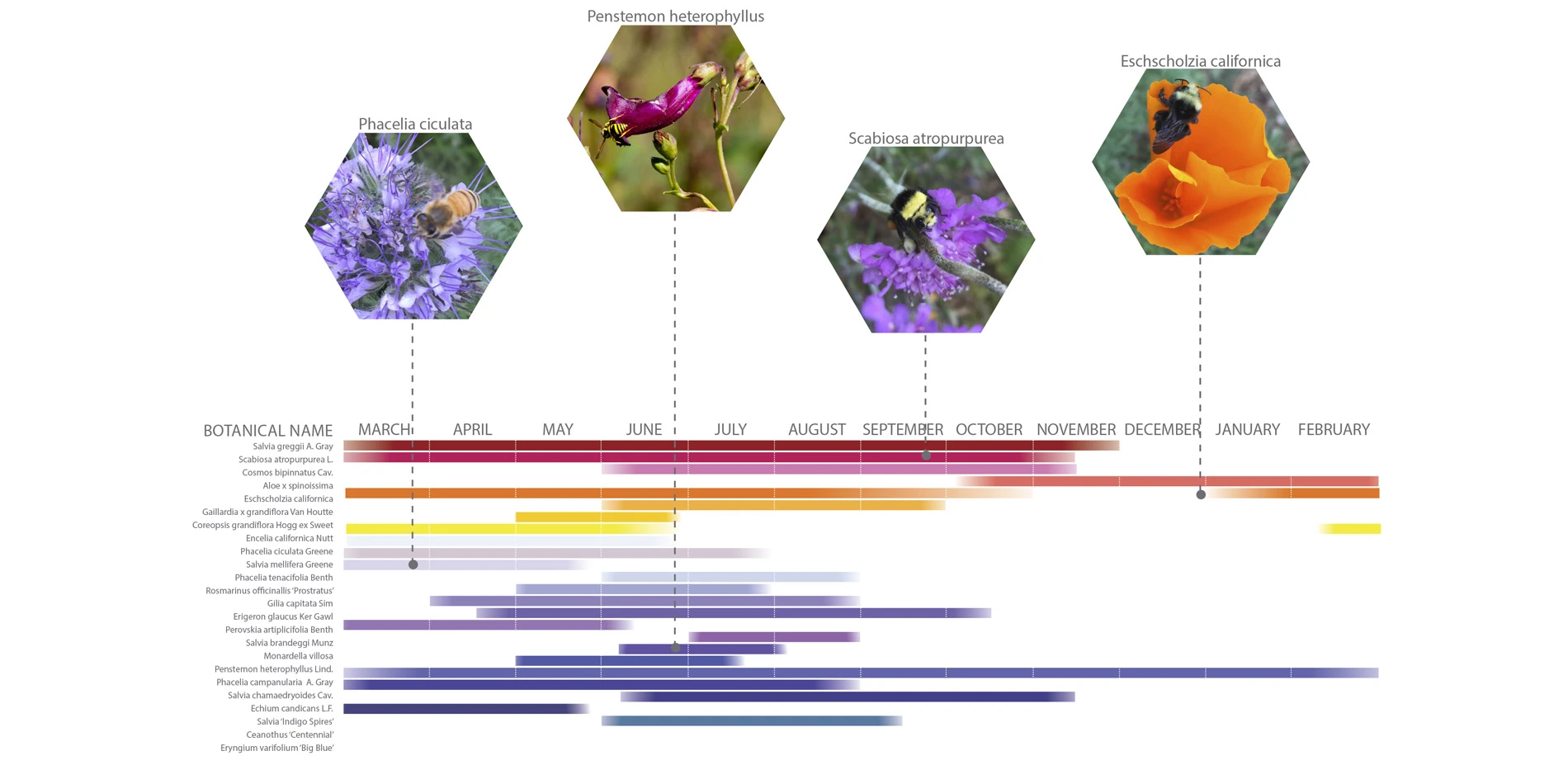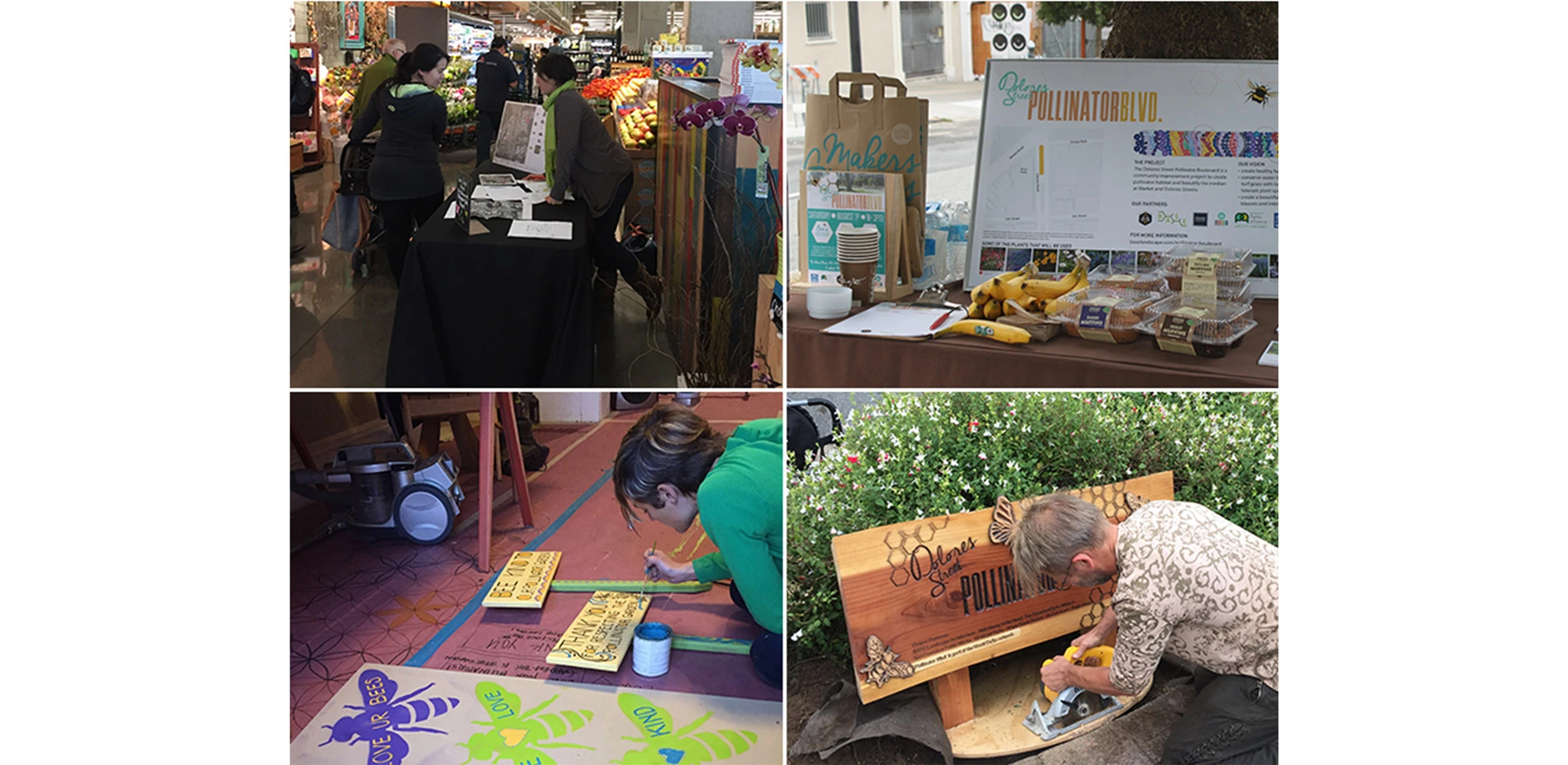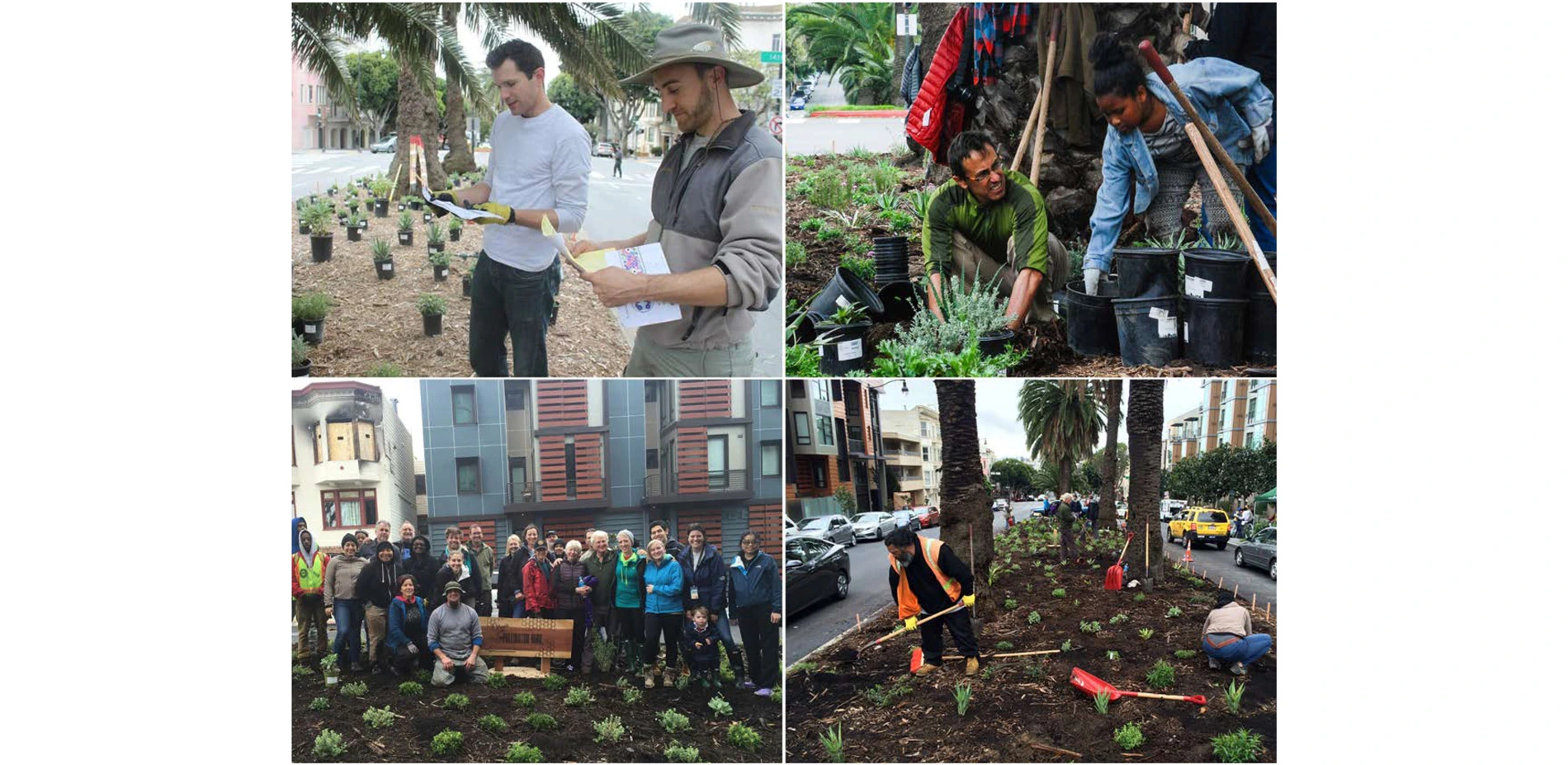 Planting designs took into account an expectation of limited maintenance. Thus, native plants and those with minimal water needs were used as much as possible. Selections were made based on optimal bloom periods to ensure a continuous flow of nectar as well as hardiness to roadside conditions and overall aesthetic merit. Plants were purchased using funds received from a Community Challenge Grant from the City of San Francisco. Care was taken to source from nurseries that do not treat their plants with systemic pesticides, chemicals that are lethal to pollinators. A local carpenter and artist made a beautiful sign to mark the entrance of the Boulevard and raise awareness to passersby.