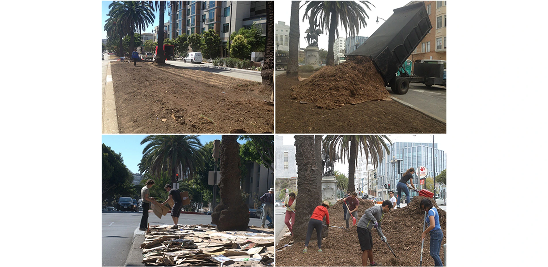 From there out, we developed a framework and simple phasing process that can be replicated as we continue to extend the gardens down the street. The phasing begins with the removal of existing turf, followed by sheet mulching. This is a permaculture technique used to suppress weeds and build soil health, which involves laying down thick layers of recycled cardboard topped with one foot of organic mulch. After a minimal 6 month decomposition period, the planting design can be installed directly into the newly amended soil with ease by crews of local volunteers on organized workdays.