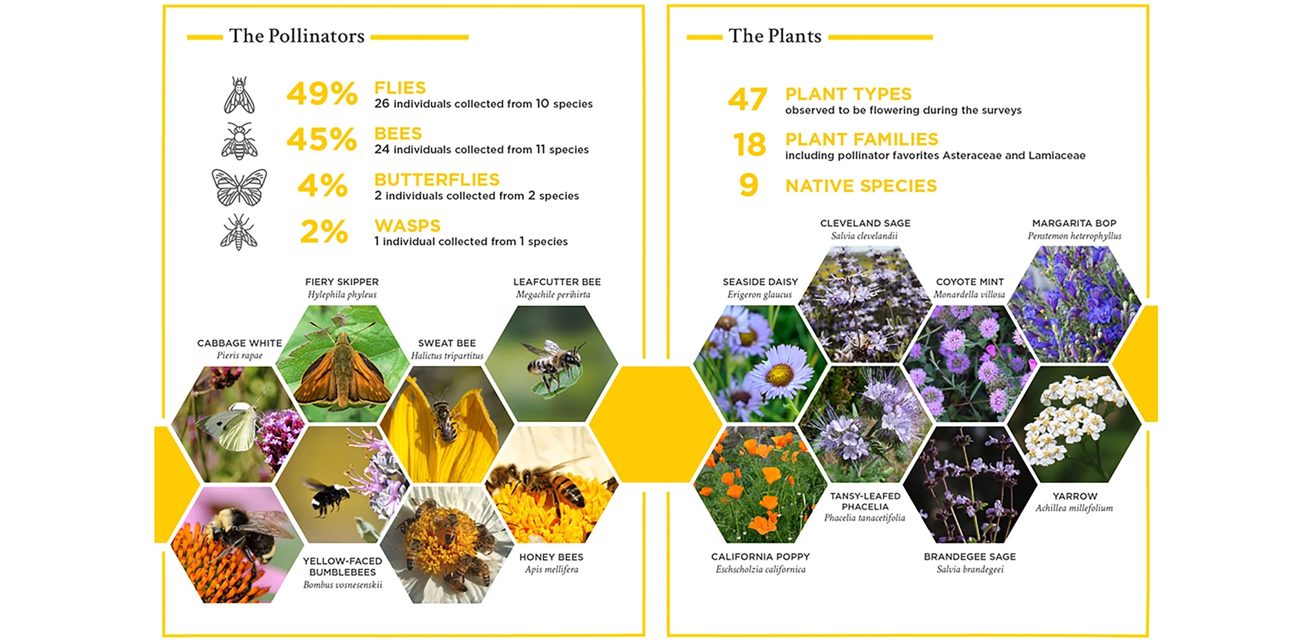 The improvements brought about by the Pollinator Boulevard have been confirmed not only anecdotally, but also in rigorous studies of soil conditions and pollinator counts. In May of 2017, soil samples were collected from the first median, which had been planted one year prior, the second median, which had been sheet-mulched six months prior, and the third median which had not been worked on at all by our team. The results we received from the lab showed that organic matter content was at significantly higher levels on the planted medians than those untouched. Additionally, pollinator surveys focusing on native bees but also accounting for butterflies, flies, and wasps, were conducted by a UC Berkeley entomology specialist in the Spring, Summer, and Fall of 2017. Using pan trapping and net collection methods, we found 11 native bee species and other pollinators visiting the gardens throughout the year compared with one bee on an adjacent turf median. Hummingbirds and other bird species have been observed on every site visit.