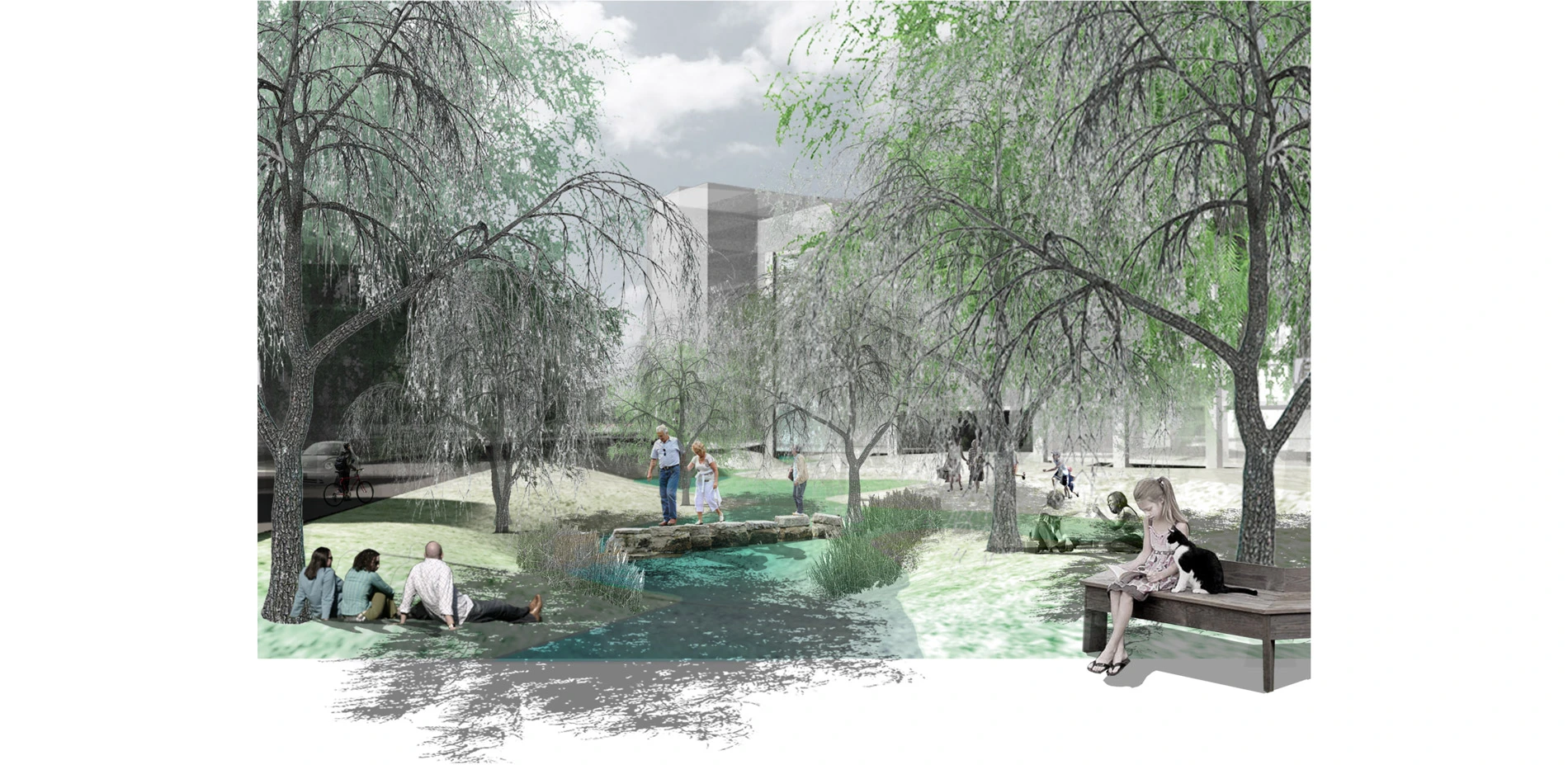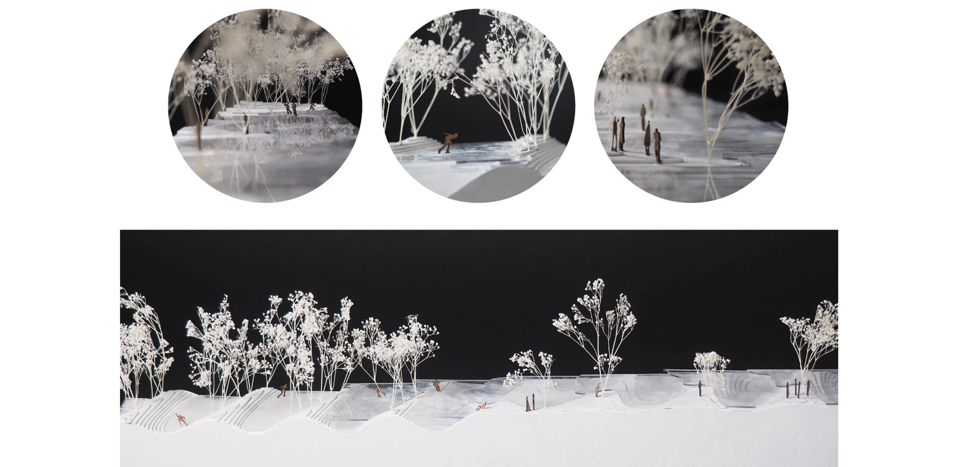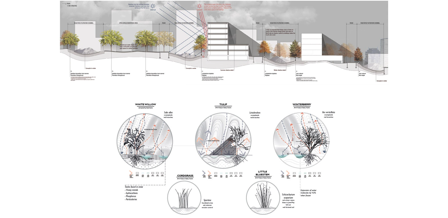 Once melted, snow water feeds private garden bioswales that filter and infiltrate melt. Snow will travel to and through the Reserve Channel by winding amongst residential buildings and landscapes. Along the way, toxins will be filtered by plants such as white willow (Salix alba) and winterberry (Ilex verticillate). Stabilizing species including cordgrass (Spartina) and summer sweet (Clethra alnifolia) address erosion prompted by snow melt. Snowmelt will replenish springtime grasses and reveal slopes in the undulating topography for recreation and relaxation. Perched above the bioswales, residential decking provides common space and views of green corridors at the [RESERVE]. Upkeep of these thaw zones will be a regular component of the filtration process at the [RESERVE], as snow ploughs pick up street debris.