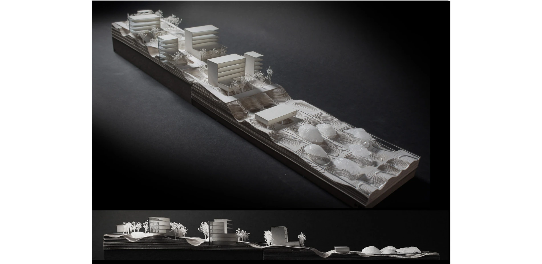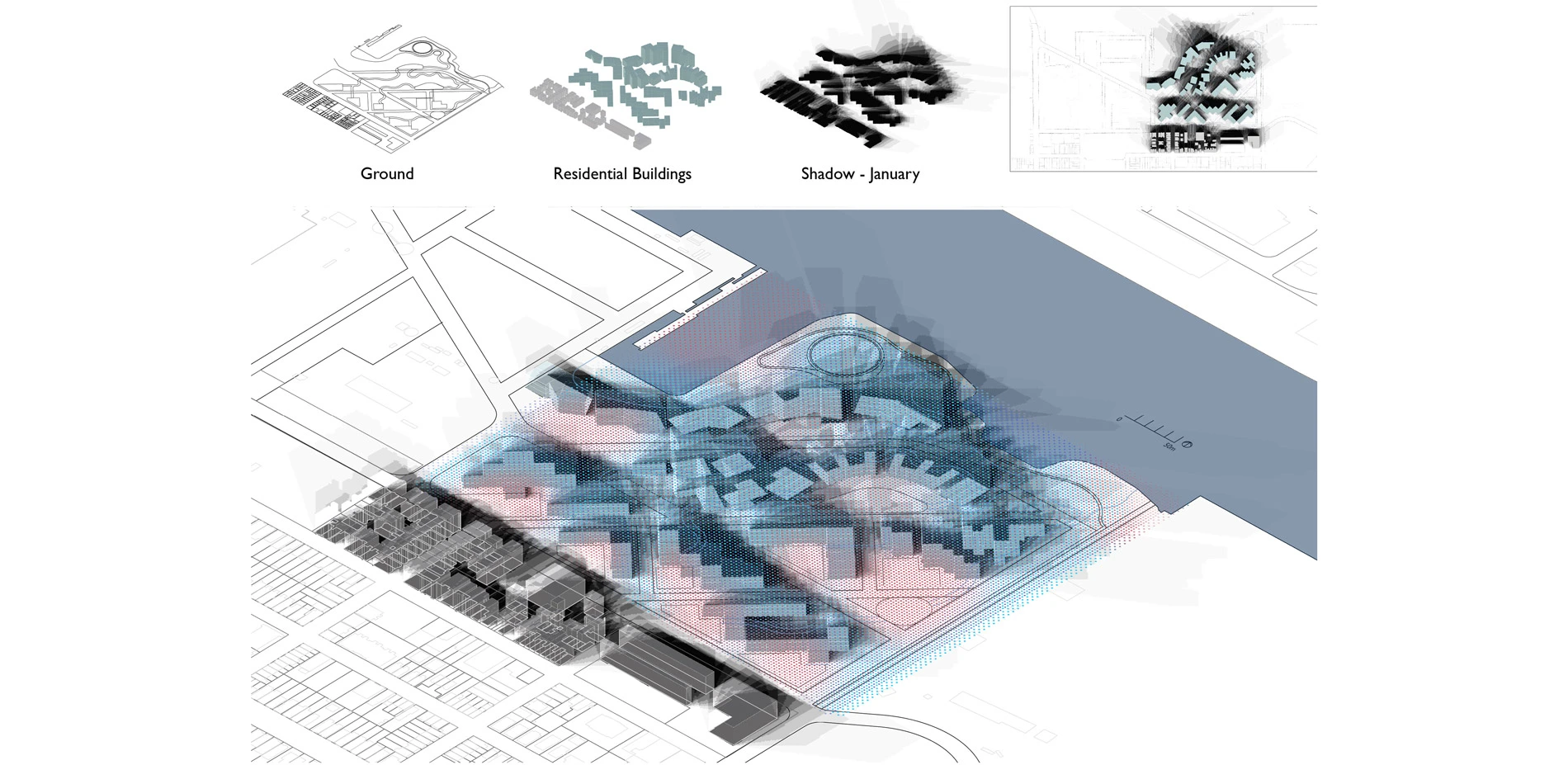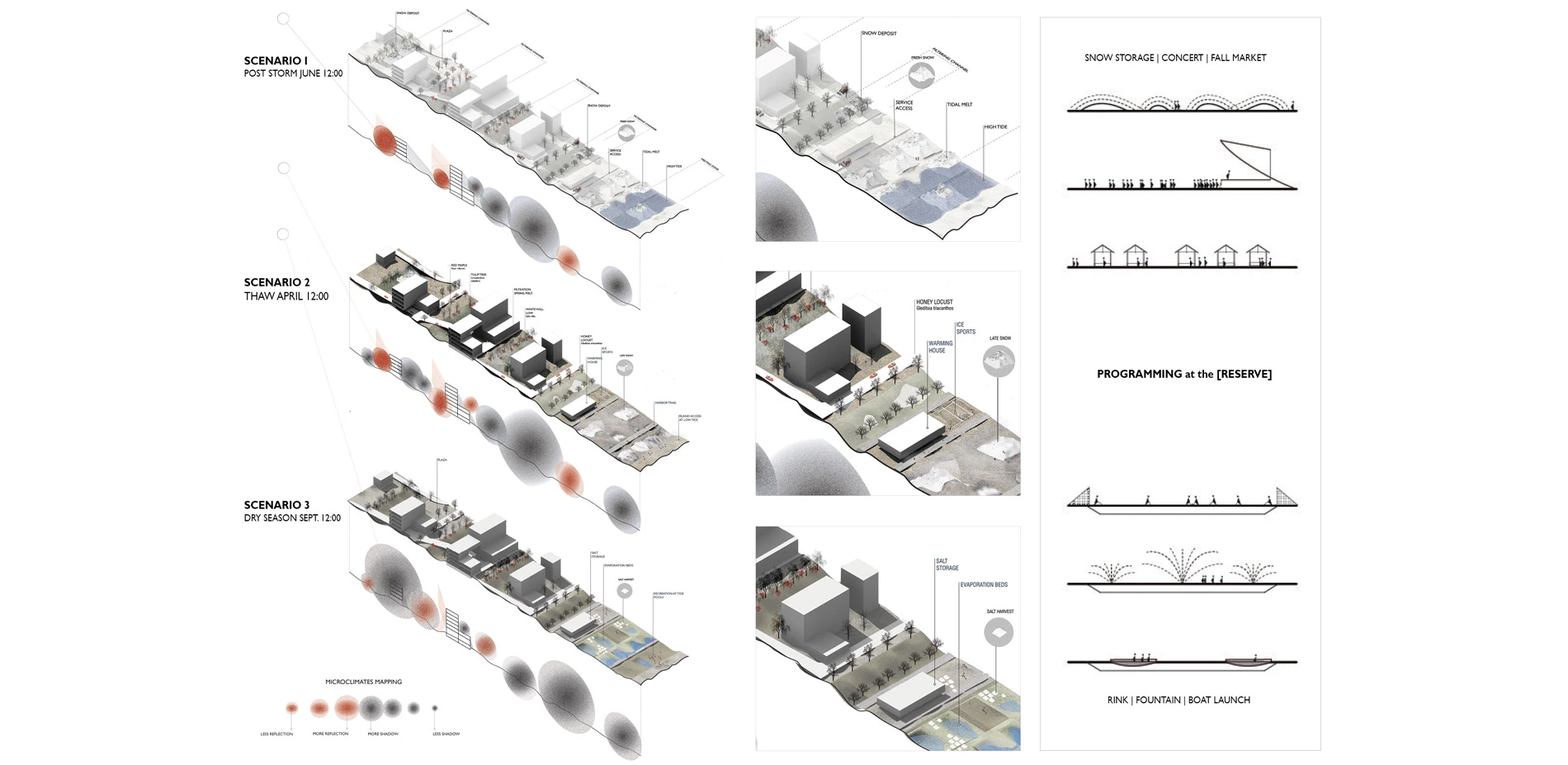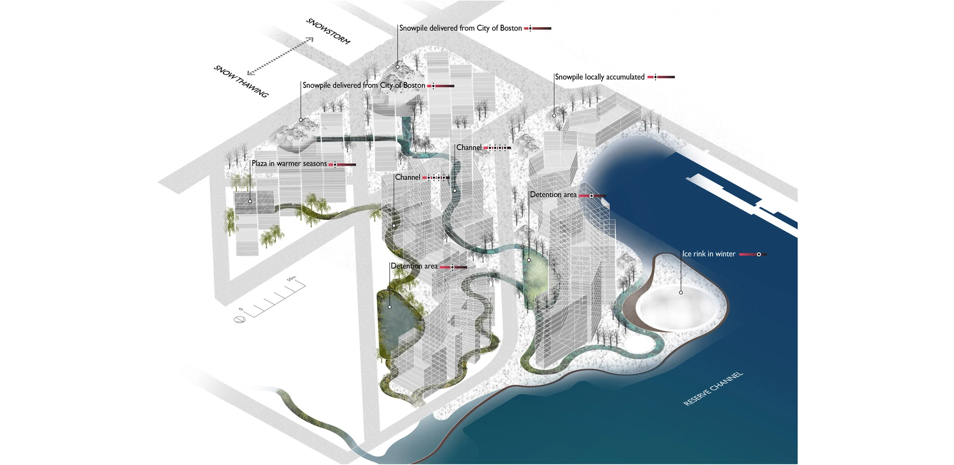 Microclimate control is the organizing force at the [RESERVE]. The neighborhood absorbs snow collected throughout South Boston and leverages melt to create vibrant landscape experiences. The journey from snow fields through an undulating topography filters contaminants from snow to sea. Microclimates are formed through dynamic relationships between residential buildings and landscape elements. Shadows and reflections are synchronized with residential design, plantings and seasonal programming. Foliage, ice formation, and snow accumulation register the thermal dimensions of microclimate "rooms". Snow, once a public burden, is redefined as a dynamic shared community resource that enriches residential life around Boston's Reserve Channel.