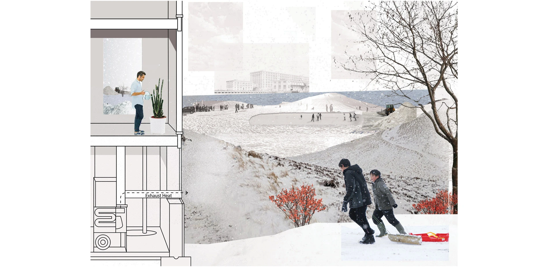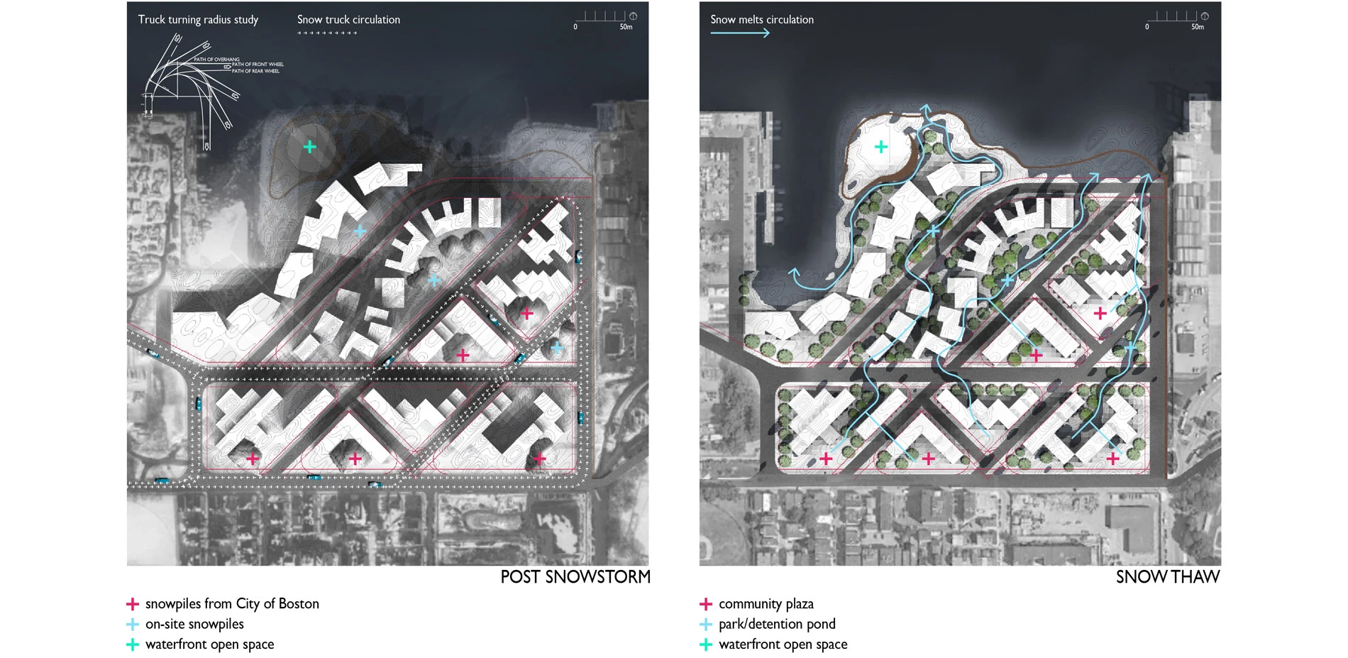 The past decade has been the hottest on record in the Northeastern United States, and climate change is associated with increases in both evaporation and precipitation. Boston is not only getting hotter during summer months, in the winter the city is increasingly overwhelmed with snow. This proposal envisions a new performance in residential microclimate design that improves on snow hydrology strategies of the past.