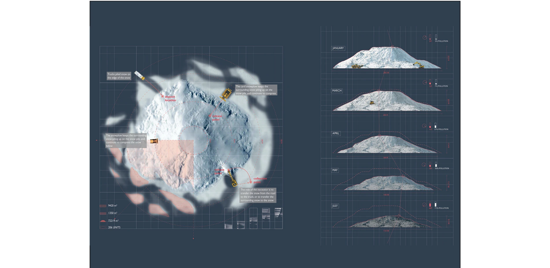 The proposed neighborhood is situated at the nexus between urban snow and the sea. Undulating topography creates, on one scale, individual carved spaces with slopes for sports programming and informal recreational use. Together these landforms are instruments graded to process the snow and offer a distinct atmosphere and purpose to the neighborhood.