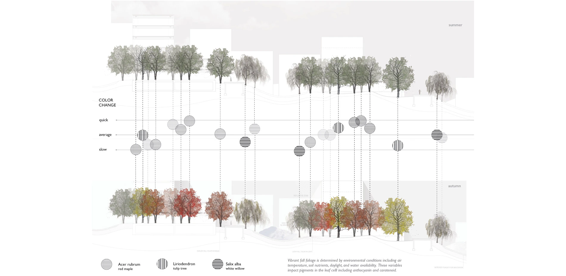 The coloring of fall foliage registers microclimate differences generated by shadow and reflections. Each microclimate zone keep pace with its own seasonal rhythm. Maintaining relatively colder zones will allow for species in Boston's hardiness zone (6b) to continue surviving despite climate change. This includes at-risk plantings such as paper birch.