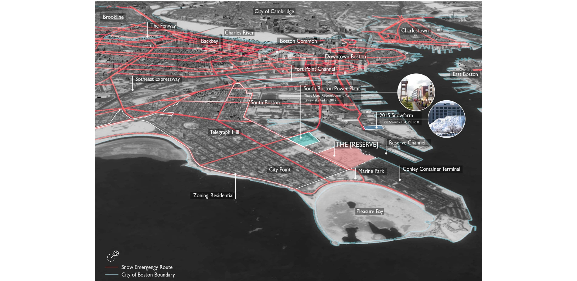 The [RESERVE] is a harborside residential community proposed for South Boston's Reserve Channel. Private residential property lines are not a central organizing feature at the [RESERVE]. Rather, the neighborhood is shared with Boston Public Works and is designed to support urban snowmelt and a dynamic landscape that generates a sense of community, a source of income and a service to the city of Boston. Life at the [RESERVE] nurtures community spirit and adaptation to intensifying snowstorms.