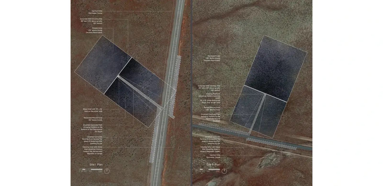 Our design proposes two installations to engage ERDF through methods not employed by the DOE. Site I and Site II each replicate the dimensions of a single ERDF cell and place it adjacent to roads running along Hanford's boundaries. Half of each site will excavate 60' down, and the other half uses excavated soil to lift the topography 20' above grade with a concrete wall bisecting the cut/fill operation. Visitors to Site I descend to the bottom of the wall and at Site II they may walk to the top. Embedded within the concrete wall at each site is a glass chamber devoid of anything, including waste. Site I is oriented towards the Democratic Republic of Congo, where significant portions of uranium were mined for weapons (Alvarez, 2016), Site II points to Nagasaki, Japan, where Hanford's plutonium was used to end World War II. Through these orientations, each site connects visitors to global sites of extraction and deposition that have resulted in destruction far greater than what is immediately visible.