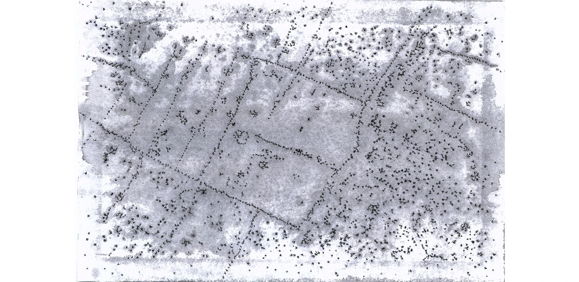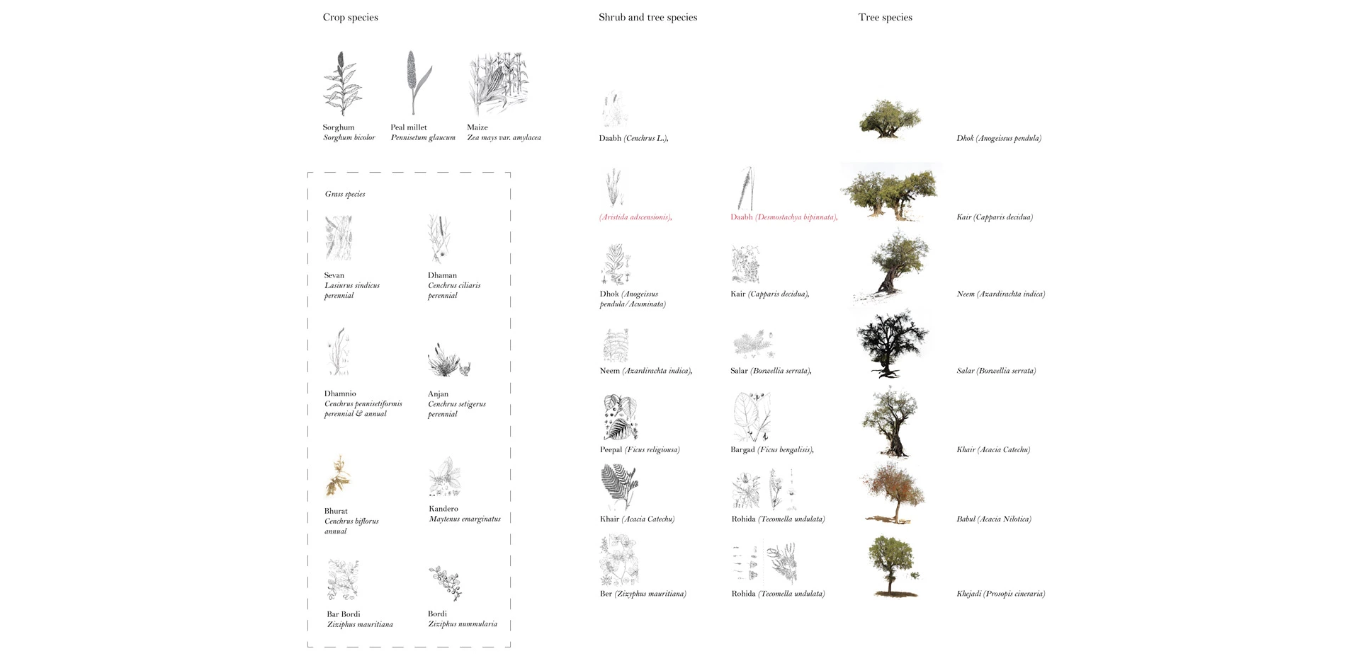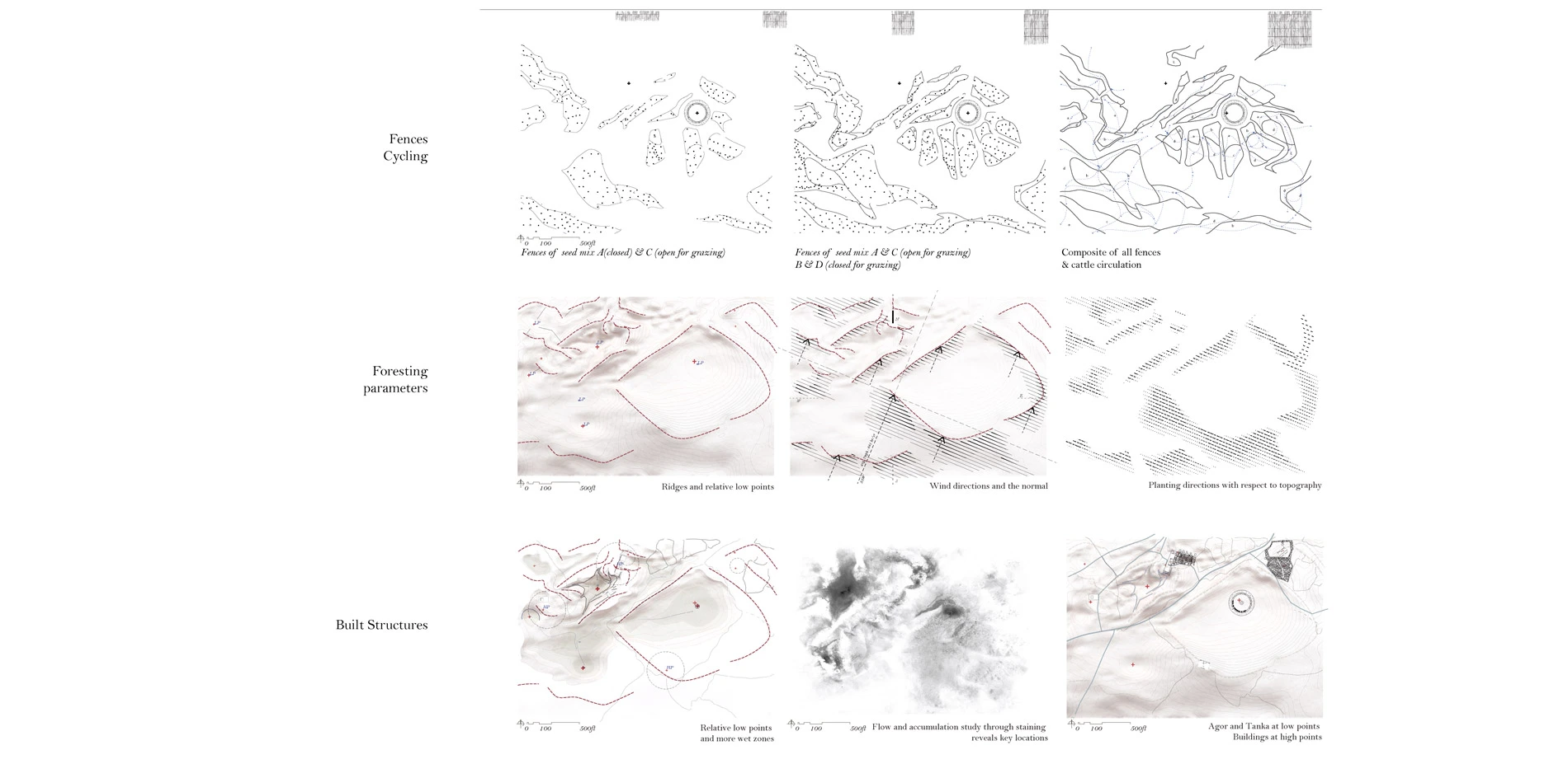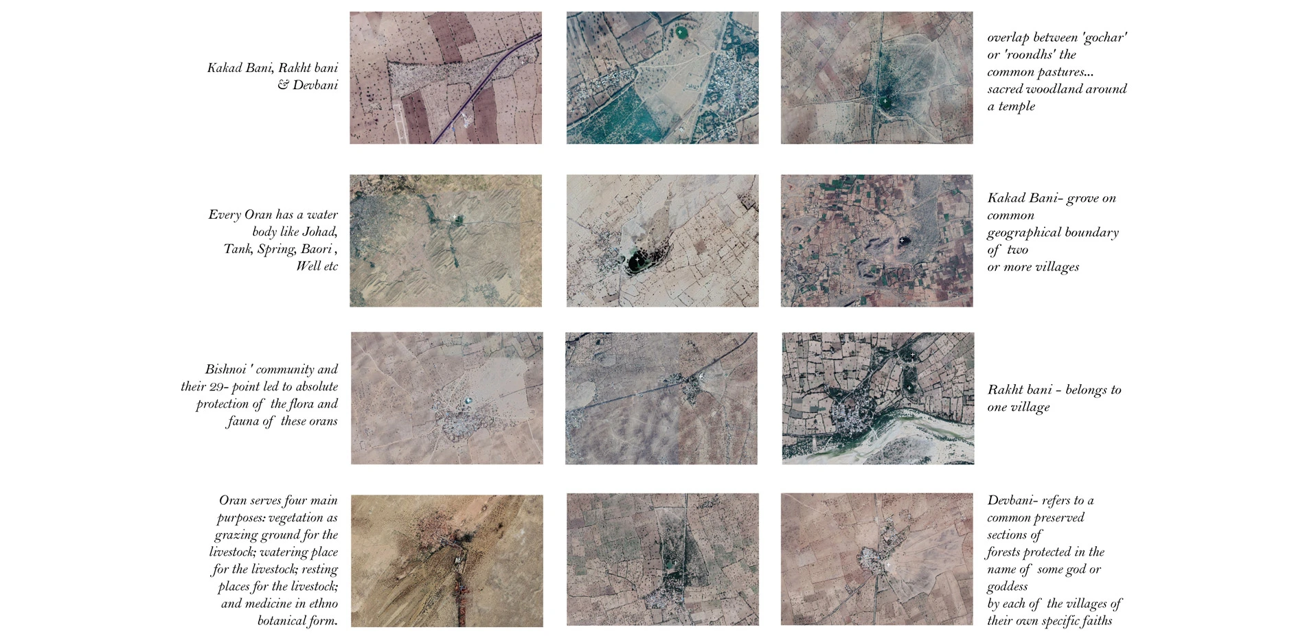 The revelation of Oran started with a method of exploration through staining, by looking for imprints of wetness from satellite images. These stains helped to identify marks of vegetation thresholds, fences, clustering of plants in windward side of hills, accumulation of wetness through water tanks and water holes. The stains started to recognize a certain pattern of vegetation clustering and accumulation of humidity, which led to the re-discovery of the Oran. Understanding Oran was the integral in the earlier stages, which showed how a traditional forestation, not designed by any professional can become a sustainable practice for surrounding communities and as well as ecologies to grow.