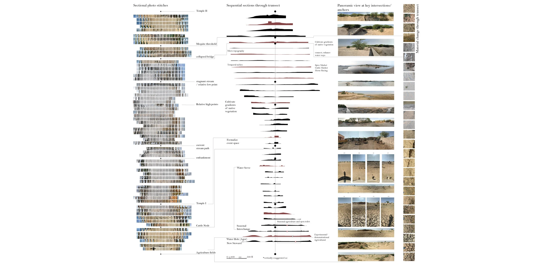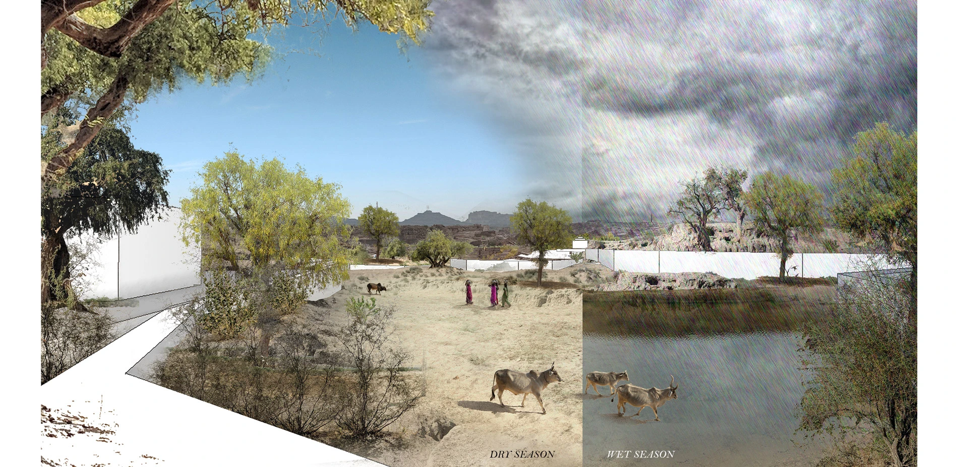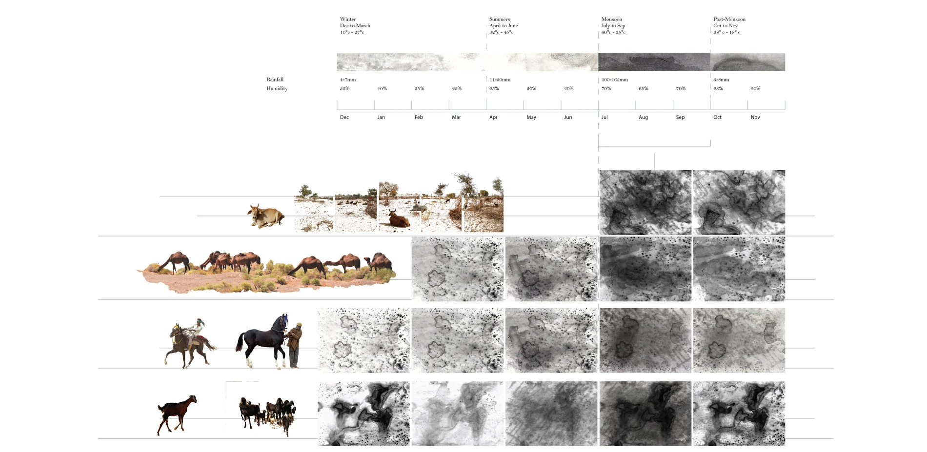 India, a country rapidly moving toward contemporary aspiration of urban livelihood. Looking down upon their thousand years old traditions, which are considered as signs of backwardness, where as some of these practices are well complied with contemporary world. This project tries to extract one of these neglected and unknown practices in the desert of Rajasthan, called "Oran" –a system of settling around a multipurpose forest and maintaining it through generations. The method of extraction tried to break the dichotomy of traditional representation of looking at a dessert but opened the conversation and revealed the project when looked at it as imprints of wetness. The design project revolves around the idea of An enhancement of traditional Diverse ecological system as a Performative Landscape. The project is unique in its exploration method. It engages the unknown terrain of the Thar desert and a performative Landscape of the Oran, through a new lens of embodied wetness.